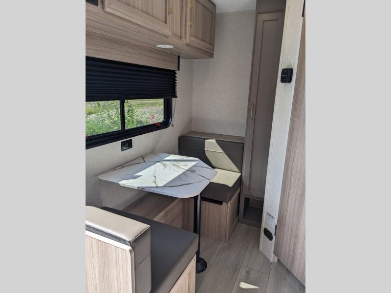 This cozy travel trailer with a front full bed is sure to feel just like home. There is a private bath with a shower and toilet so won't have to use the camp's facilities, and a booth dinette provides dining and additional sleeping space for one adult or two small children. The two burner cooktop and microwave oven will let you make meals each day, and there is a refrigerator to keep perishables fresh. When you're ready for some fresh air, grab your hiking gear from the exterior trunk door and head for the trails!