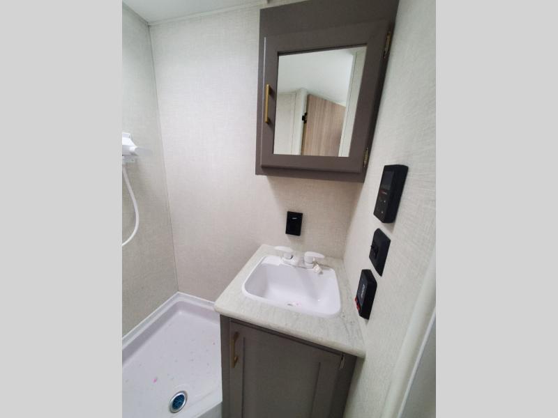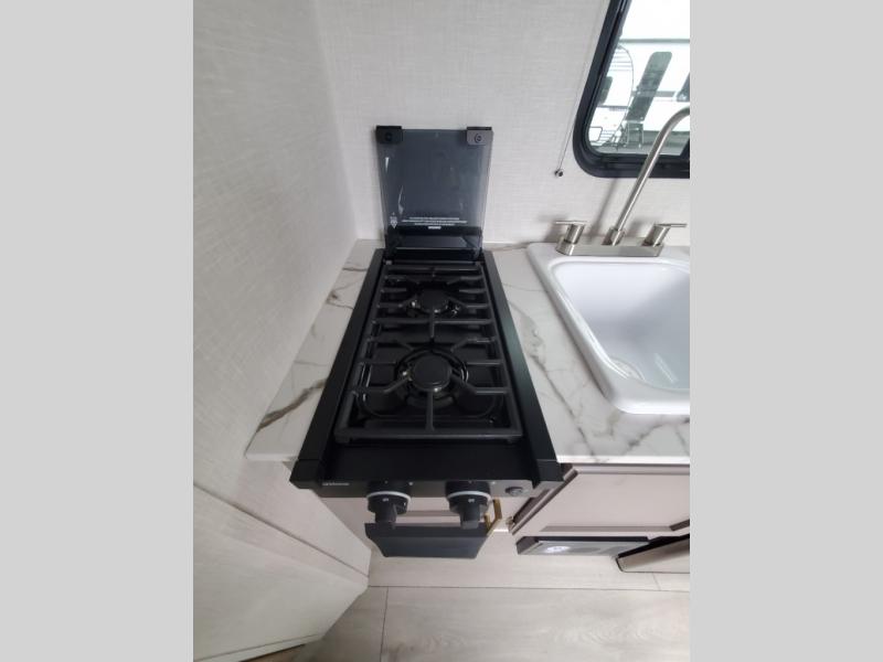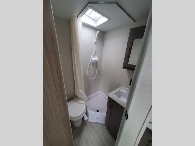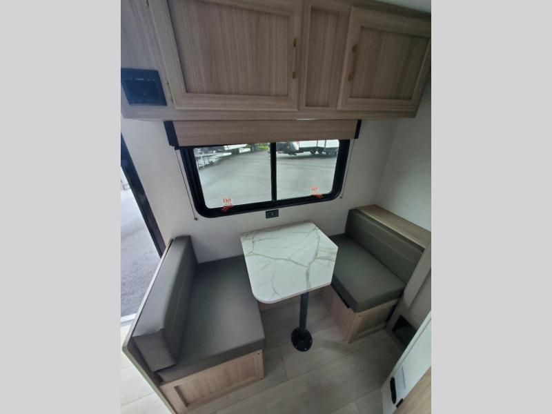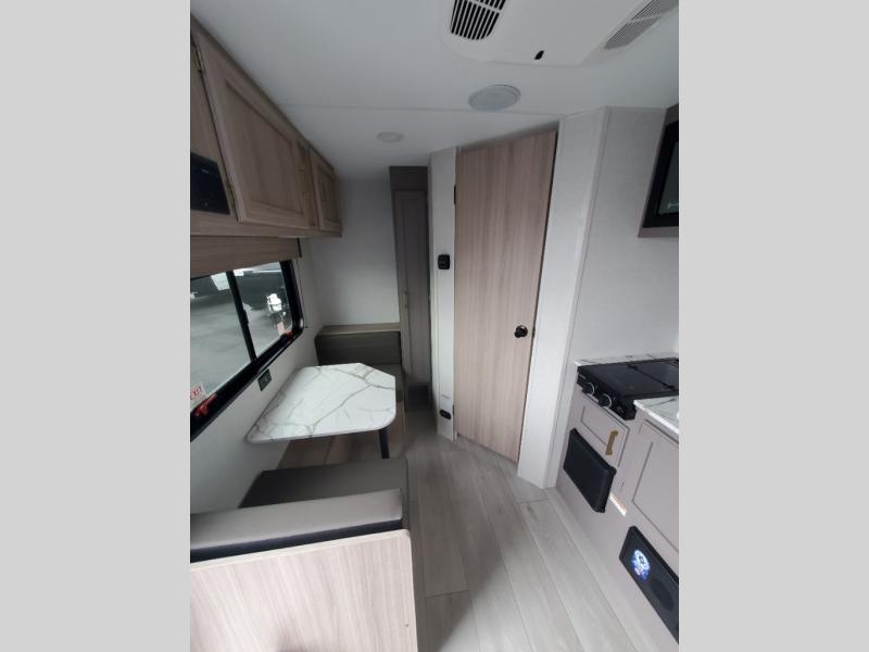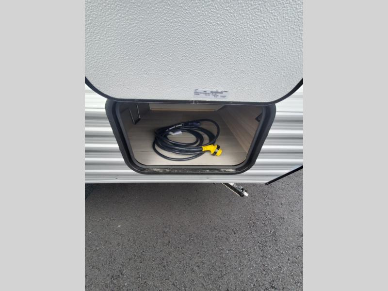 This cozy travel trailer with a front full bed is sure to feel just like home. There is a private bath with a shower and toilet so won't have to use the camp's facilities, and a booth dinette provides dining and additional sleeping space for one adult or two small children. The two burner cooktop and microwave oven will let you make meals each day, and there is a refrigerator to keep perishables fresh. When you're ready for some fresh air, grab your hiking gear from the exterior trunk door and head for the trails!