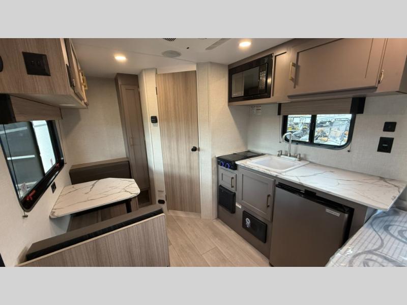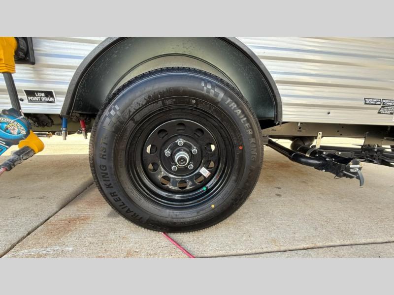 This cozy travel trailer with a front full bed is sure to feel just like home. There is a private bath with a shower and toilet so won't have to use the camp's facilities, and a booth dinette provides dining and additional sleeping space for one adult or two small children. The two burner cooktop and microwave oven will let you make meals each day, and there is a refrigerator to keep perishables fresh. When you're ready for some fresh air, grab your hiking gear from the exterior trunk door and head for the trails!