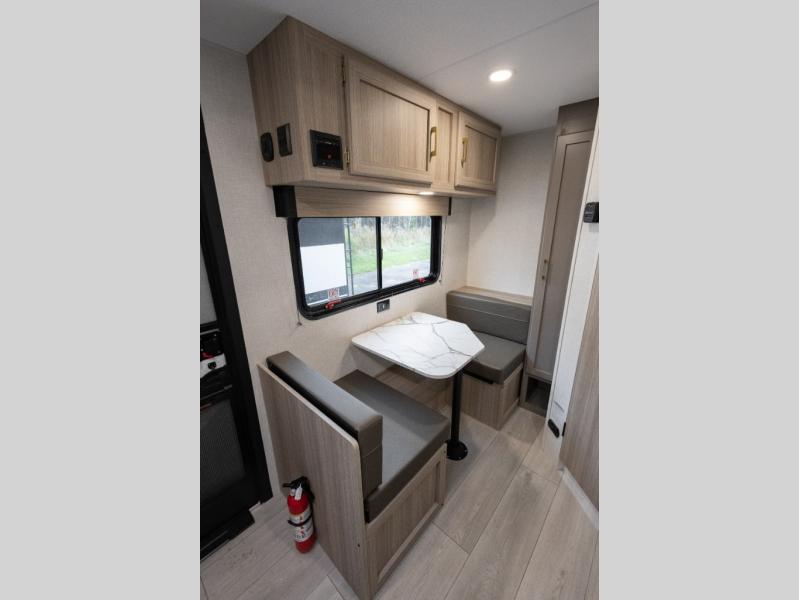 This cozy travel trailer with a front full bed is sure to feel just like home. There is a private bath with a shower and toilet so won't have to use the camp's facilities, and a booth dinette provides dining and additional sleeping space for one adult or two small children. The two burner cooktop and microwave oven will let you make meals each day, and there is a refrigerator to keep perishables fresh. When you're ready for some fresh air, grab your hiking gear from the exterior trunk door and head for the trails!