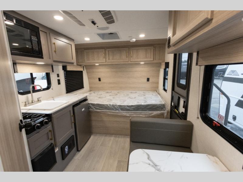 This cozy travel trailer with a front full bed is sure to feel just like home. There is a private bath with a shower and toilet so won't have to use the camp's facilities, and a booth dinette provides dining and additional sleeping space for one adult or two small children. The two burner cooktop and microwave oven will let you make meals each day, and there is a refrigerator to keep perishables fresh. When you're ready for some fresh air, grab your hiking gear from the exterior trunk door and head for the trails!
