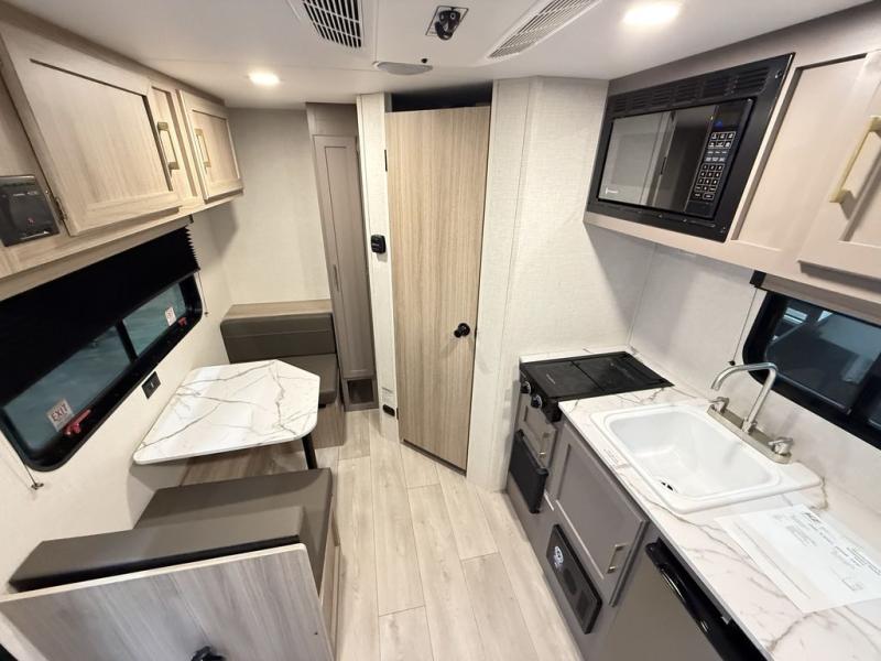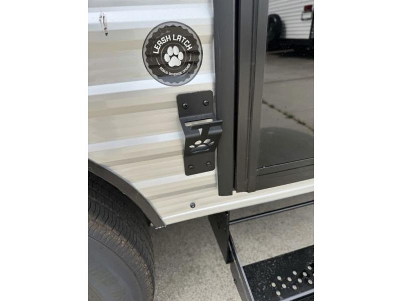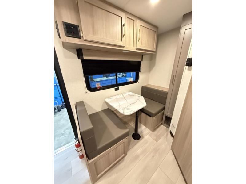 This cozy travel trailer with a front full bed is sure to feel just like home. There is a private bath with a shower and toilet so won't have to use the camp's facilities, and a booth dinette provides dining and additional sleeping space for one adult or two small children. The two burner cooktop and microwave oven will let you make meals each day, and there is a refrigerator to keep perishables fresh. When you're ready for some fresh air, grab your hiking gear from the exterior trunk door and head for the trails!