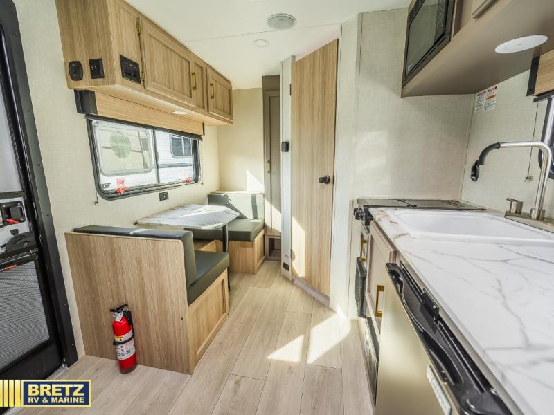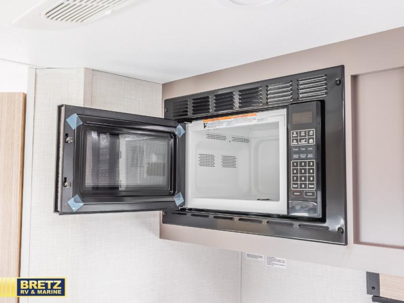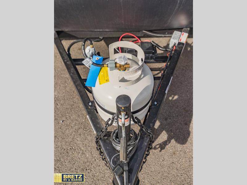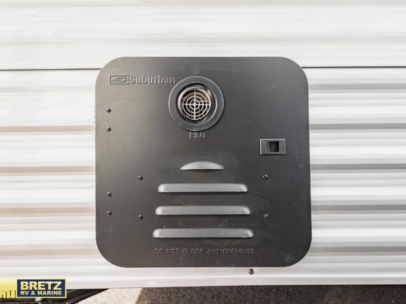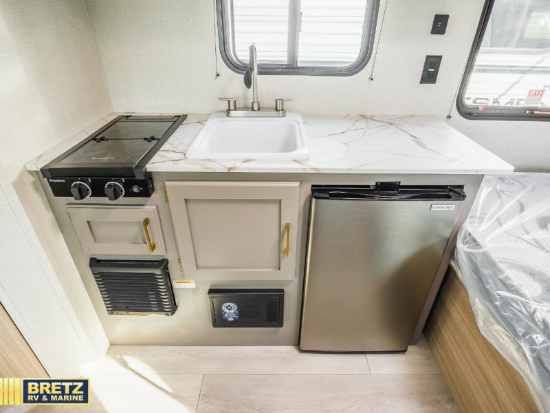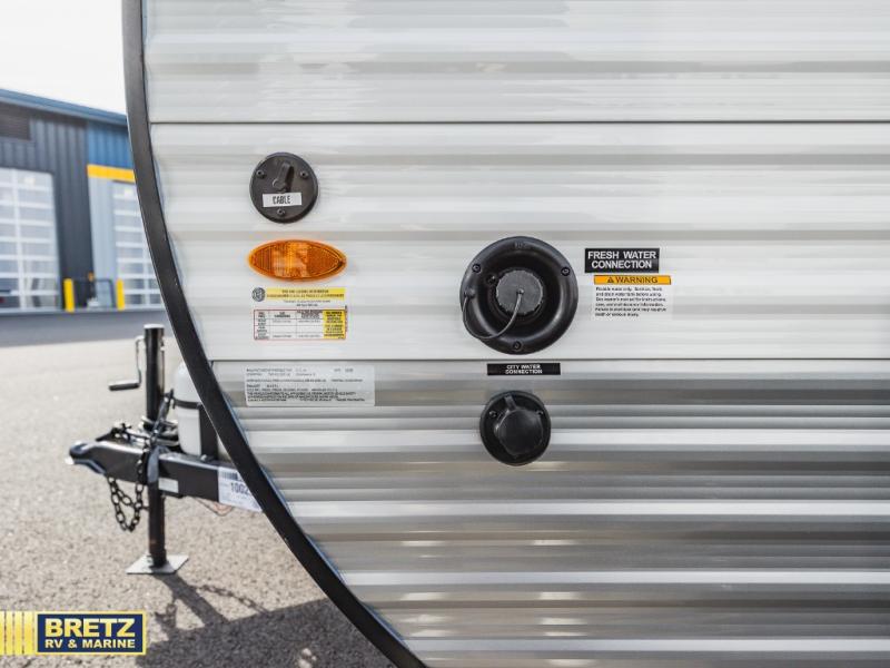 This cozy travel trailer with a front full bed is sure to feel just like home. There is a private bath with a shower and toilet so won't have to use the camp's facilities, and a booth dinette provides dining and additional sleeping space for one adult or two small children. The two burner cooktop and microwave oven will let you make meals each day, and there is a refrigerator to keep perishables fresh. When you're ready for some fresh air, grab your hiking gear from the exterior trunk door and head for the trails!