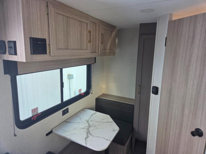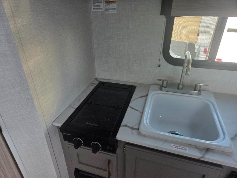 This cozy travel trailer with a front full bed is sure to feel just like home. There is a private bath with a shower and toilet so won't have to use the camp's facilities, and a booth dinette provides dining and additional sleeping space for one adult or two small children. The two burner cooktop and microwave oven will let you make meals each day, and there is a refrigerator to keep perishables fresh. When you're ready for some fresh air, grab your hiking gear from the exterior trunk door and head for the trails!
