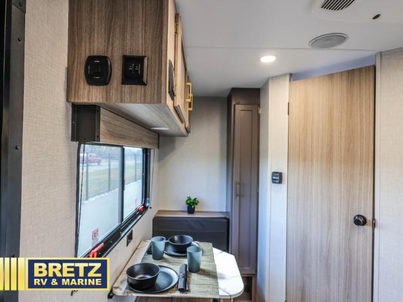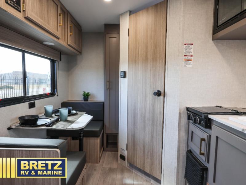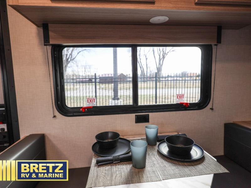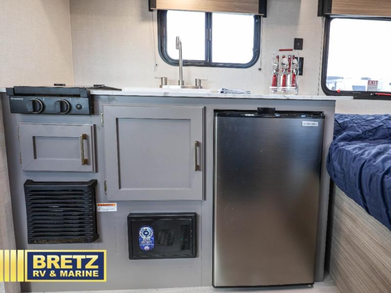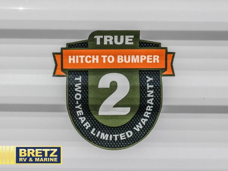 This cozy travel trailer with a front full bed is sure to feel just like home. There is a private bath with a shower and toilet so won't have to use the camp's facilities, and a booth dinette provides dining and additional sleeping space for one adult or two small children. The two burner cooktop and microwave oven will let you make meals each day, and there is a refrigerator to keep perishables fresh. When you're ready for some fresh air, grab your hiking gear from the exterior trunk door and head for the trails!