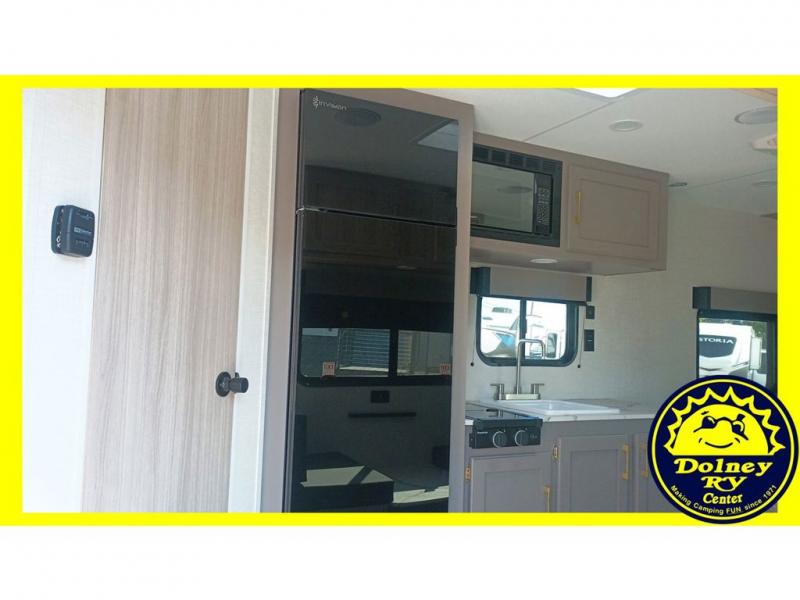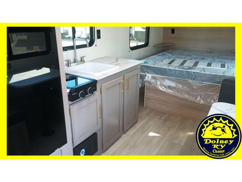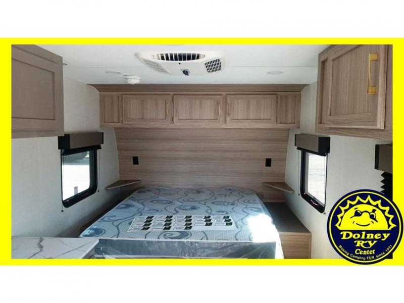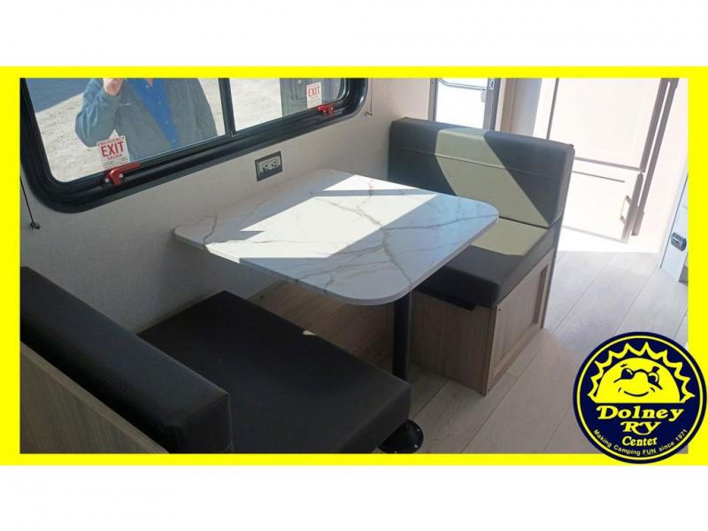 This travel trailer will feel just like home with its full bath, walk-around RV queen bed, and plenty of storage space for your belongings. Once you arrive at the campground, grab your fishing poles from the pass-through storage and head down to the river. You can get cleaned up in the full bath before heading to the kitchen to prepare a meal on the two burner cooktop with a glass cover or in the microwave oven. There is a comfortable booth dinette to dine at, and this space can double as sleeping space for overnight guests or two little ones.