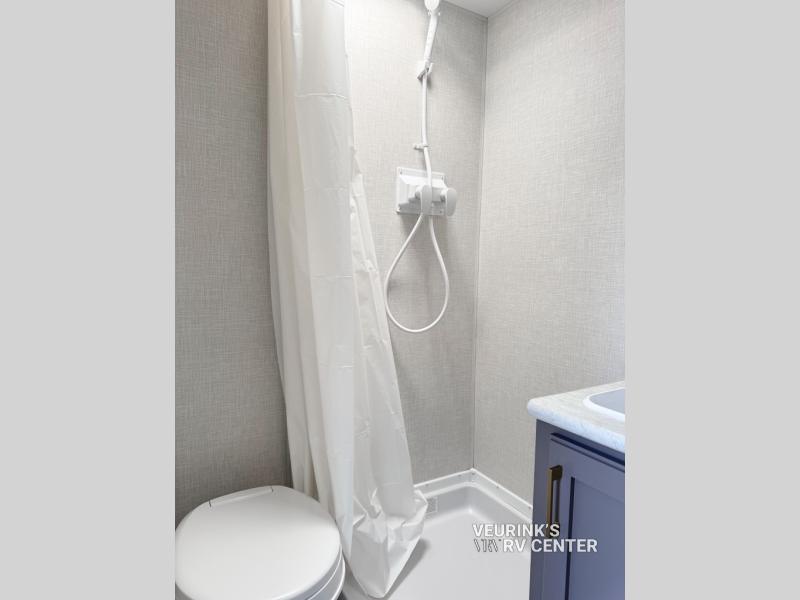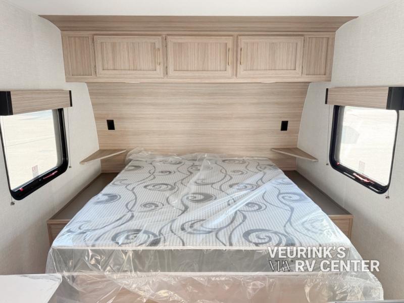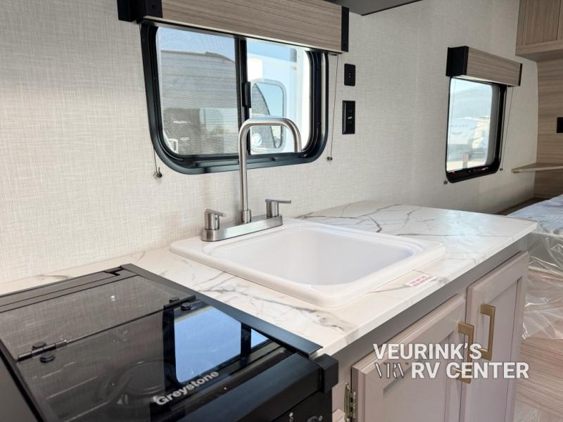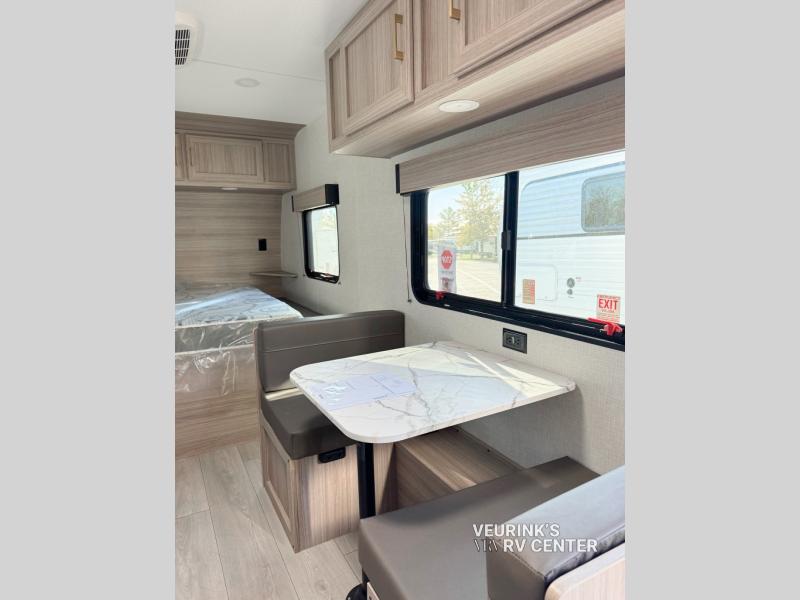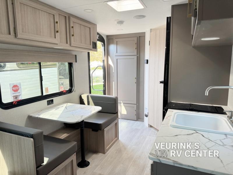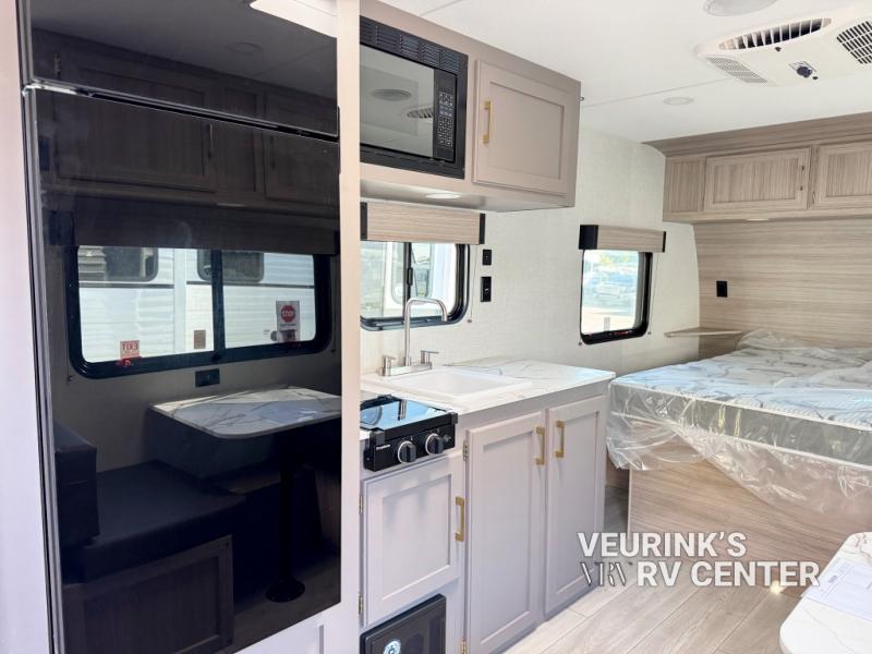 This travel trailer will feel just like home with its full bath, walk-around RV queen bed, and plenty of storage space for your belongings. Once you arrive at the campground, grab your fishing poles from the pass-through storage and head down to the river. You can get cleaned up in the full bath before heading to the kitchen to prepare a meal on the two burner cooktop with a glass cover or in the microwave oven. There is a comfortable booth dinette to dine at, and this space can double as sleeping space for overnight guests or two little ones.