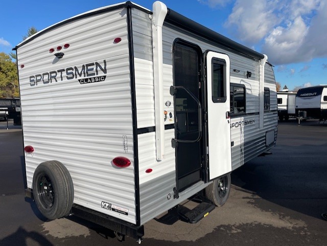 With any Sportsmen Classis travel trailer by KZ you will find durable construction materials, like the 3/8" fully-walkable roof and the one-piece seamless Tufflex material. Each model includes scissor-style stabilizer jacks, a Key-Alike program for baggage and entry doors, and a Leash Latch with a bonus beverage opener. You will find interior and exterior speakers plus backup camera prep and solar prep. The Sportsmen Classic is designed to make you feel at home with rail-style cabinet doors, residential grade linoleum, and plenty of storage space for all your belongings.