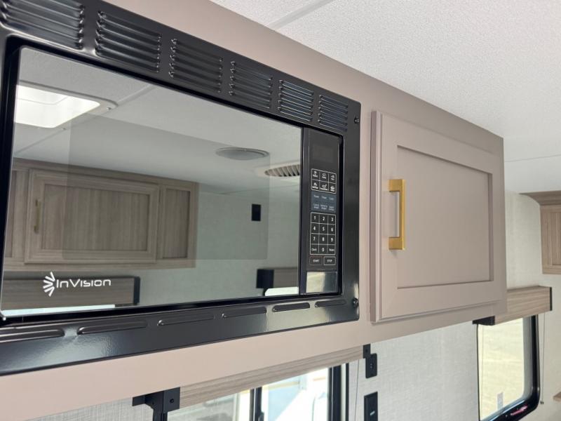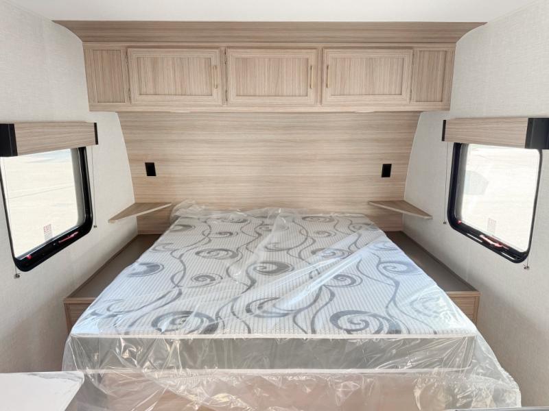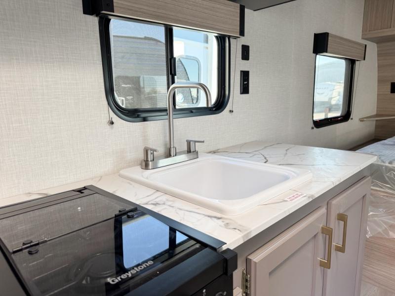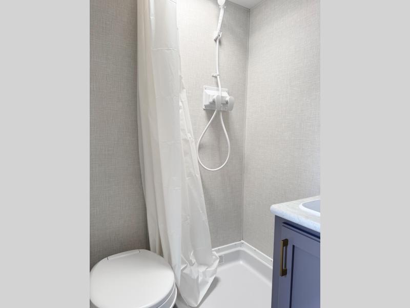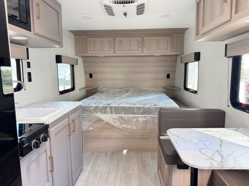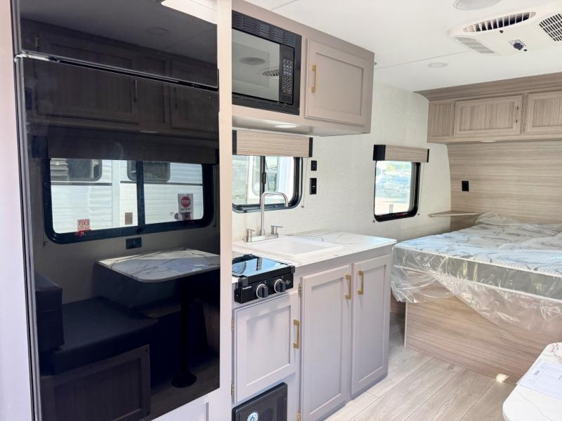 This travel trailer will feel just like home with its full bath, walk-around RV queen bed, and plenty of storage space for your belongings. Once you arrive at the campground, grab your fishing poles from the pass-through storage and head down to the river. You can get cleaned up in the full bath before heading to the kitchen to prepare a meal on the two burner cooktop with a glass cover or in the microwave oven. There is a comfortable booth dinette to dine at, and this space can double as sleeping space for overnight guests or two little ones.