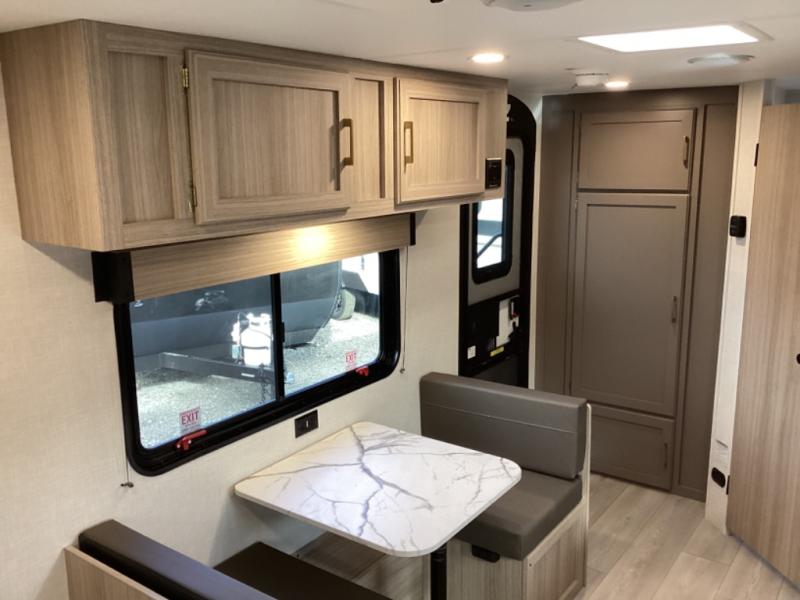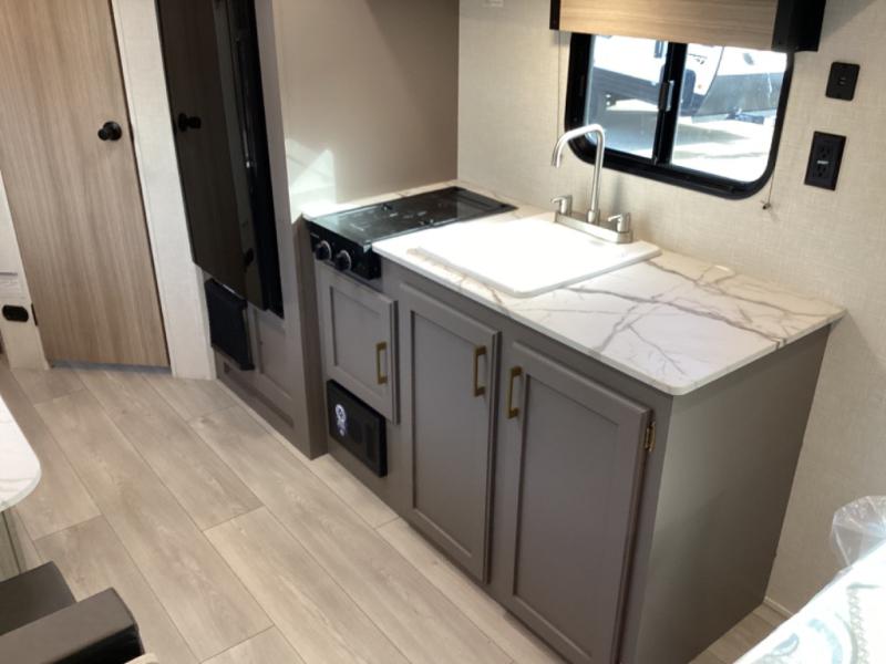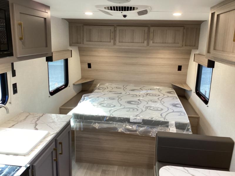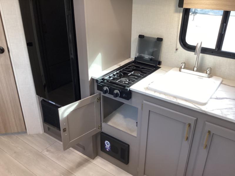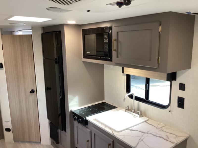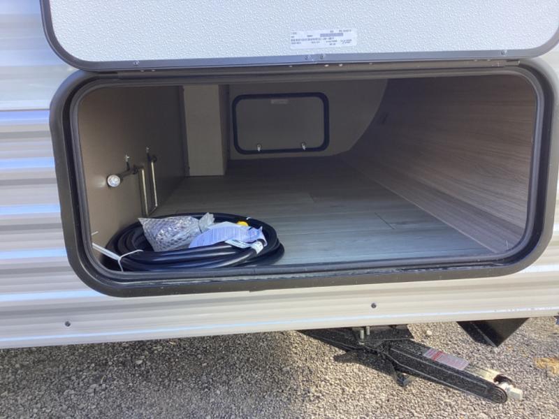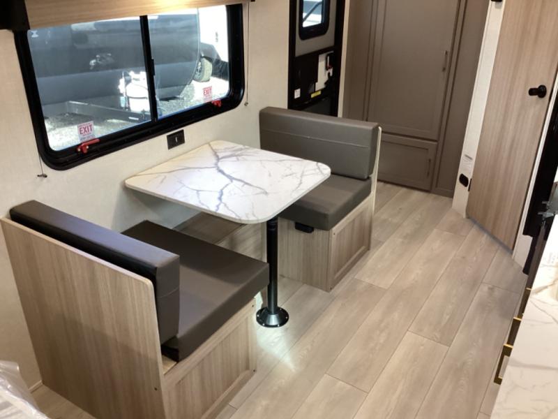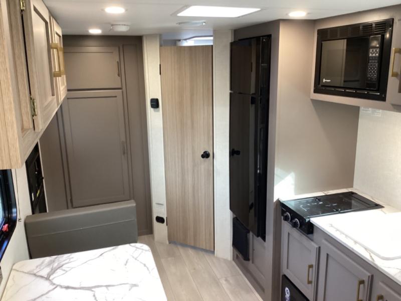 This travel trailer will feel just like home with its full bath, walk-around RV queen bed, and plenty of storage space for your belongings. Once you arrive at the campground, grab your fishing poles from the pass-through storage and head down to the river. You can get cleaned up in the full bath before heading to the kitchen to prepare a meal on the two burner cooktop with a glass cover or in the microwave oven. There is a comfortable booth dinette to dine at, and this space can double as sleeping space for overnight guests or two little ones.
