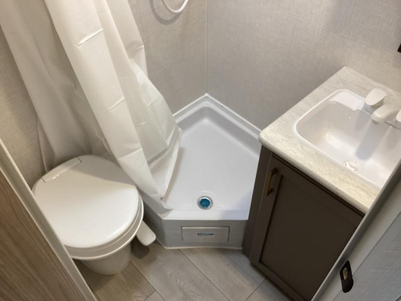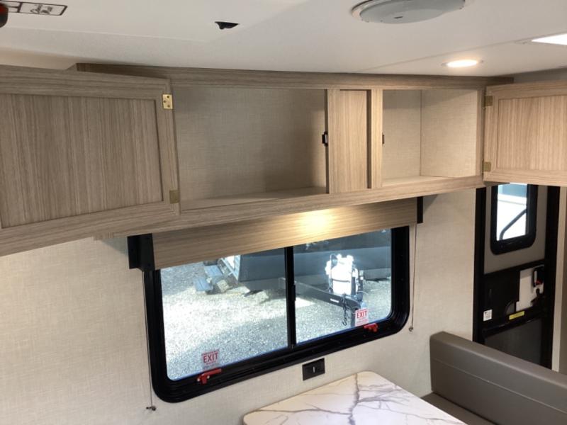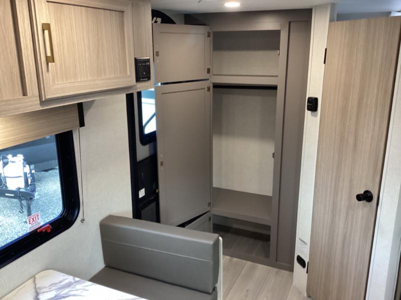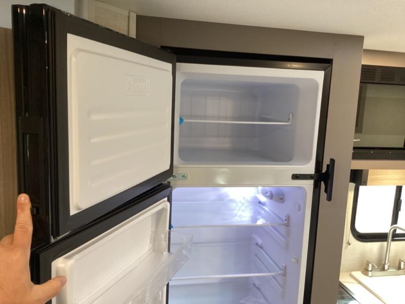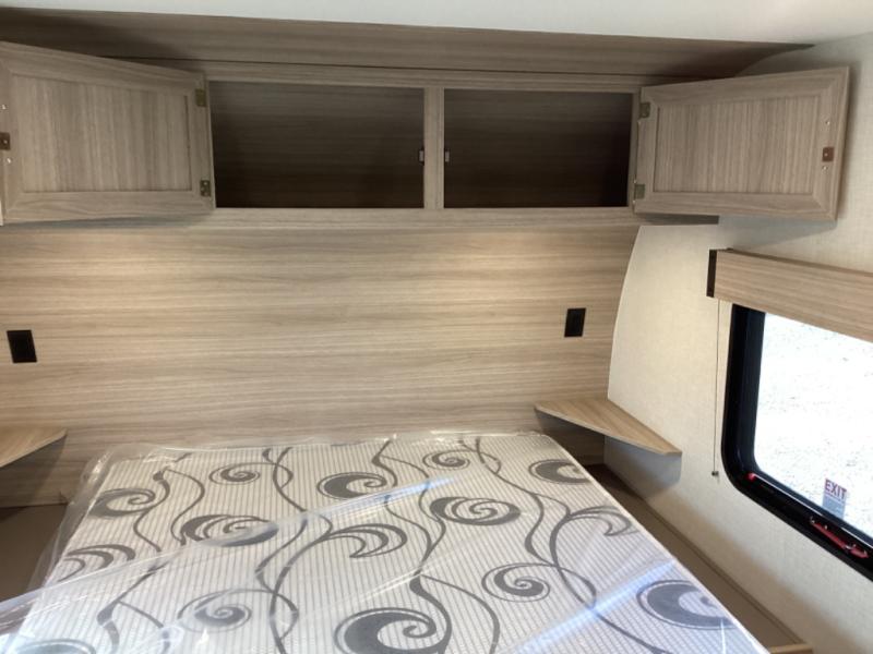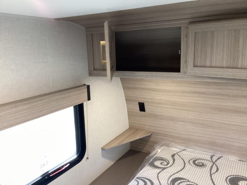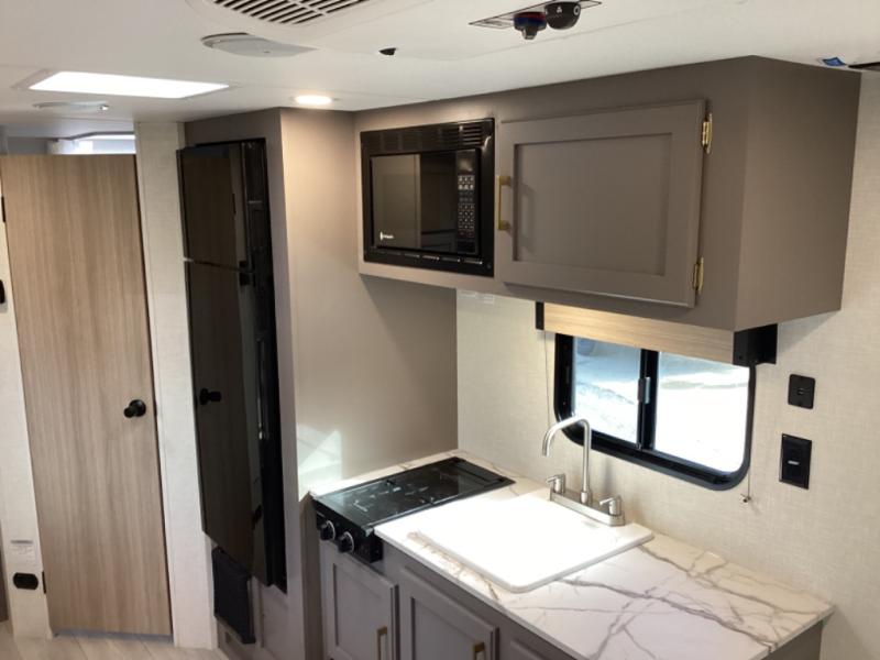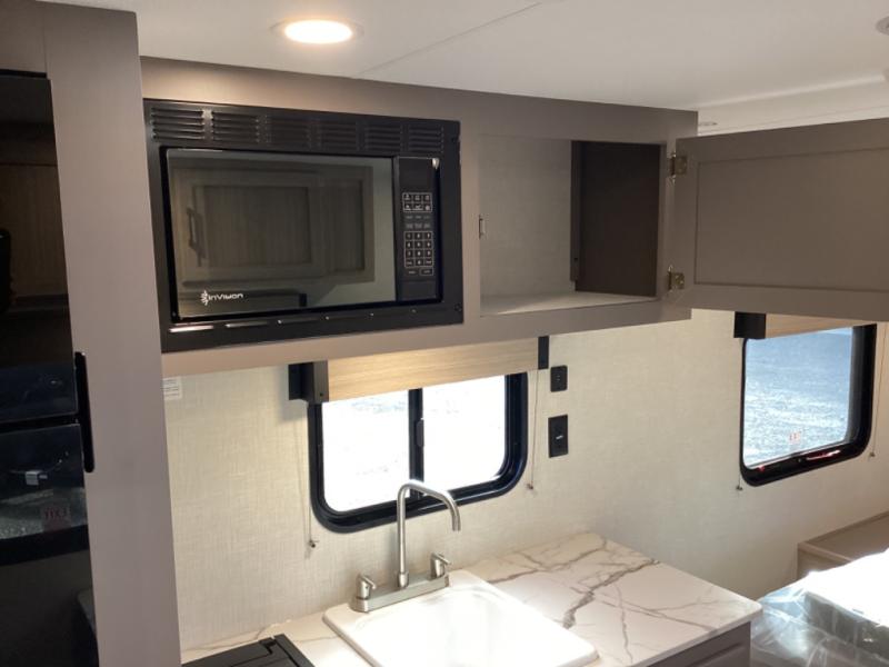 This travel trailer will feel just like home with its full bath, walk-around RV queen bed, and plenty of storage space for your belongings. Once you arrive at the campground, grab your fishing poles from the pass-through storage and head down to the river. You can get cleaned up in the full bath before heading to the kitchen to prepare a meal on the two burner cooktop with a glass cover or in the microwave oven. There is a comfortable booth dinette to dine at, and this space can double as sleeping space for overnight guests or two little ones.