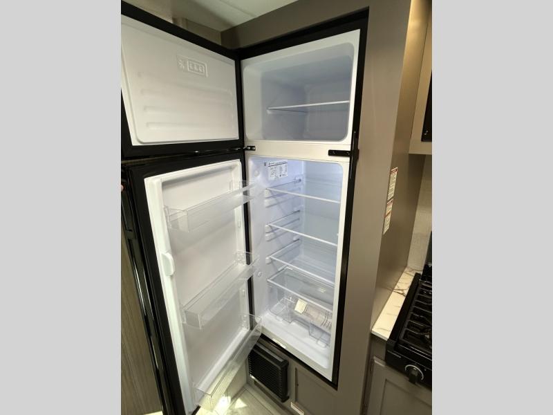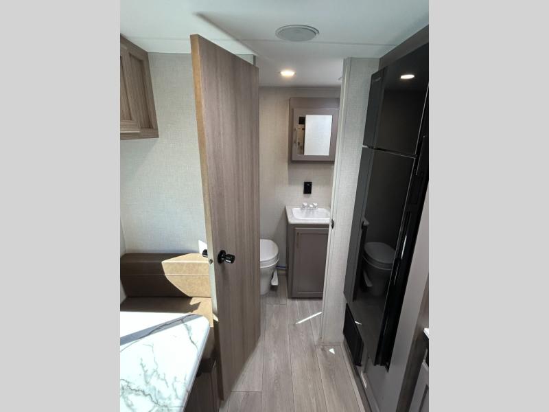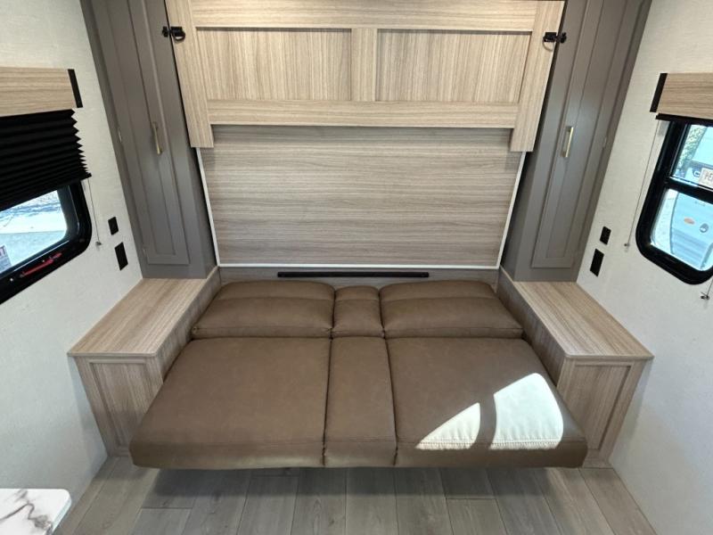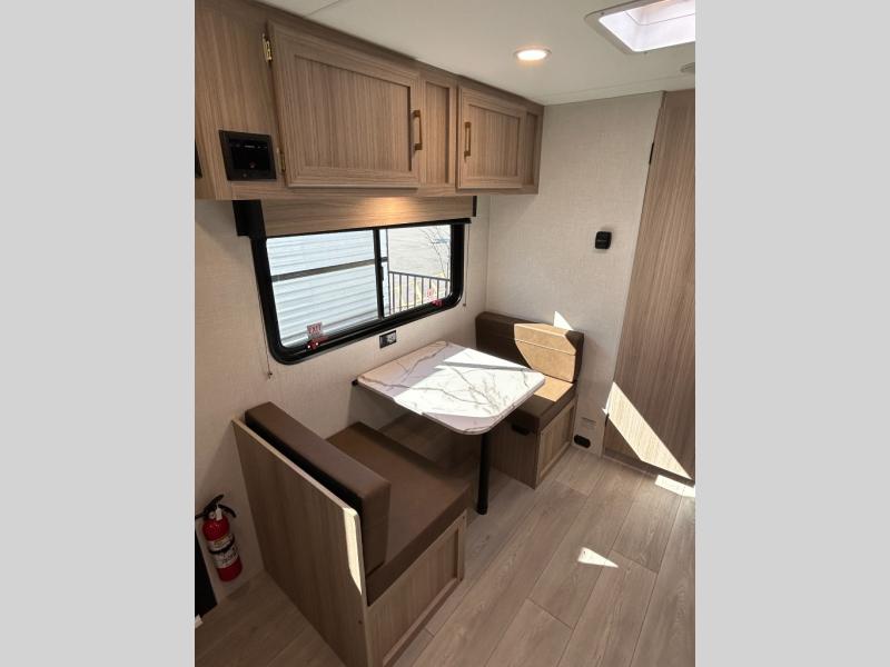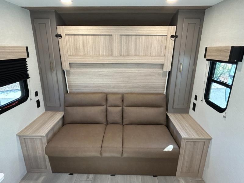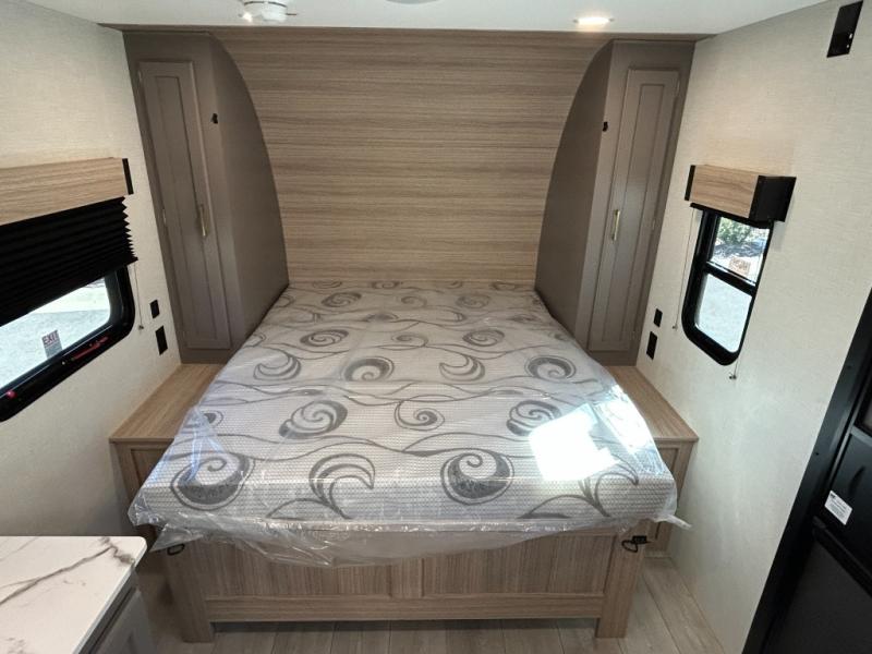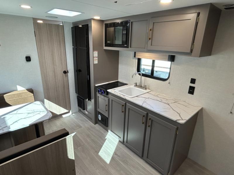 This versatile travel trailer is perfect for weekend trips to the lake. You'll sleep soundly each night on the 60" x 74" mattress, and there are dual bedside wardrobes to keep your things tidy. This model also includes a booth dinette that can be used for dining and sleeping space. The chef of your group can prepare meals on the two burner cooktop with a glass cover, and leftovers can go in the 8 cu. ft. 12V refrigerator. This model also includes a 12' power awning that will provide shade while you're outdoors as well.