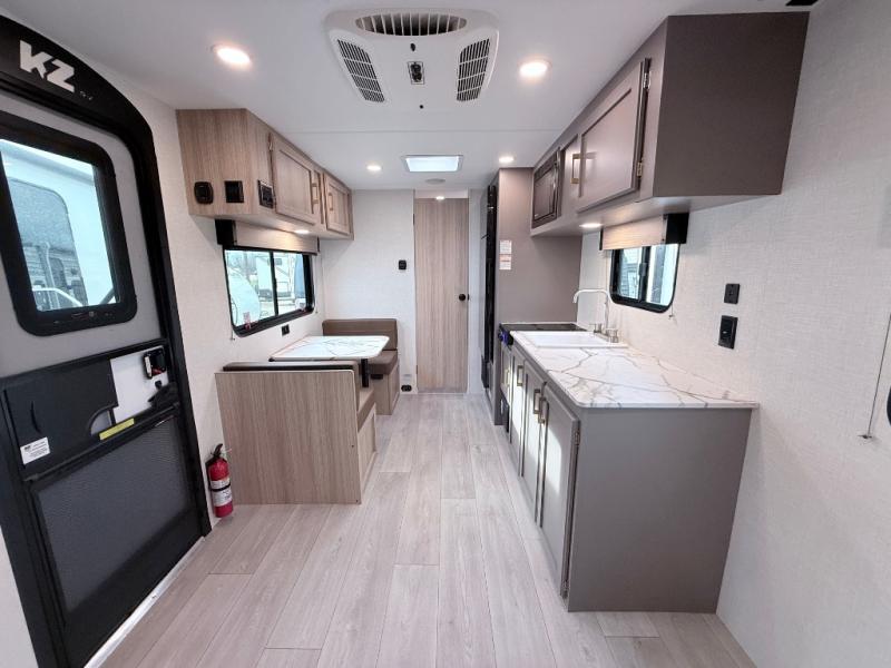 With any Sportsmen Classis travel trailer by KZ you will find durable construction materials, like the 3/8" fully-walkable roof and the one-piece seamless Tufflex material. Each model includes scissor-style stabilizer jacks, a Key-Alike program for baggage and entry doors, and a Leash Latch with a bonus beverage opener. You will find interior and exterior speakers plus backup camera prep and solar prep. The Sportsmen Classic is designed to make you feel at home with rail-style cabinet doors, residential grade linoleum, and plenty of storage space for all your belongings.