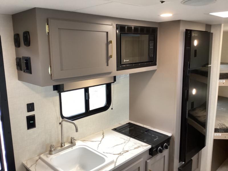 The spacious double-size bunk beds are perfect for families or groups, providing ample sleeping space for a restful night's sleep. There is a 60” jiffy sofa and a murphy bed that offers additional sleeping space or a comfortable spot to relax, making it ideal for families or couples. Further, the cozy booth dinette is a perfect spot for meals or playing board games, creating lasting memories with loved ones. In the kitchen area, the 12V refrigerator keeps your food and drinks fresh, while the microwave provides a convenient way to prepare meals on the go. And after a long day, the full bathroom will be a haven for convenience and comfort, featuring everything you need to freshen up on the go.