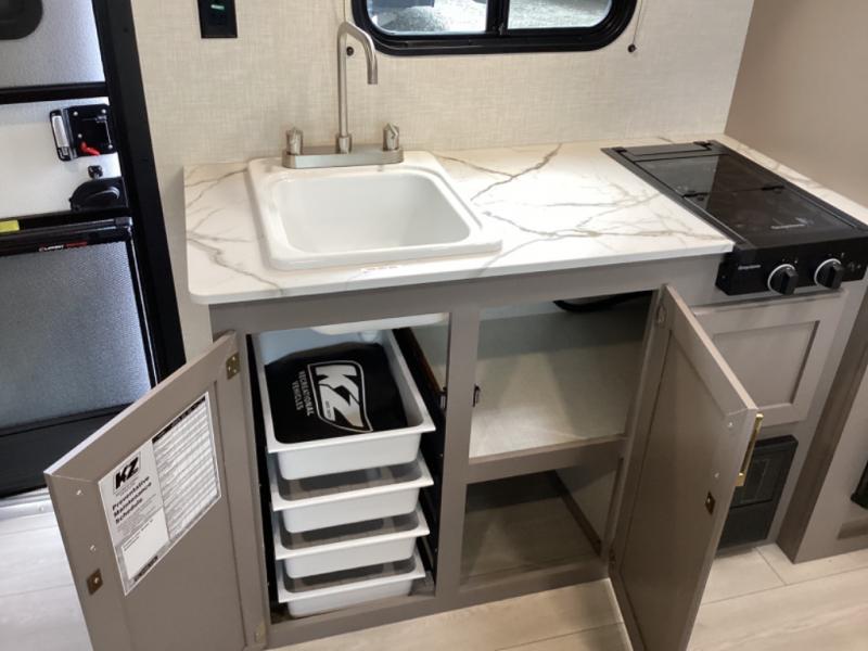 With any Sportsmen Classis travel trailer by KZ you will find durable construction materials, like the 3/8" fully-walkable roof and the one-piece seamless Tufflex material. Each model includes scissor-style stabilizer jacks, a Key-Alike program for baggage and entry doors, and a Leash Latch with a bonus beverage opener. You will find interior and exterior speakers plus backup camera prep and solar prep. The Sportsmen Classic is designed to make you feel at home with rail-style cabinet doors, residential grade linoleum, and plenty of storage space for all your belongings.