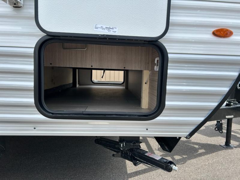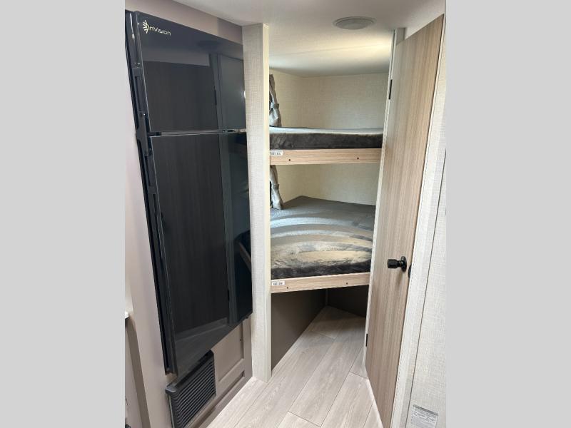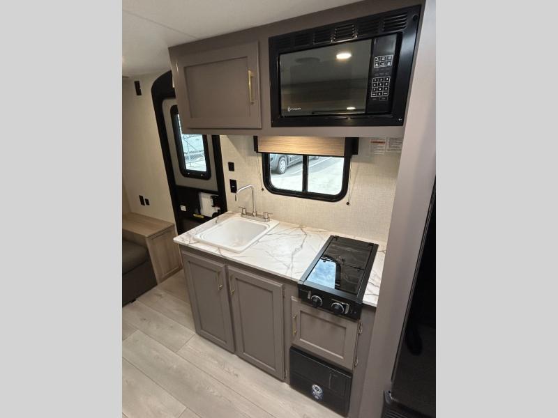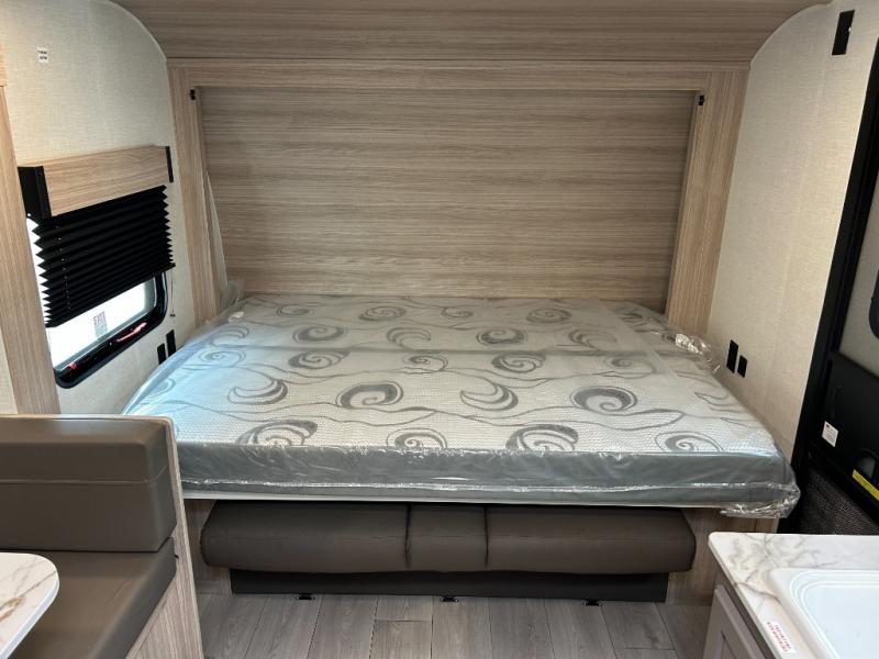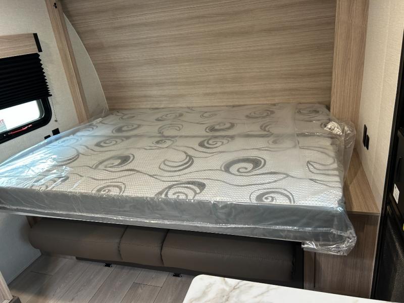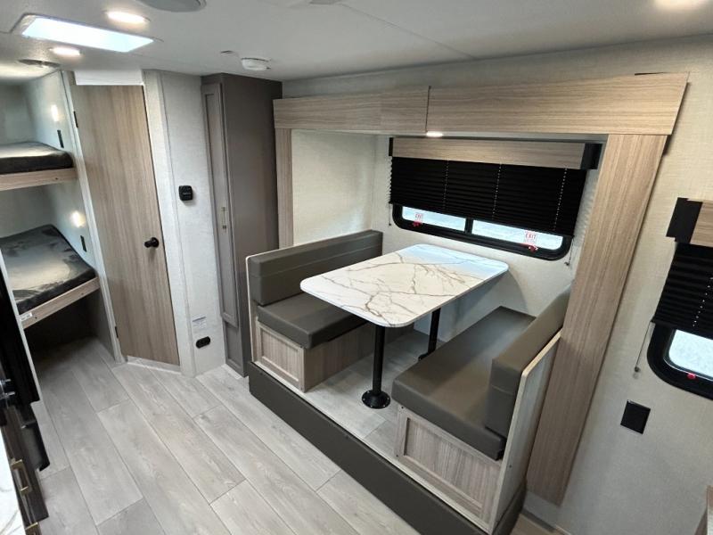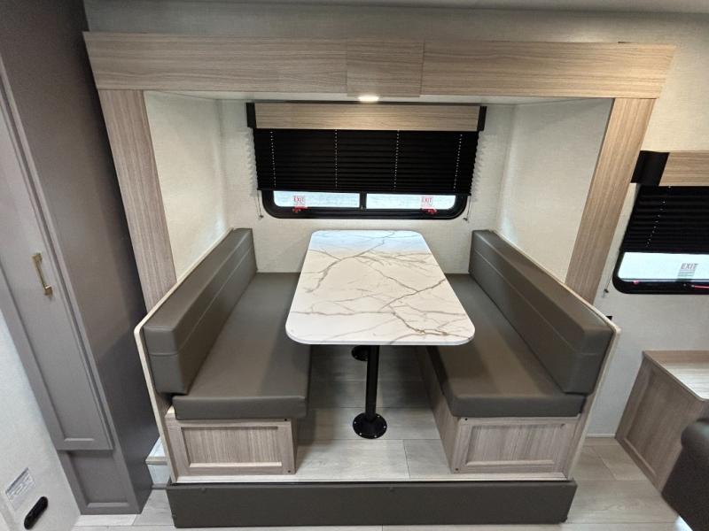 The spacious double-size bunk beds are perfect for families or groups, providing ample sleeping space for a restful night's sleep. There is a 60” jiffy sofa and a murphy bed that offers additional sleeping space or a comfortable spot to relax, making it ideal for families or couples. Further, the cozy booth dinette is a perfect spot for meals or playing board games, creating lasting memories with loved ones. In the kitchen area, the 12V refrigerator keeps your food and drinks fresh, while the microwave provides a convenient way to prepare meals on the go. And after a long day, the full bathroom will be a haven for convenience and comfort, featuring everything you need to freshen up on the go.