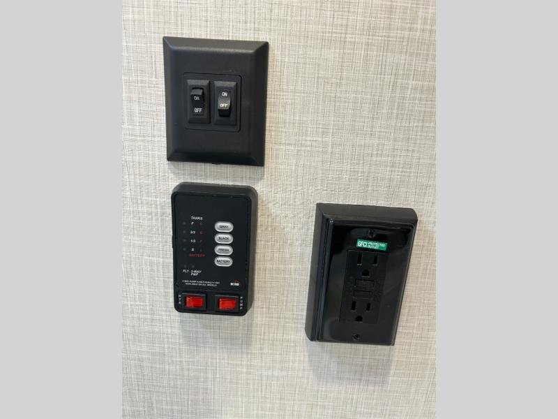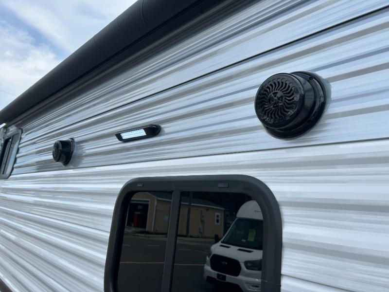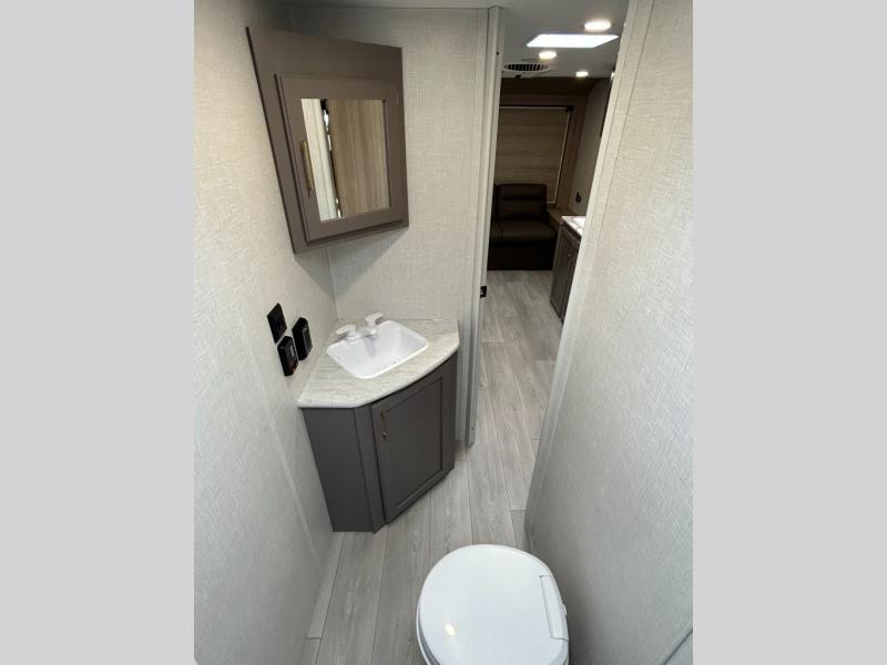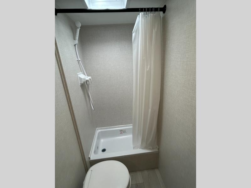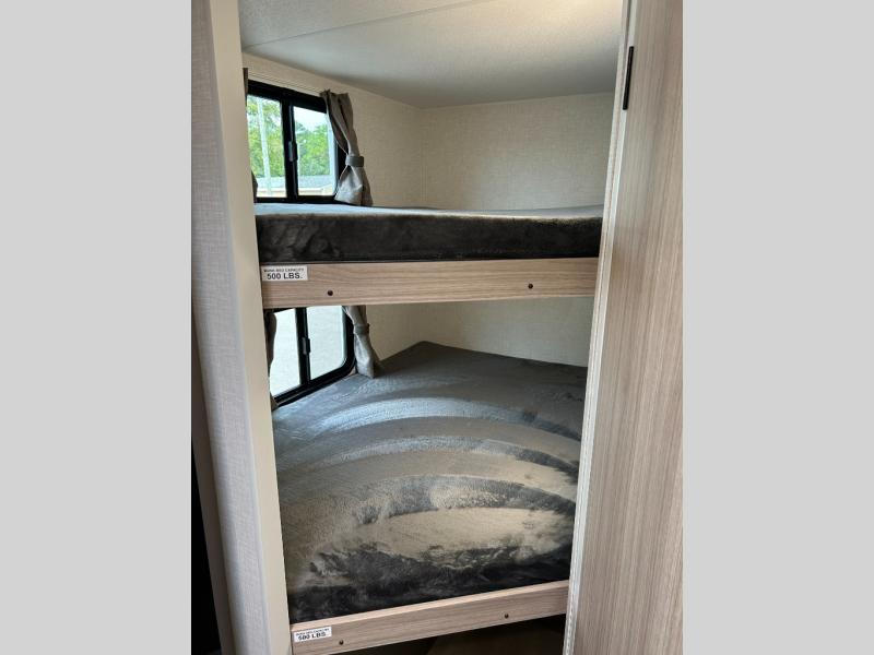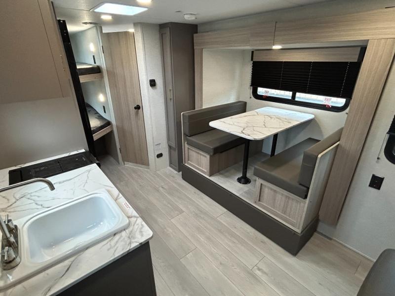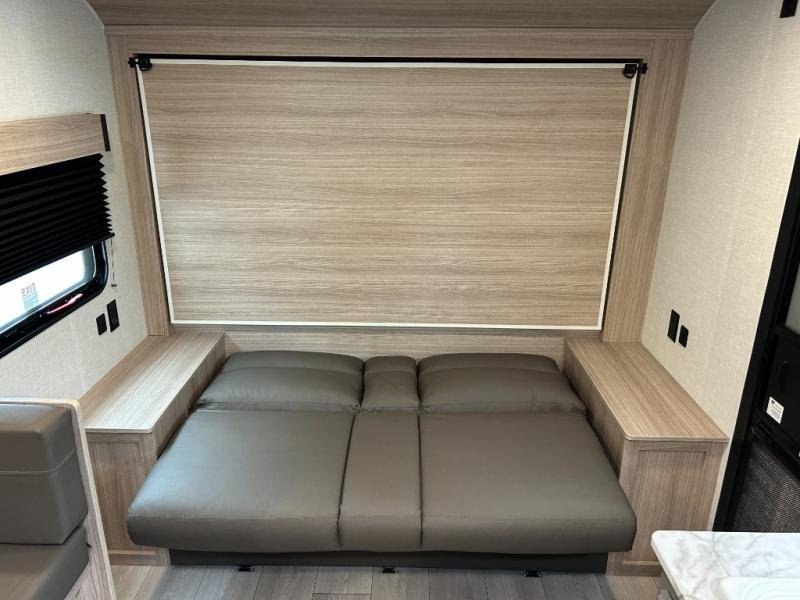 The spacious double-size bunk beds are perfect for families or groups, providing ample sleeping space for a restful night's sleep. There is a 60” jiffy sofa and a murphy bed that offers additional sleeping space or a comfortable spot to relax, making it ideal for families or couples. Further, the cozy booth dinette is a perfect spot for meals or playing board games, creating lasting memories with loved ones. In the kitchen area, the 12V refrigerator keeps your food and drinks fresh, while the microwave provides a convenient way to prepare meals on the go. And after a long day, the full bathroom will be a haven for convenience and comfort, featuring everything you need to freshen up on the go.
