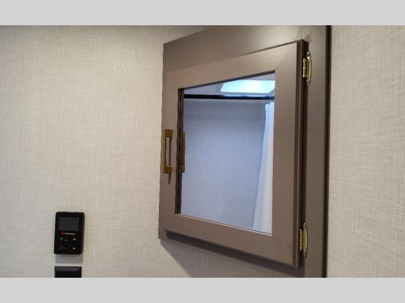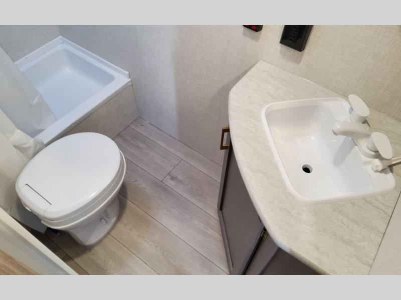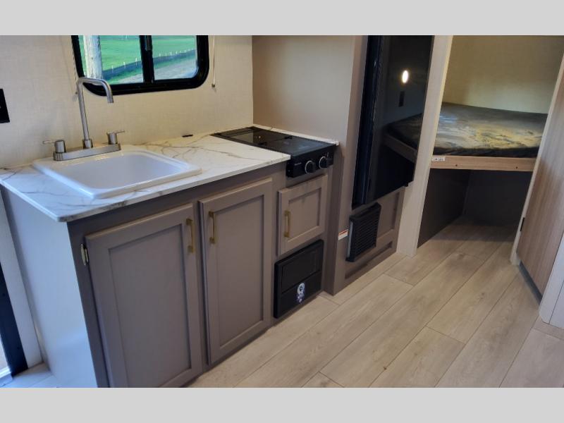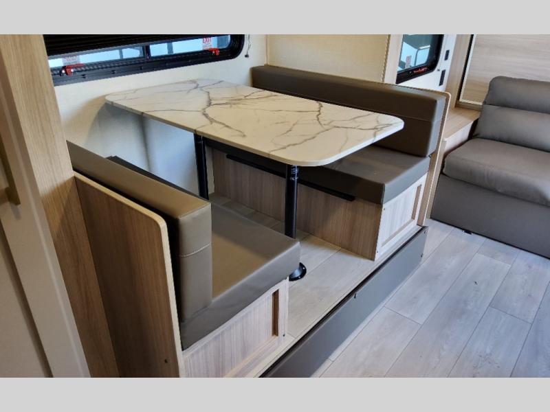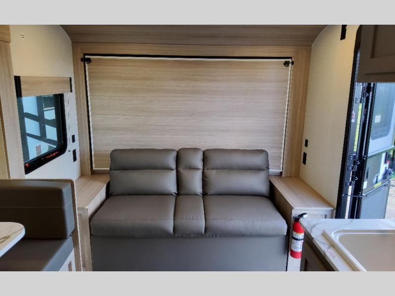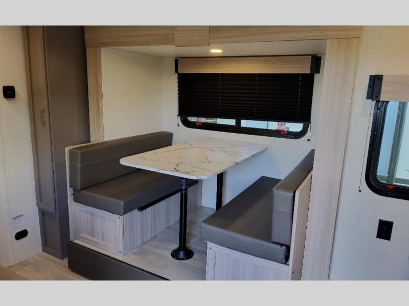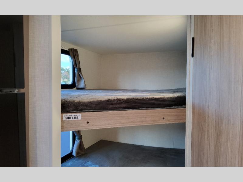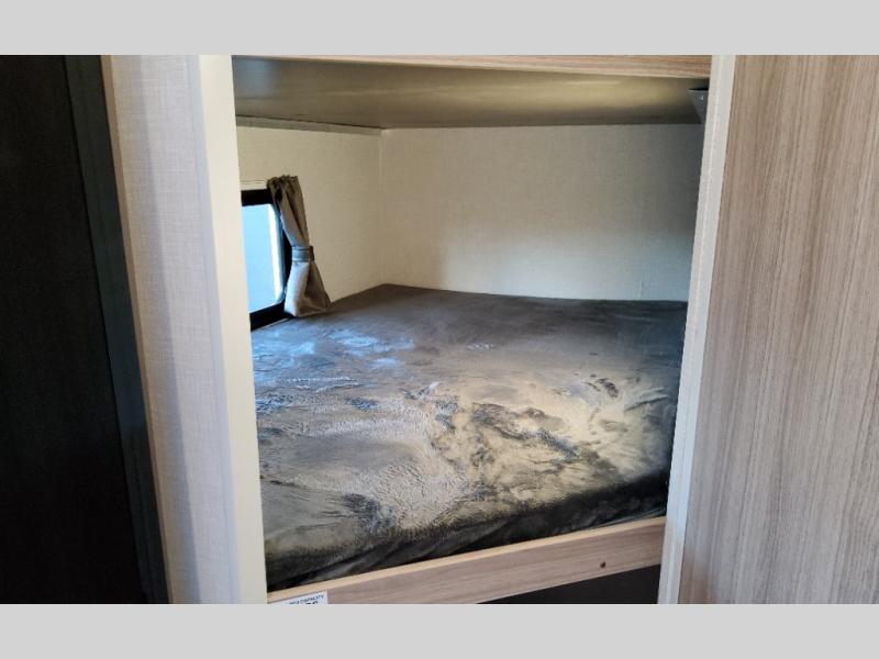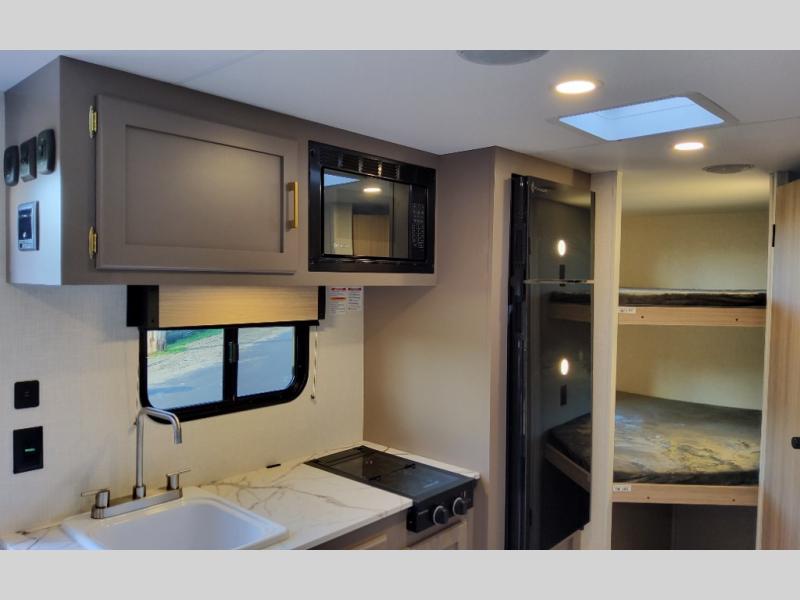 The spacious double-size bunk beds are perfect for families or groups, providing ample sleeping space for a restful night's sleep. There is a 60” jiffy sofa and a murphy bed that offers additional sleeping space or a comfortable spot to relax, making it ideal for families or couples. Further, the cozy booth dinette is a perfect spot for meals or playing board games, creating lasting memories with loved ones. In the kitchen area, the 12V refrigerator keeps your food and drinks fresh, while the microwave provides a convenient way to prepare meals on the go. And after a long day, the full bathroom will be a haven for convenience and comfort, featuring everything you need to freshen up on the go.