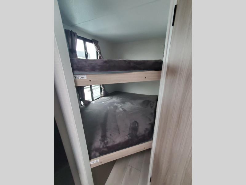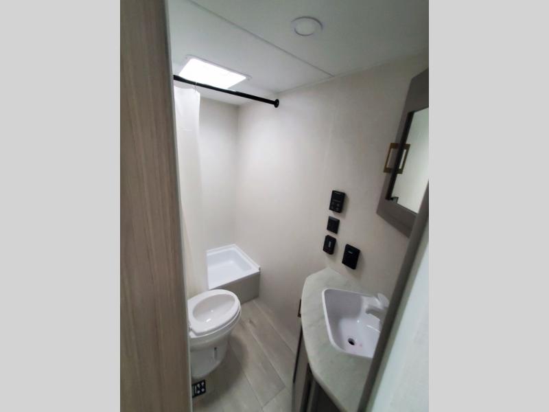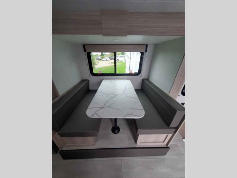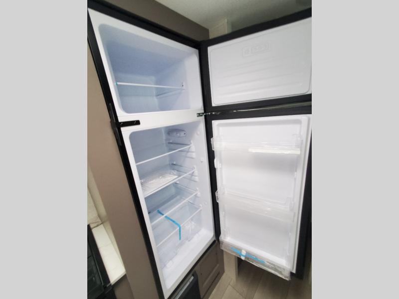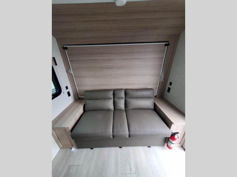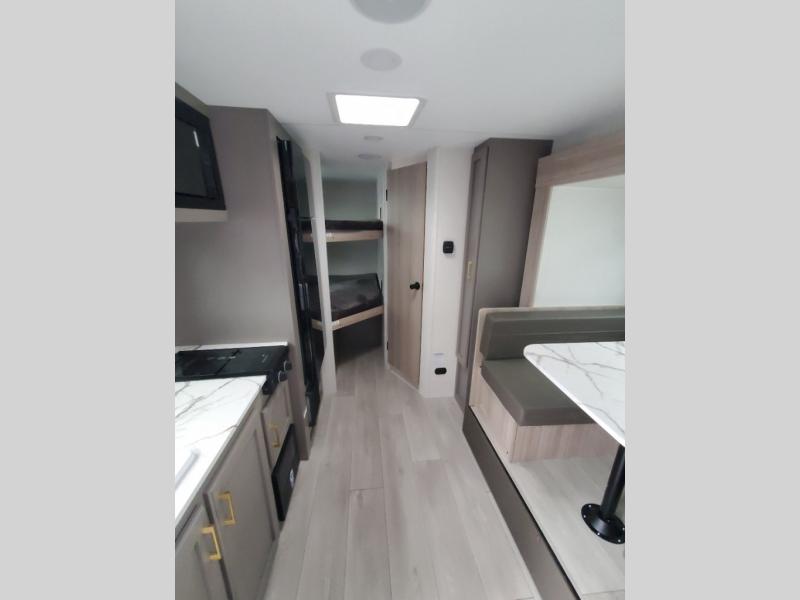 The spacious double-size bunk beds are perfect for families or groups, providing ample sleeping space for a restful night's sleep. There is a 60” jiffy sofa and a murphy bed that offers additional sleeping space or a comfortable spot to relax, making it ideal for families or couples. Further, the cozy booth dinette is a perfect spot for meals or playing board games, creating lasting memories with loved ones. In the kitchen area, the 12V refrigerator keeps your food and drinks fresh, while the microwave provides a convenient way to prepare meals on the go. And after a long day, the full bathroom will be a haven for convenience and comfort, featuring everything you need to freshen up on the go.
