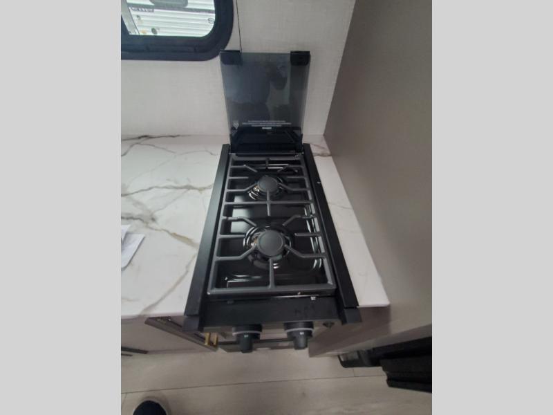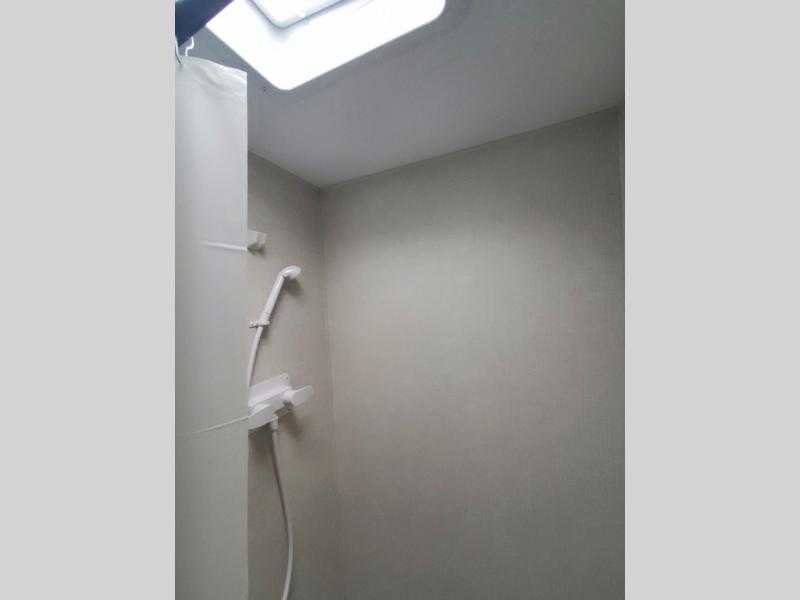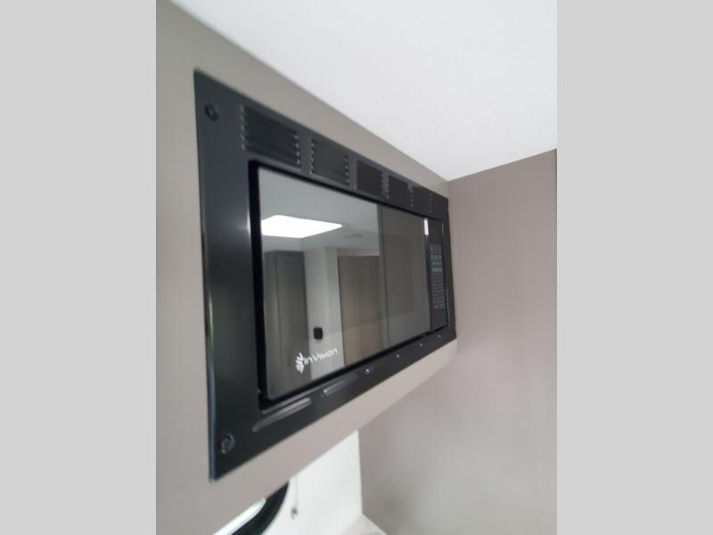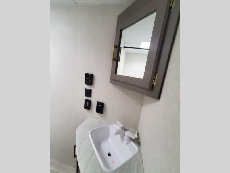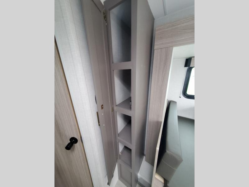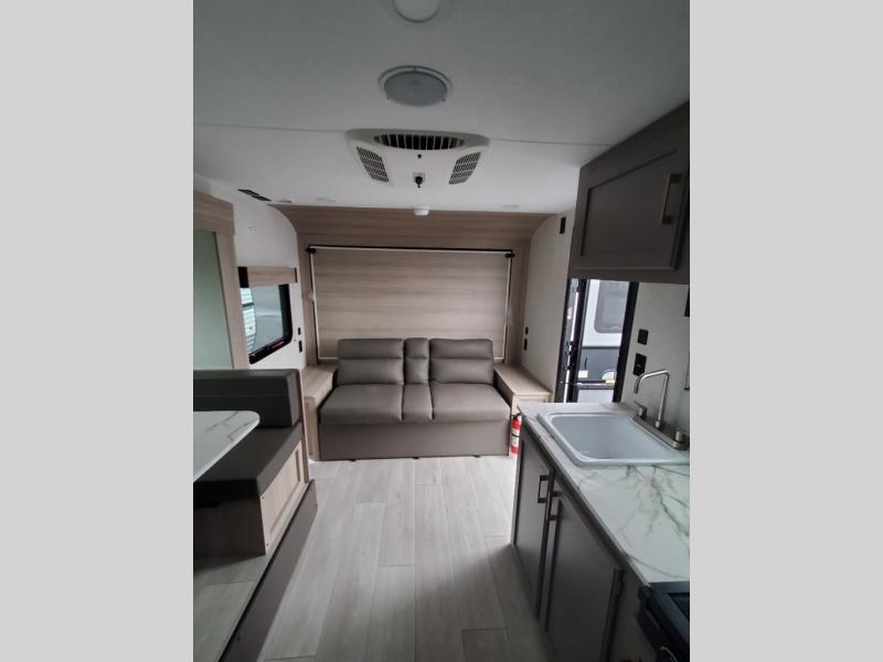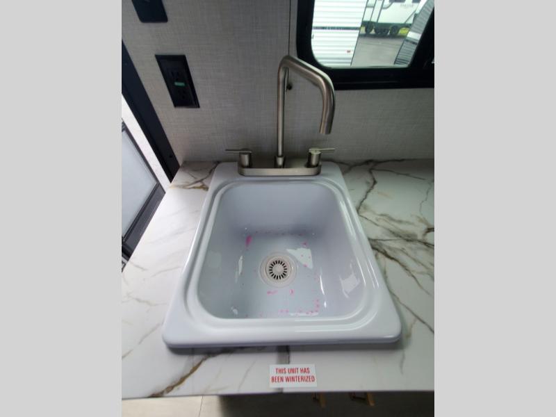The spacious double-size bunk beds are perfect for families or groups, providing ample sleeping space for a restful night's sleep. There is a 60” jiffy sofa and a murphy bed that offers additional sleeping space or a comfortable spot to relax, making it ideal for families or couples. Further, the cozy booth dinette is a perfect spot for meals or playing board games, creating lasting memories with loved ones. In the kitchen area, the 12V refrigerator keeps your food and drinks fresh, while the microwave provides a convenient way to prepare meals on the go. And after a long day, the full bathroom will be a haven for convenience and comfort, featuring everything you need to freshen up on the go.