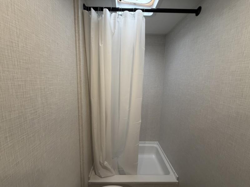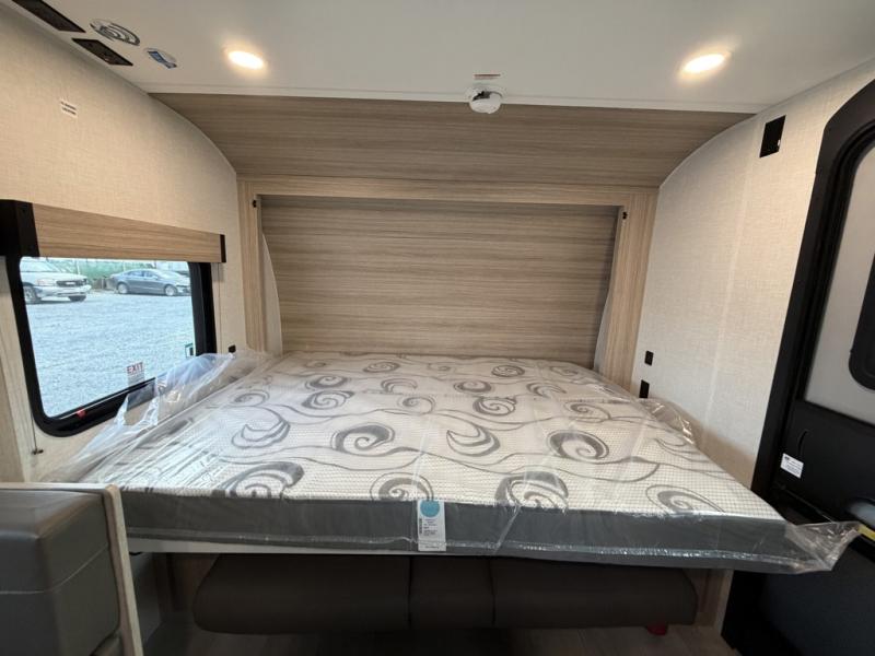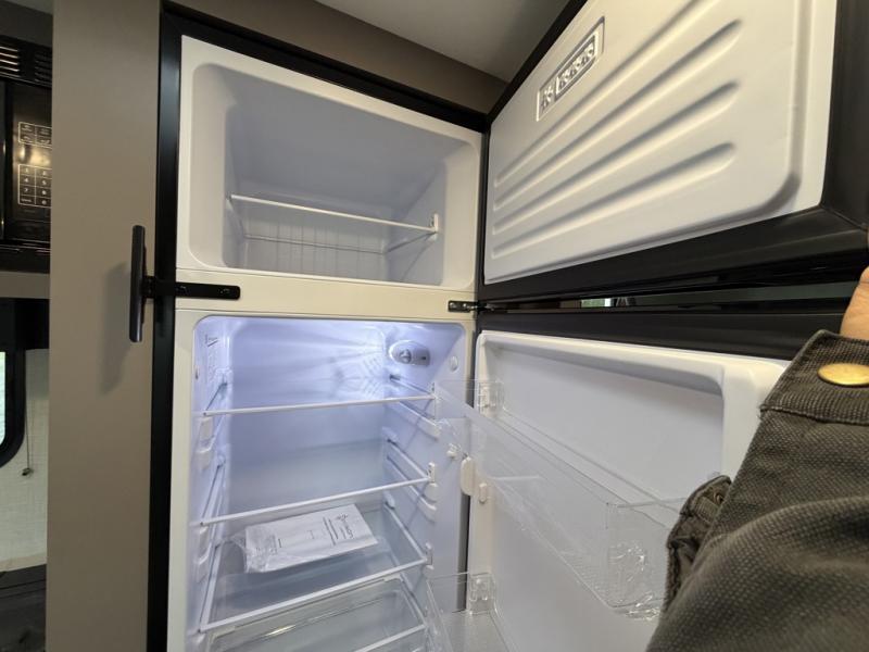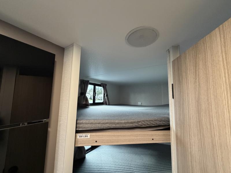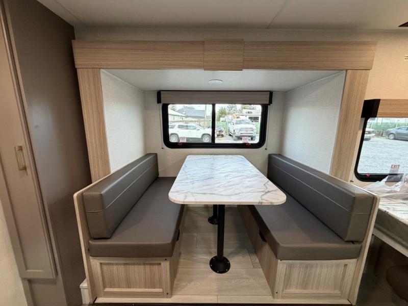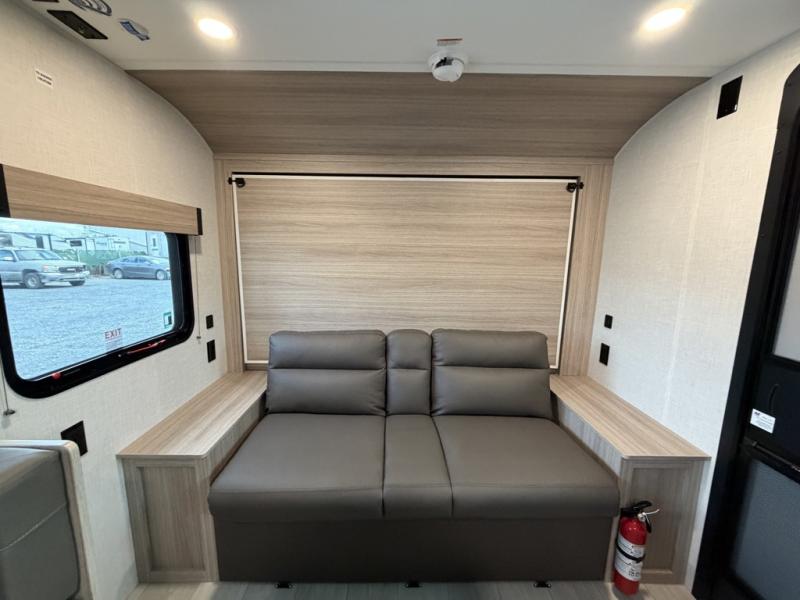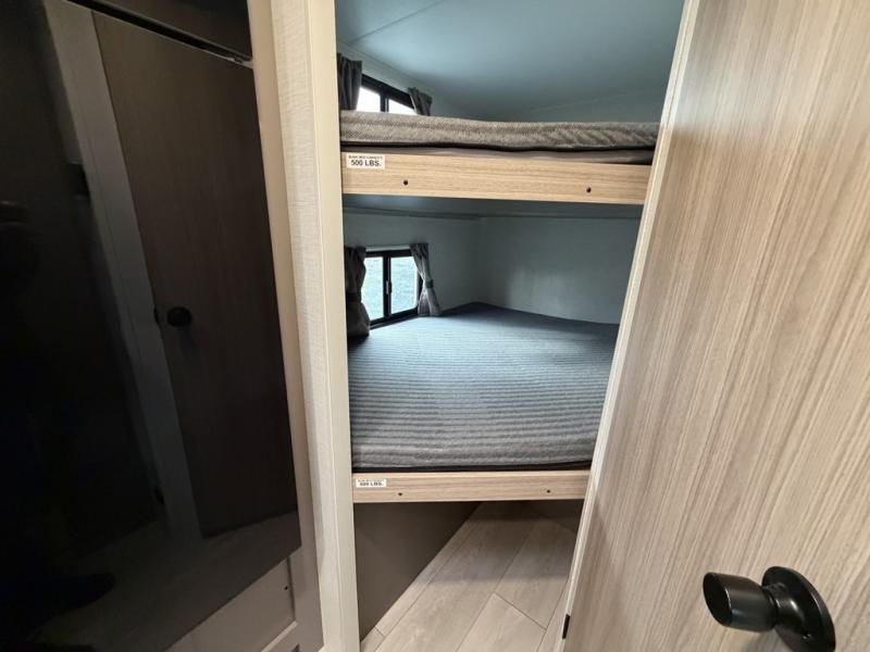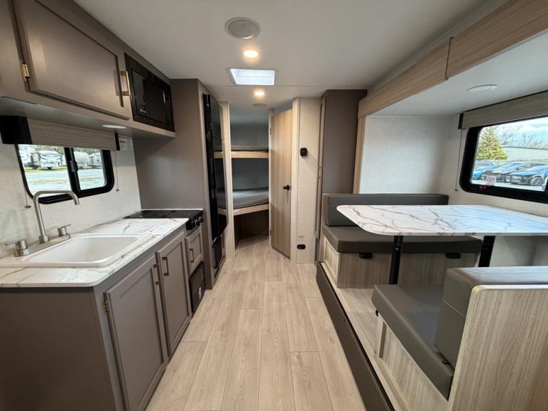 The spacious double-size bunk beds are perfect for families or groups, providing ample sleeping space for a restful night's sleep. There is a 60” jiffy sofa and a murphy bed that offers additional sleeping space or a comfortable spot to relax, making it ideal for families or couples. Further, the cozy booth dinette is a perfect spot for meals or playing board games, creating lasting memories with loved ones. In the kitchen area, the 12V refrigerator keeps your food and drinks fresh, while the microwave provides a convenient way to prepare meals on the go. And after a long day, the full bathroom will be a haven for convenience and comfort, featuring everything you need to freshen up on the go.