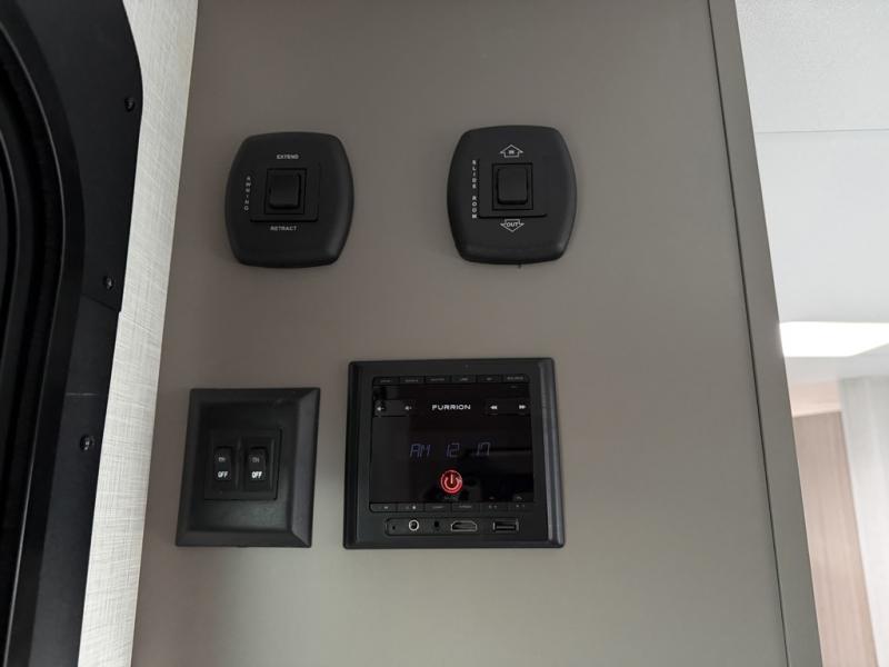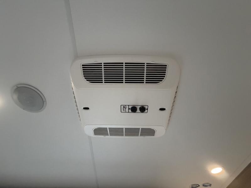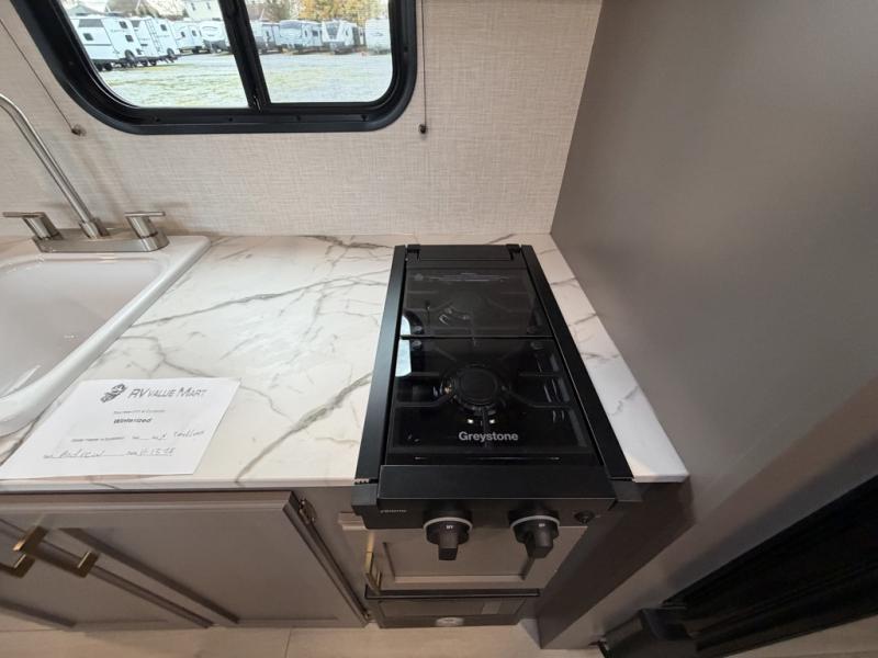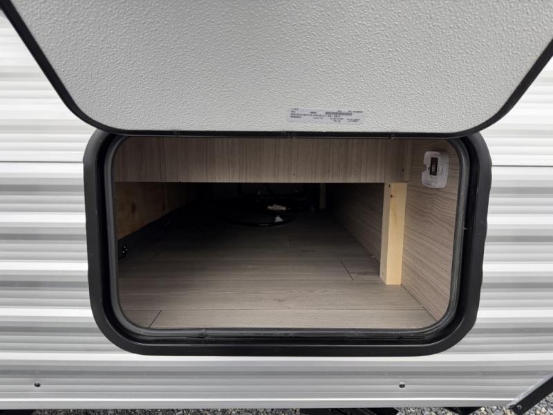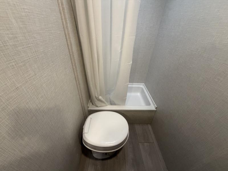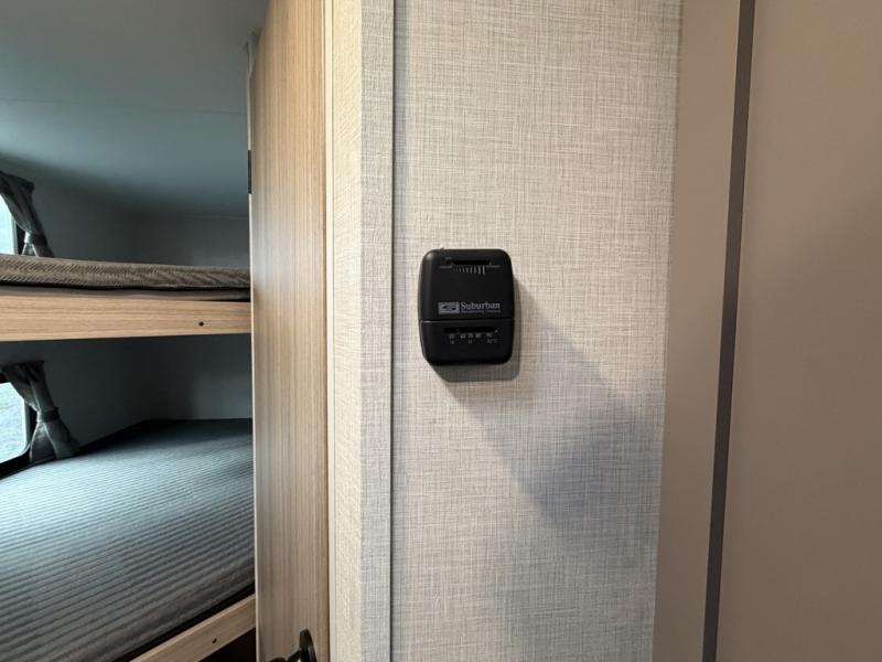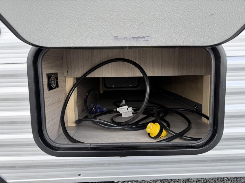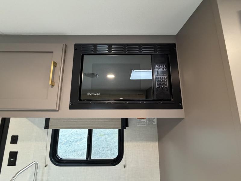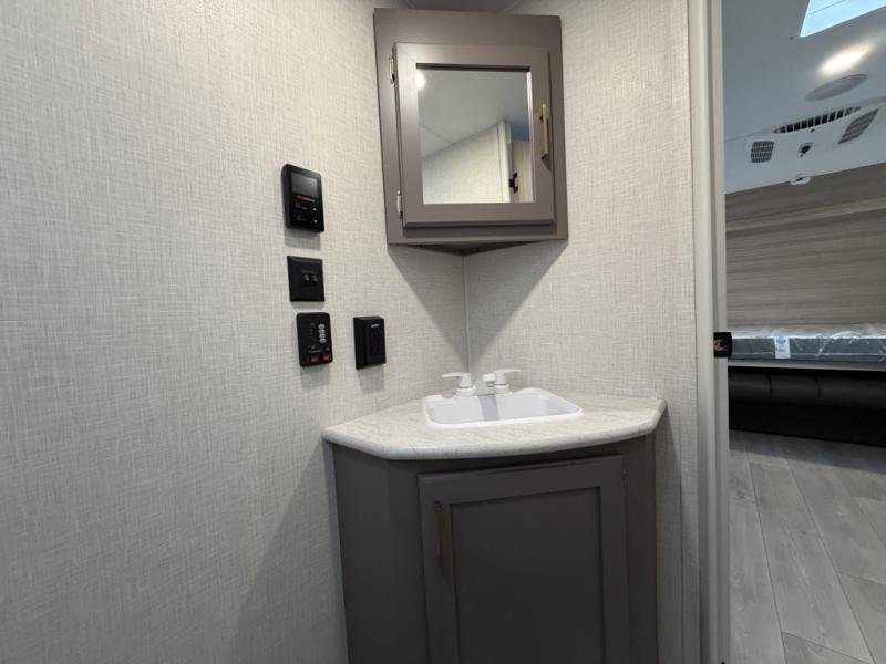 The spacious double-size bunk beds are perfect for families or groups, providing ample sleeping space for a restful night's sleep. There is a 60” jiffy sofa and a murphy bed that offers additional sleeping space or a comfortable spot to relax, making it ideal for families or couples. Further, the cozy booth dinette is a perfect spot for meals or playing board games, creating lasting memories with loved ones. In the kitchen area, the 12V refrigerator keeps your food and drinks fresh, while the microwave provides a convenient way to prepare meals on the go. And after a long day, the full bathroom will be a haven for convenience and comfort, featuring everything you need to freshen up on the go.