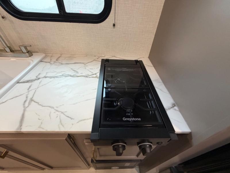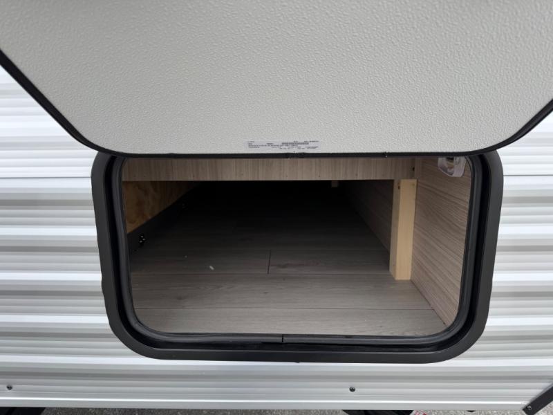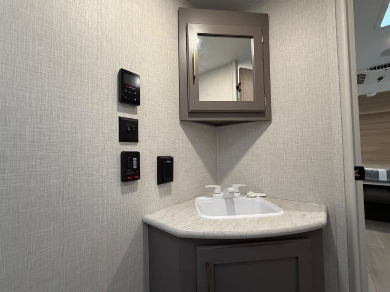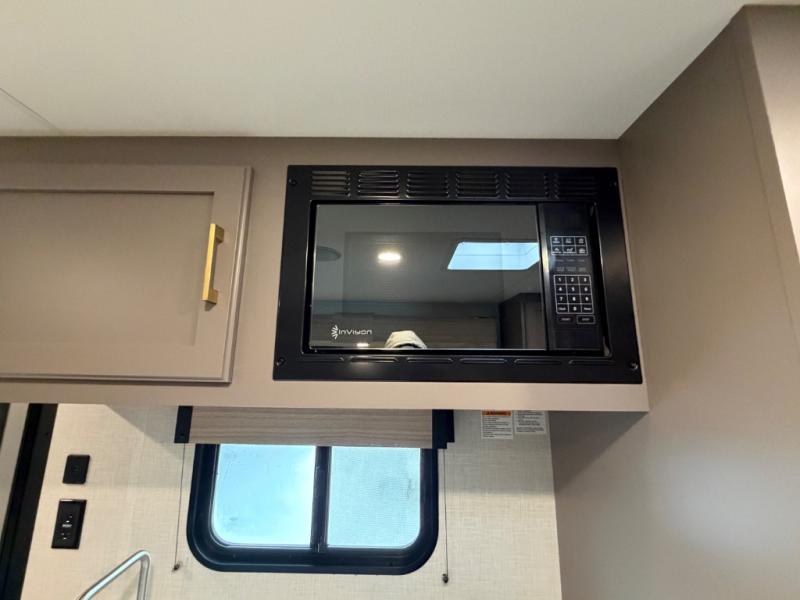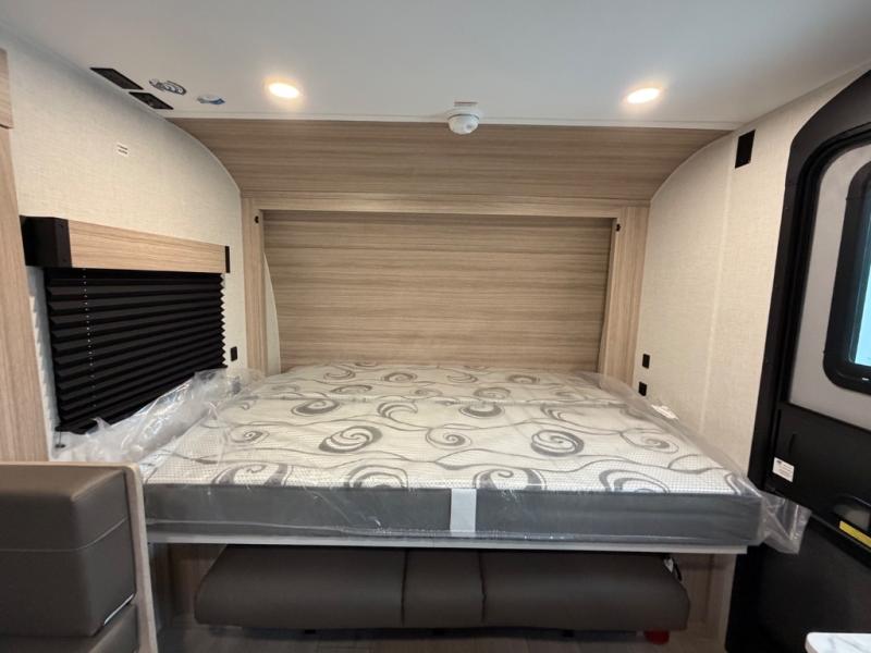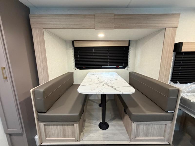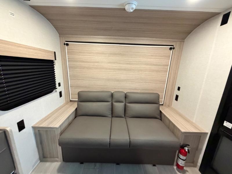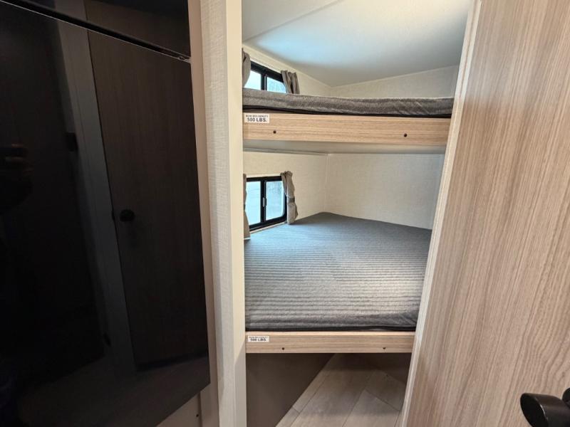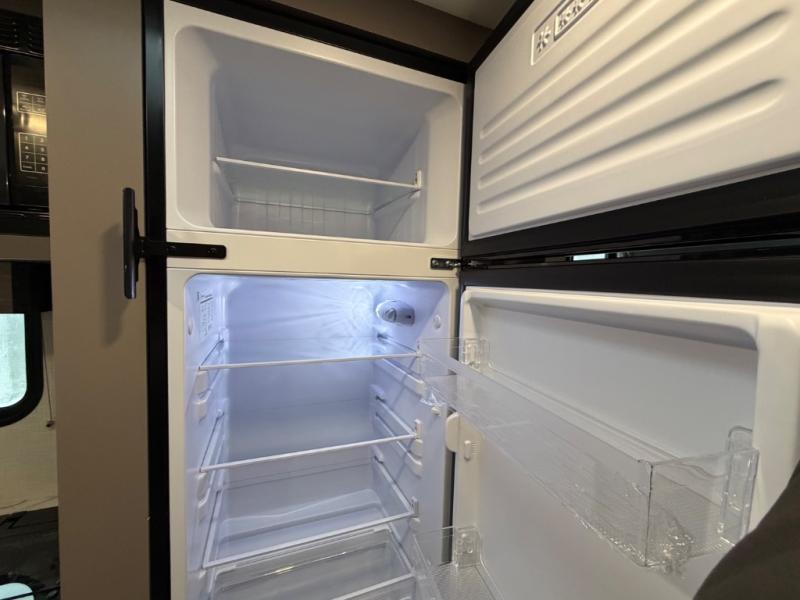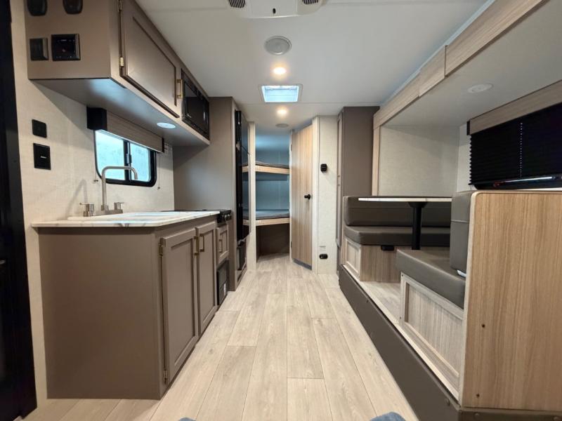 The spacious double-size bunk beds are perfect for families or groups, providing ample sleeping space for a restful night's sleep. There is a 60” jiffy sofa and a murphy bed that offers additional sleeping space or a comfortable spot to relax, making it ideal for families or couples. Further, the cozy booth dinette is a perfect spot for meals or playing board games, creating lasting memories with loved ones. In the kitchen area, the 12V refrigerator keeps your food and drinks fresh, while the microwave provides a convenient way to prepare meals on the go. And after a long day, the full bathroom will be a haven for convenience and comfort, featuring everything you need to freshen up on the go.