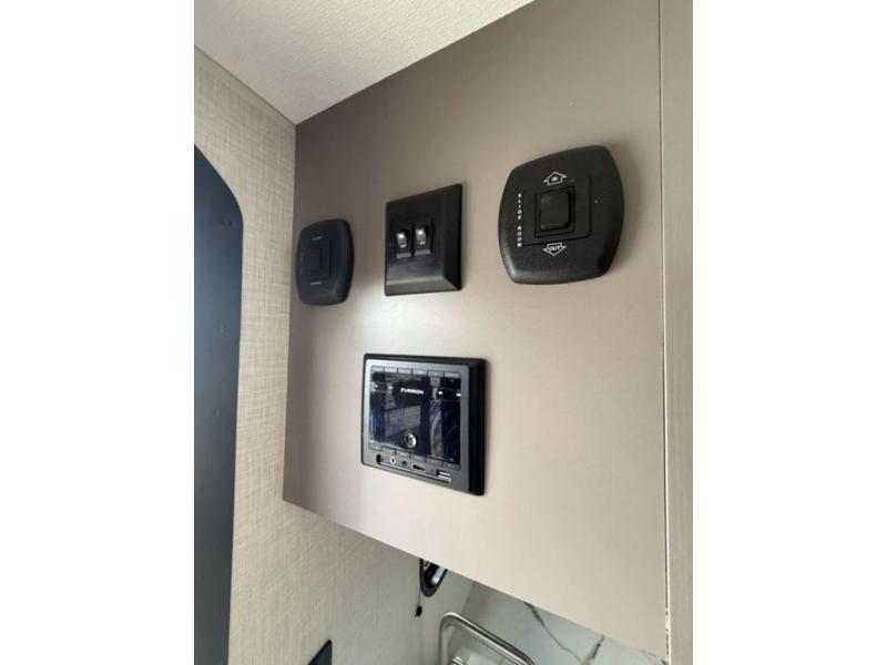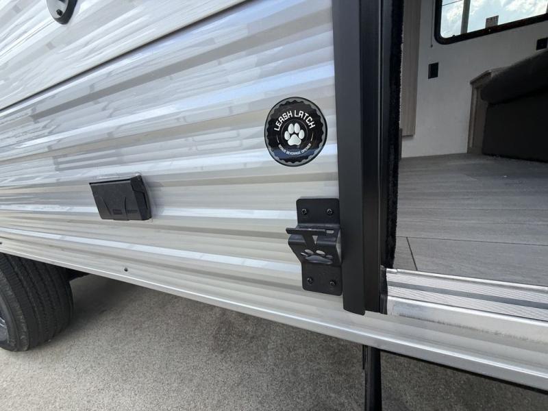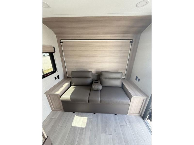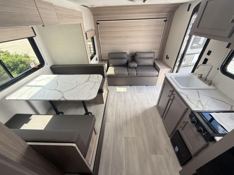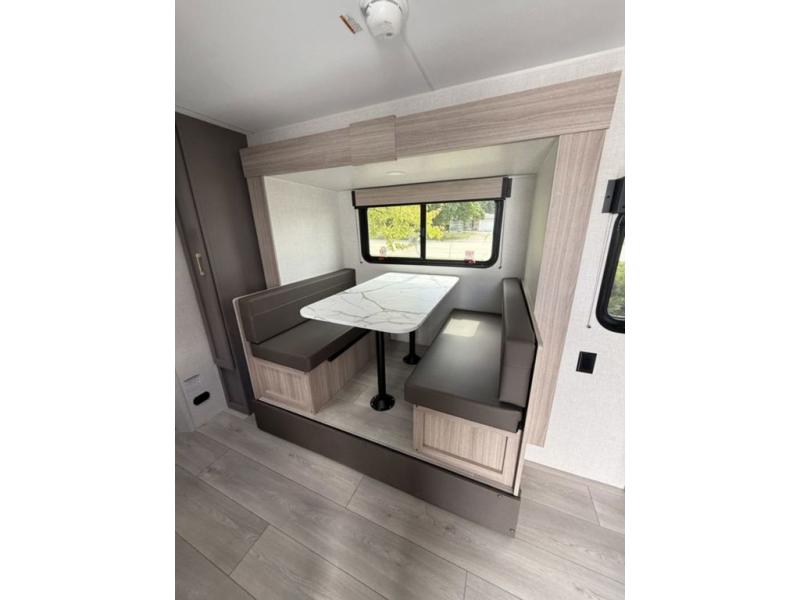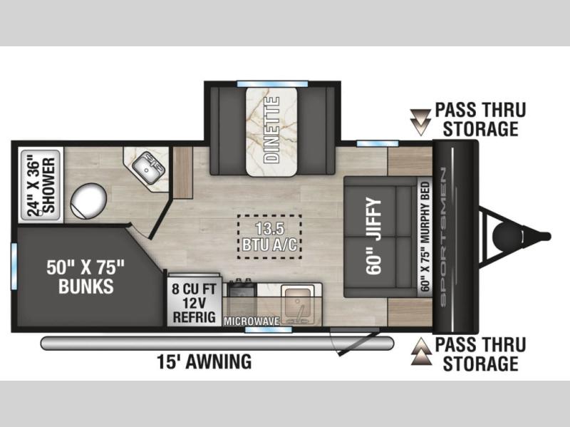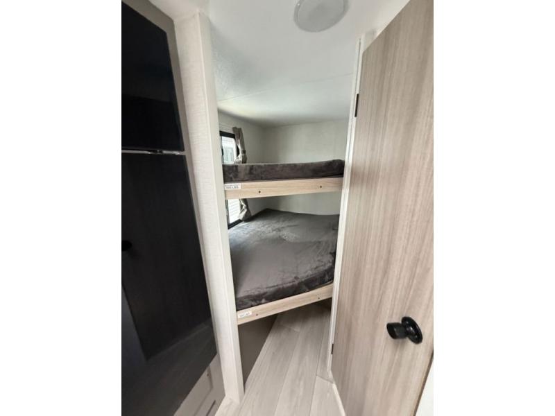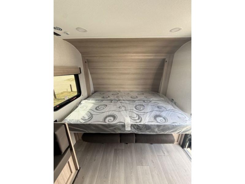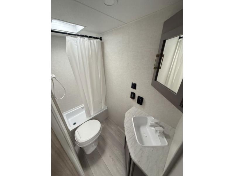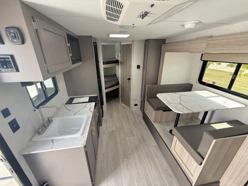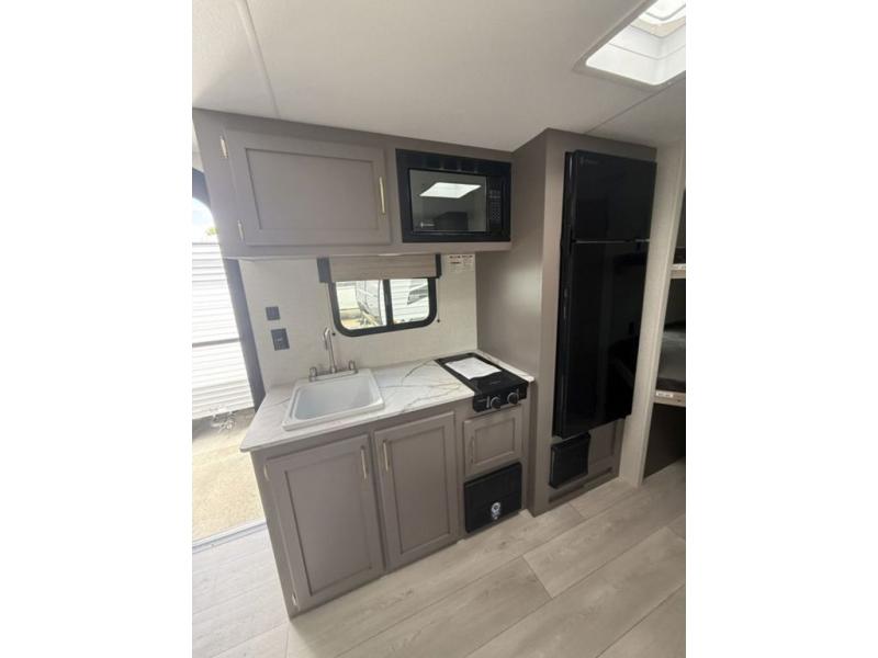 The spacious double-size bunk beds are perfect for families or groups, providing ample sleeping space for a restful night's sleep. There is a 60” jiffy sofa and a murphy bed that offers additional sleeping space or a comfortable spot to relax, making it ideal for families or couples. Further, the cozy booth dinette is a perfect spot for meals or playing board games, creating lasting memories with loved ones. In the kitchen area, the 12V refrigerator keeps your food and drinks fresh, while the microwave provides a convenient way to prepare meals on the go. And after a long day, the full bathroom will be a haven for convenience and comfort, featuring everything you need to freshen up on the go.