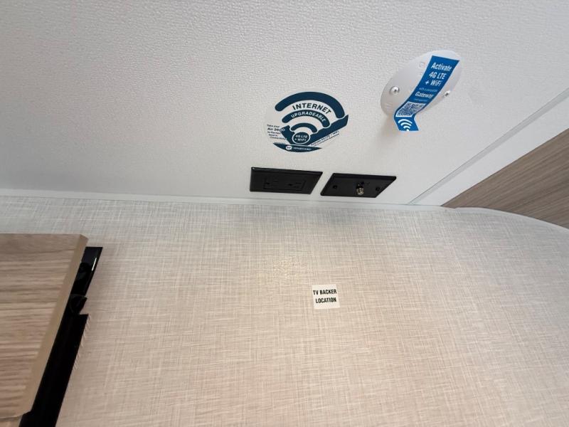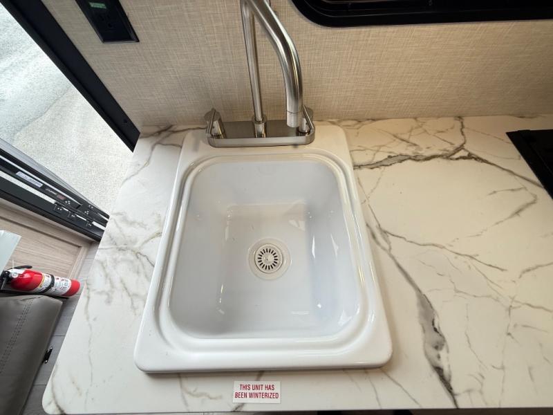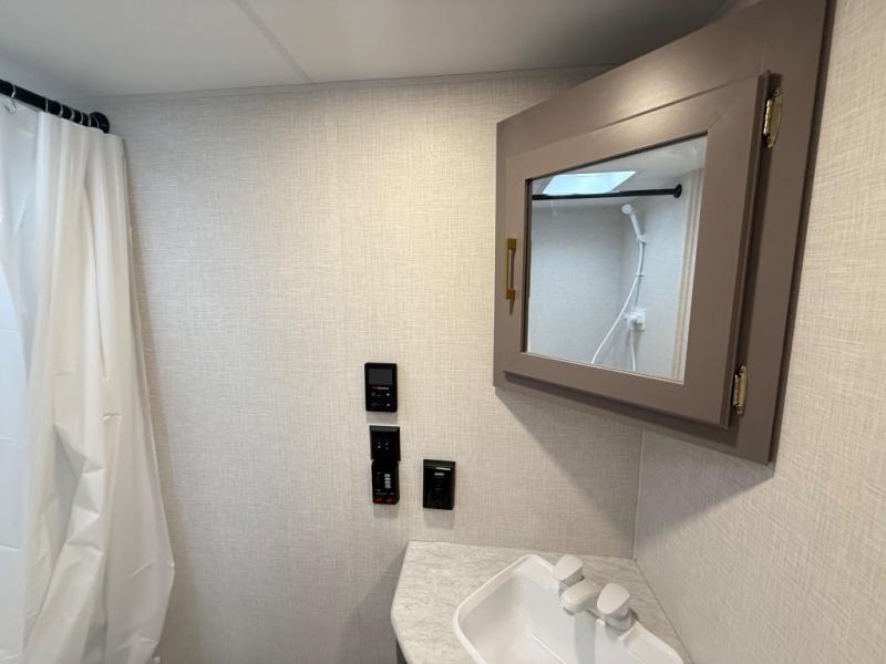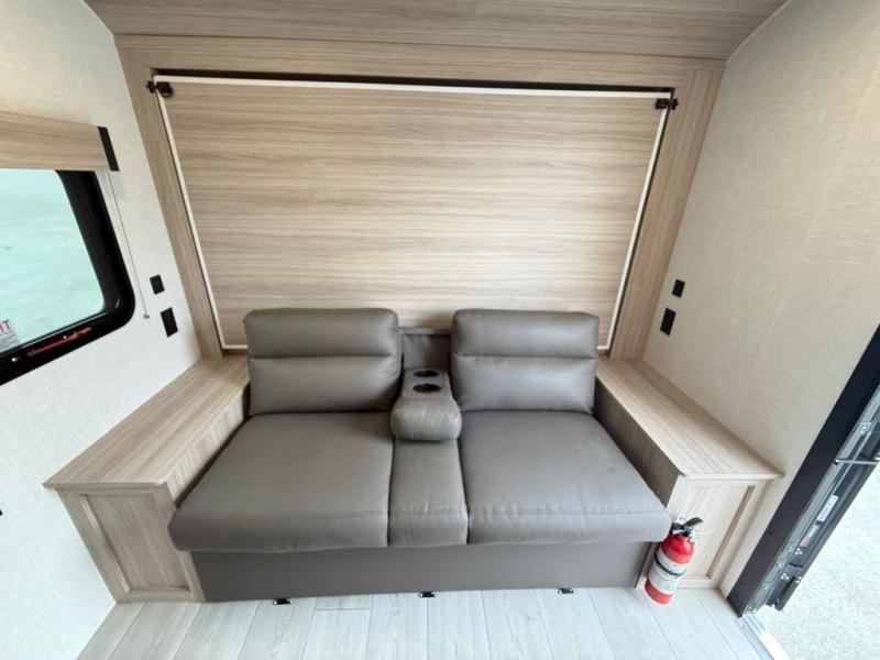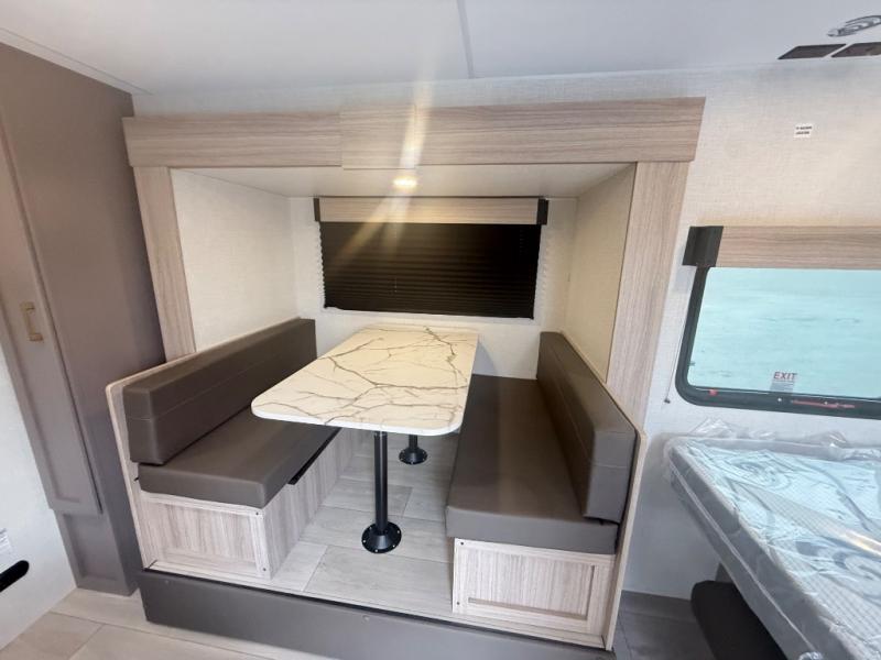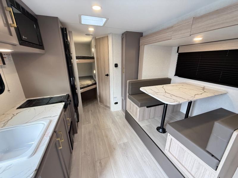 The spacious double-size bunk beds are perfect for families or groups, providing ample sleeping space for a restful night's sleep. There is a 60” jiffy sofa and a murphy bed that offers additional sleeping space or a comfortable spot to relax, making it ideal for families or couples. Further, the cozy booth dinette is a perfect spot for meals or playing board games, creating lasting memories with loved ones. In the kitchen area, the 12V refrigerator keeps your food and drinks fresh, while the microwave provides a convenient way to prepare meals on the go. And after a long day, the full bathroom will be a haven for convenience and comfort, featuring everything you need to freshen up on the go.