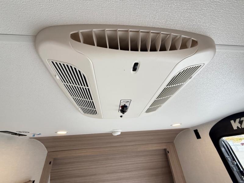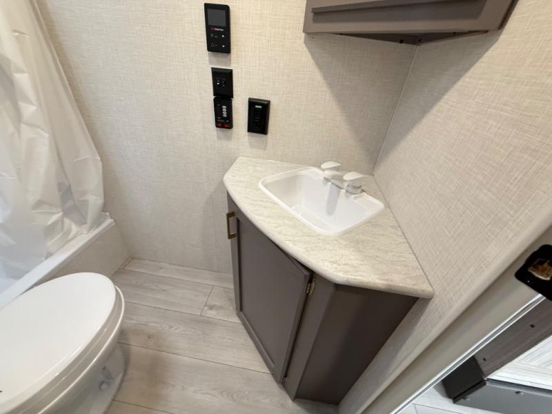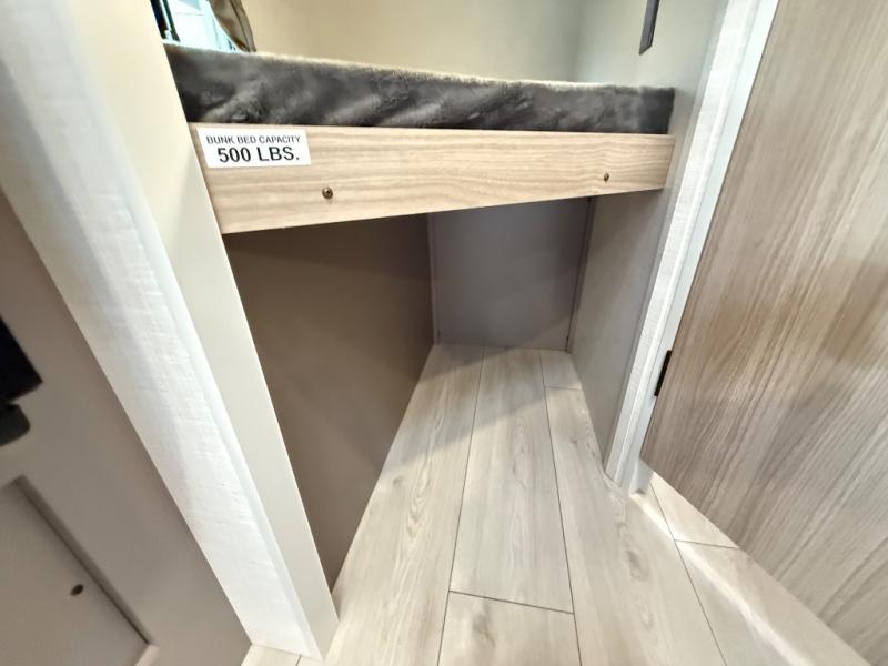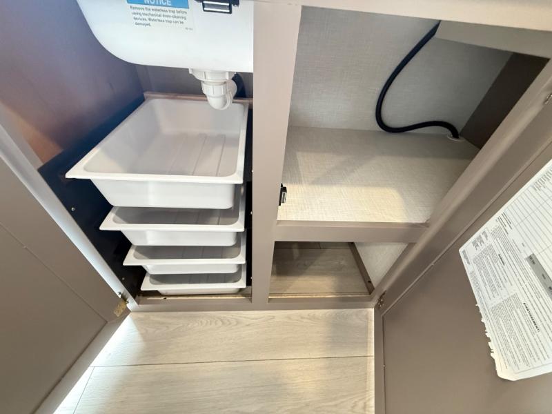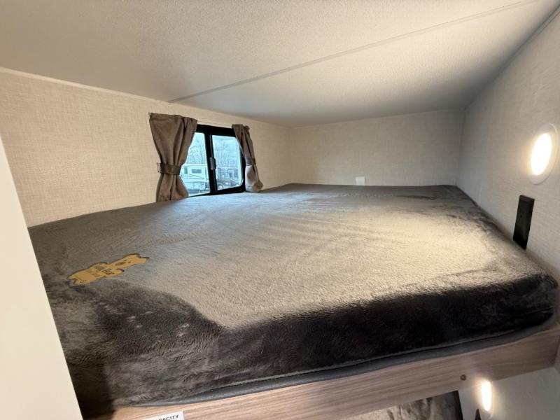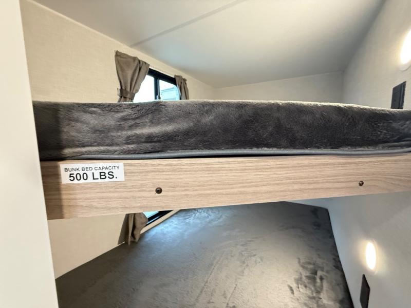 The spacious double-size bunk beds are perfect for families or groups, providing ample sleeping space for a restful night's sleep. There is a 60” jiffy sofa and a murphy bed that offers additional sleeping space or a comfortable spot to relax, making it ideal for families or couples. Further, the cozy booth dinette is a perfect spot for meals or playing board games, creating lasting memories with loved ones. In the kitchen area, the 12V refrigerator keeps your food and drinks fresh, while the microwave provides a convenient way to prepare meals on the go. And after a long day, the full bathroom will be a haven for convenience and comfort, featuring everything you need to freshen up on the go.