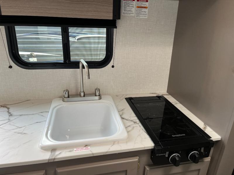 Bunk beds make this travel trailer the perfect family-friendly unit, so head to your local state park! The front 54" x 80" bed will provide comfortable sleeping space for you, plus there is a booth dinette for one or two little ones to sleep on. This model includes a two burner cooktop, a microwave oven, plus a single bowl sink for hassle-free clean up. The 13' power awning will protect you from the elements, and the pass-through storage will be perfect for fishing poles.