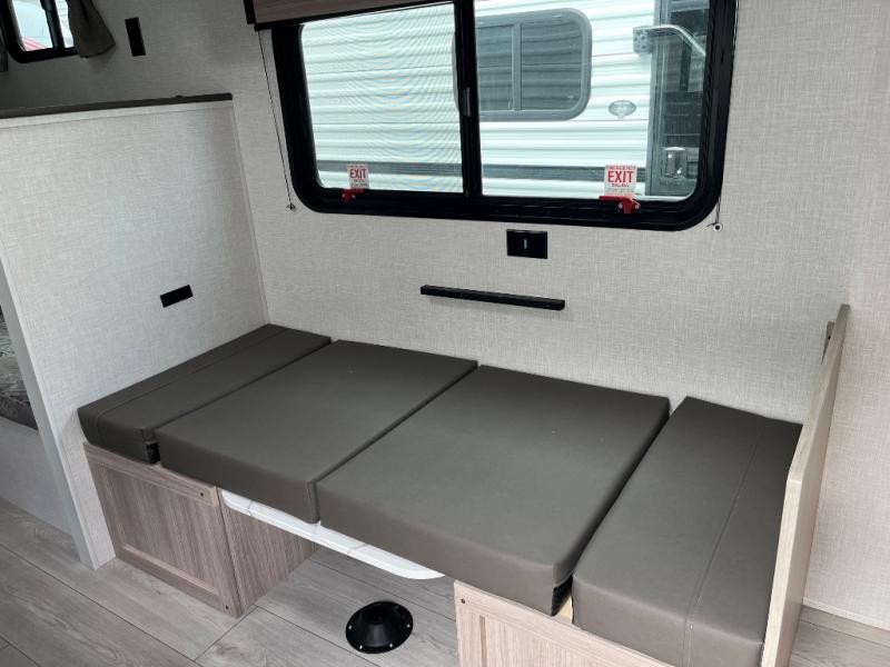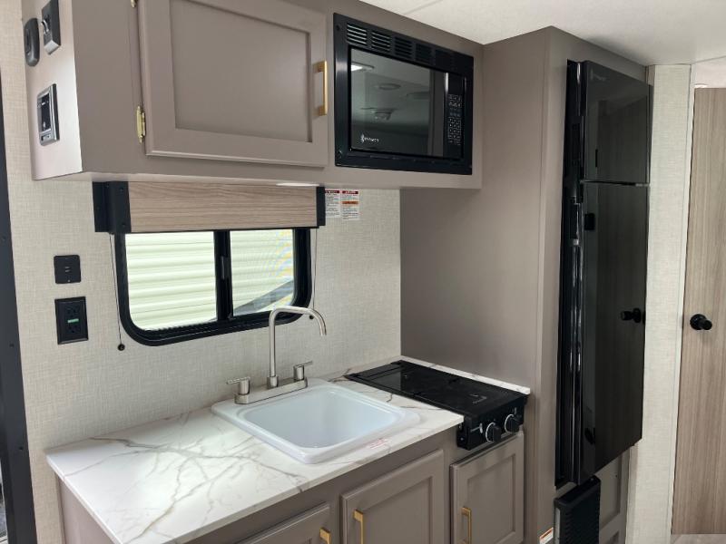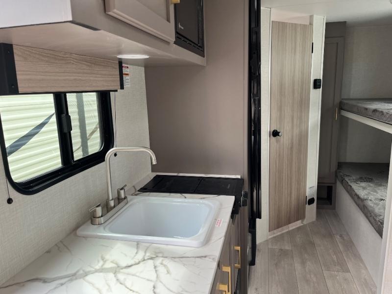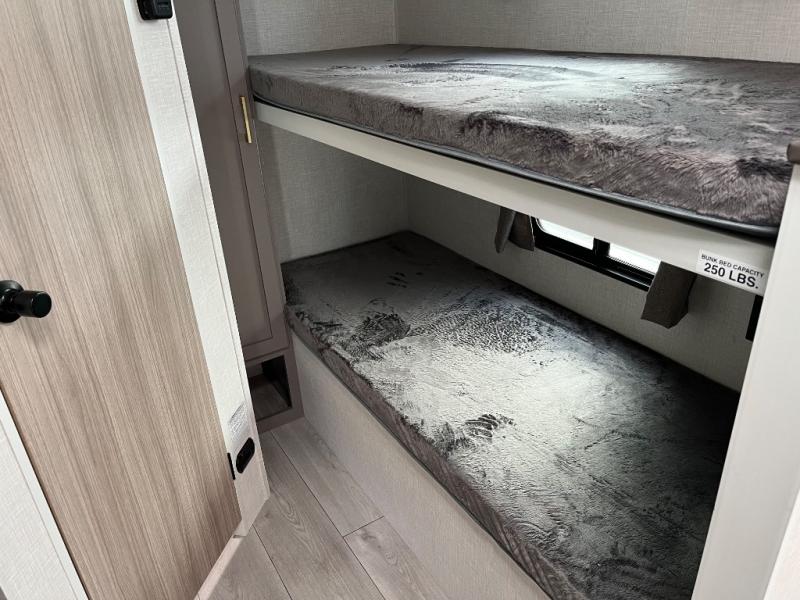 Bunk beds make this travel trailer the perfect family-friendly unit, so head to your local state park! The front 54" x 80" bed will provide comfortable sleeping space for you, plus there is a booth dinette for one or two little ones to sleep on. This model includes a two burner cooktop, a microwave oven, plus a single bowl sink for hassle-free clean up. The 13' power awning will protect you from the elements, and the pass-through storage will be perfect for fishing poles.