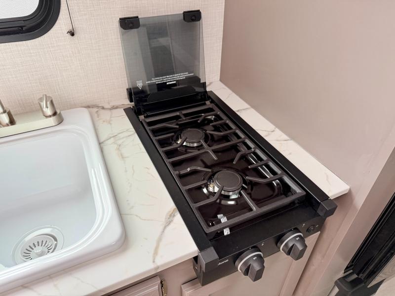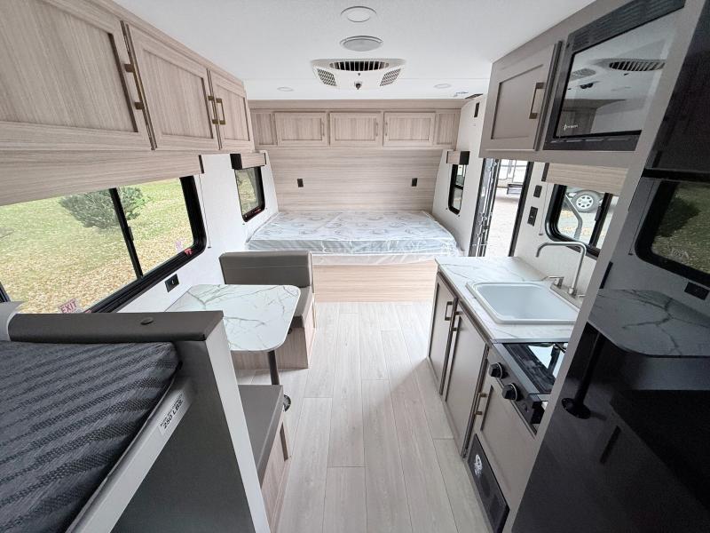 Bunk beds make this travel trailer the perfect family-friendly unit, so head to your local state park! The front 54" x 80" bed will provide comfortable sleeping space for you, plus there is a booth dinette for one or two little ones to sleep on. This model includes a two burner cooktop, a microwave oven, plus a single bowl sink for hassle-free clean up. The 13' power awning will protect you from the elements, and the pass-through storage will be perfect for fishing poles.