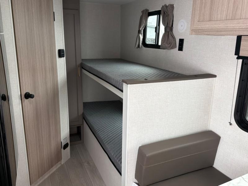 Bunk beds make this travel trailer the perfect family-friendly unit, so head to your local state park! The front 54" x 80" bed will provide comfortable sleeping space for you, plus there is a booth dinette for one or two little ones to sleep on. This model includes a two burner cooktop, a microwave oven, plus a single bowl sink for hassle-free clean up. The 13' power awning will protect you from the elements, and the pass-through storage will be perfect for fishing poles.