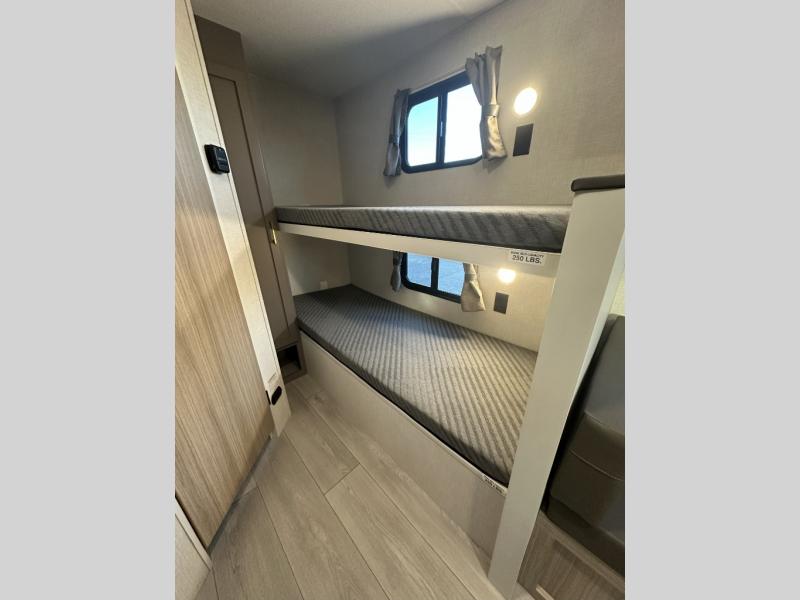 Bunk beds make this travel trailer the perfect family-friendly unit, so head to your local state park! The front 54" x 80" bed will provide comfortable sleeping space for you, plus there is a booth dinette for one or two little ones to sleep on. This model includes a two burner cooktop, a microwave oven, plus a single bowl sink for hassle-free clean up. The 13' power awning will protect you from the elements, and the pass-through storage will be perfect for fishing poles.