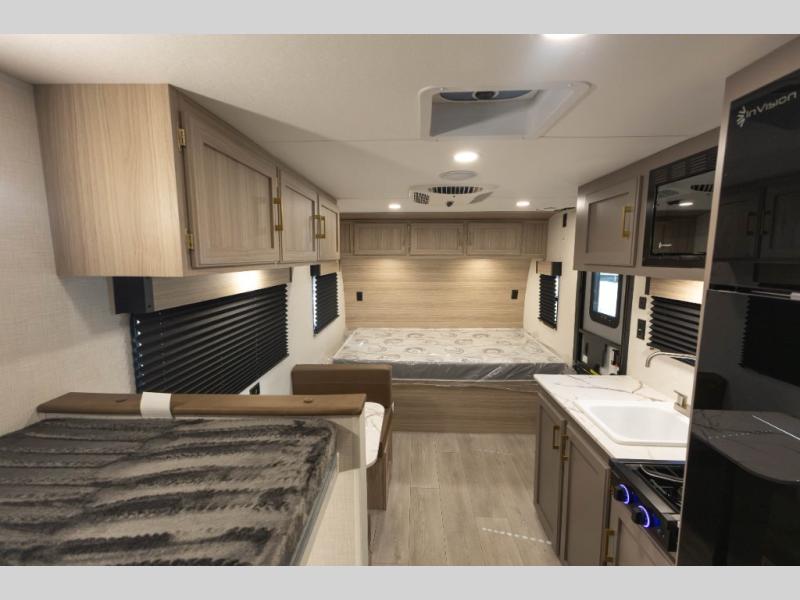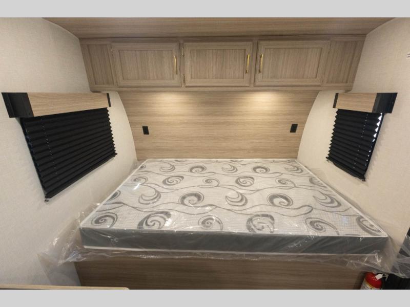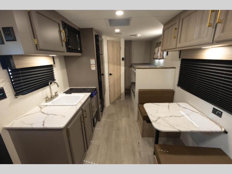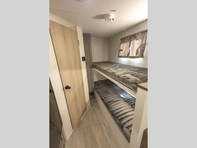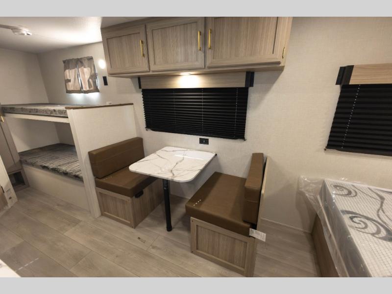 Bunk beds make this travel trailer the perfect family-friendly unit, so head to your local state park! The front 54" x 80" bed will provide comfortable sleeping space for you, plus there is a booth dinette for one or two little ones to sleep on. This model includes a two burner cooktop, a microwave oven, plus a single bowl sink for hassle-free clean up. The 13' power awning will protect you from the elements, and the pass-through storage will be perfect for fishing poles.