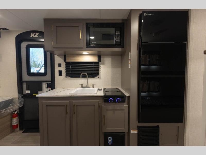 With any Sportsmen Classis travel trailer by KZ you will find durable construction materials, like the 3/8" fully-walkable roof and the one-piece seamless Tufflex material. Each model includes scissor-style stabilizer jacks, a Key-Alike program for baggage and entry doors, and a Leash Latch with a bonus beverage opener. You will find interior and exterior speakers plus backup camera prep and solar prep. The Sportsmen Classic is designed to make you feel at home with rail-style cabinet doors, residential grade linoleum, and plenty of storage space for all your belongings.