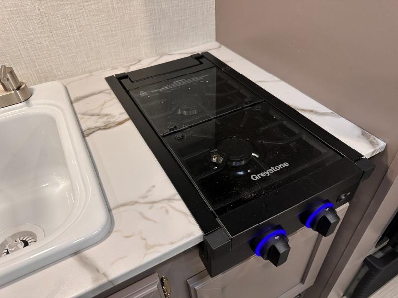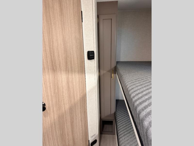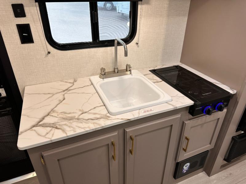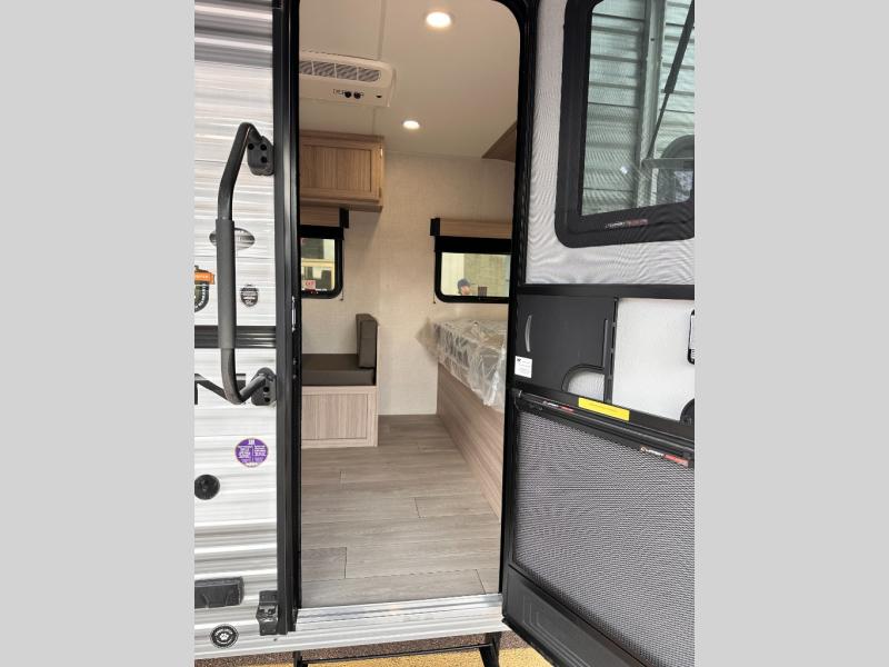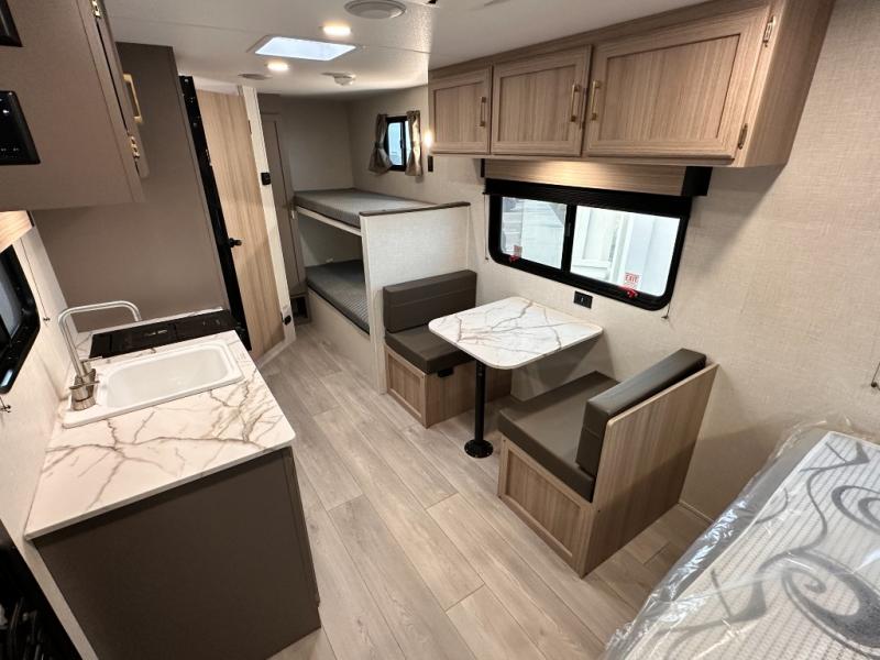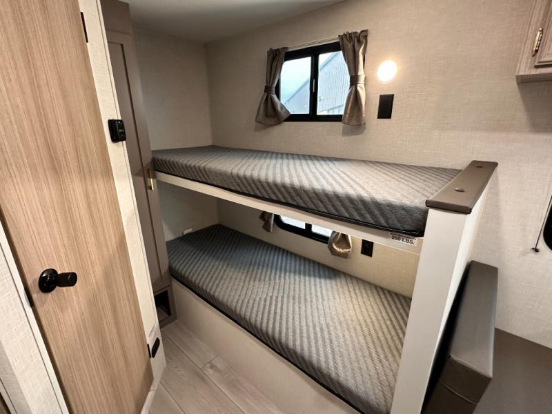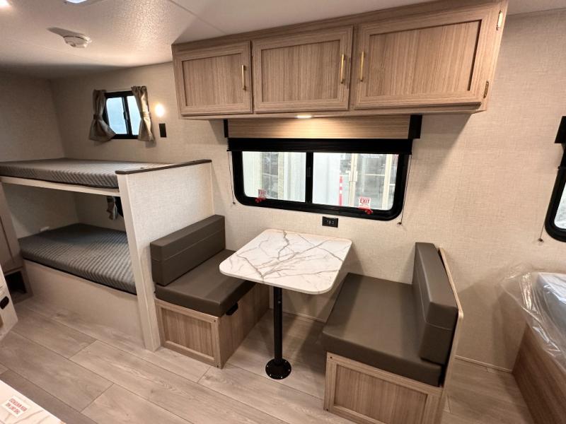 Bunk beds make this travel trailer the perfect family-friendly unit, so head to your local state park! The front 54" x 80" bed will provide comfortable sleeping space for you, plus there is a booth dinette for one or two little ones to sleep on. This model includes a two burner cooktop, a microwave oven, plus a single bowl sink for hassle-free clean up. The 13' power awning will protect you from the elements, and the pass-through storage will be perfect for fishing poles.