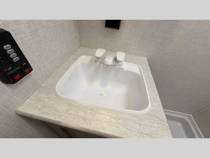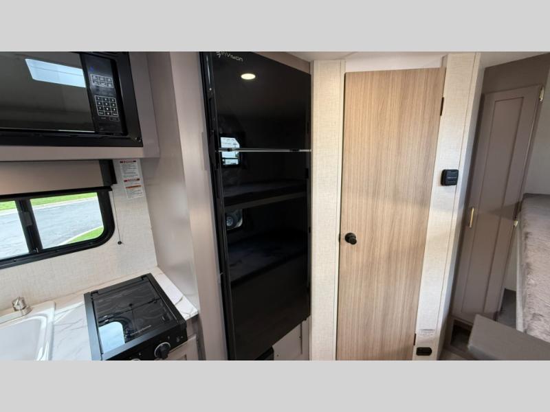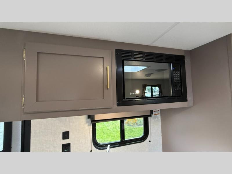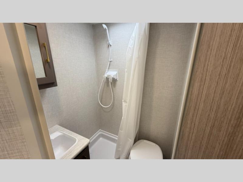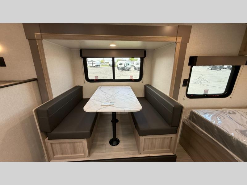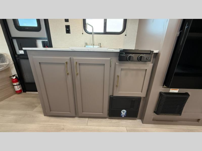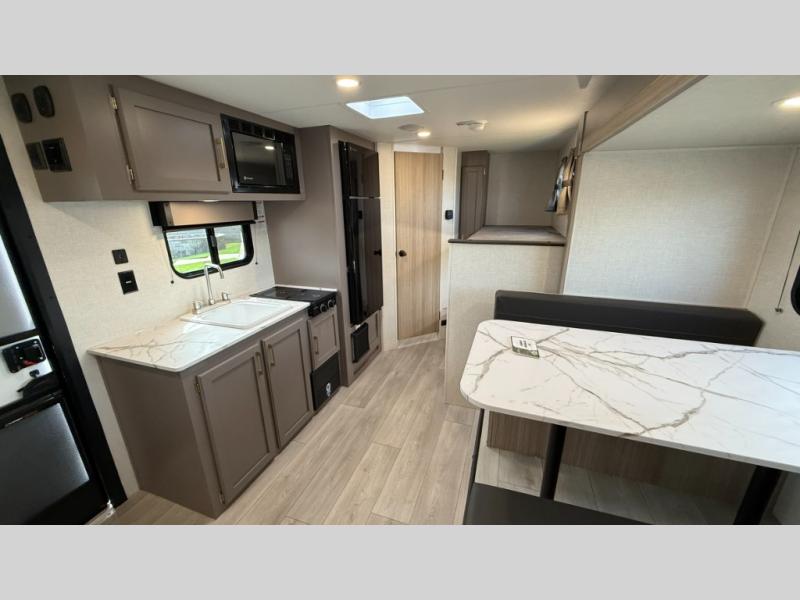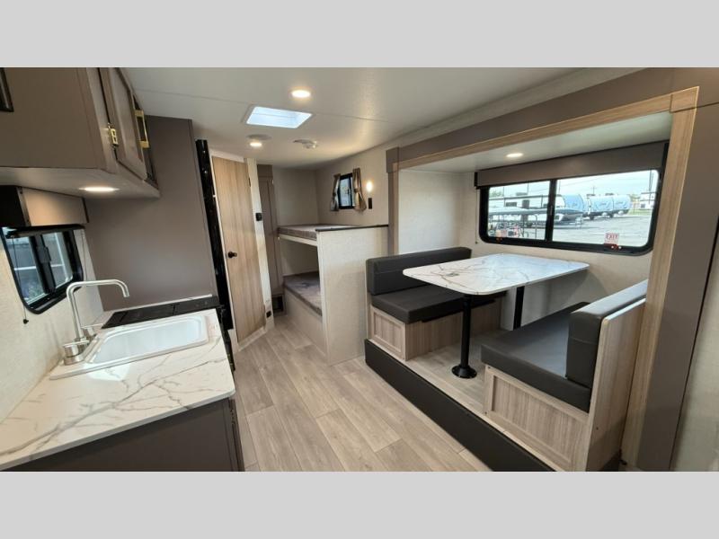 You can easily sleep five with this travel trailer thanks to the bunk beds, the front bed, and the booth dinette slide out. Whip up breakfast on the two burner cooktop with a glass cover, or use the convenient microwave oven. The 8 cu. ft. 12V refrigerator will store your perishables, and the single bowl sink allows you to keep everything clean. Start camping today with this cozy travel trailer!