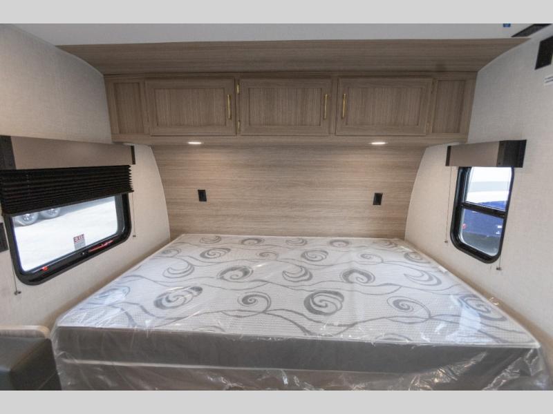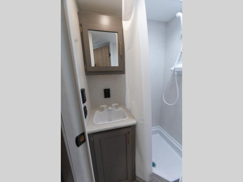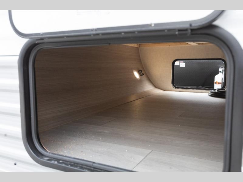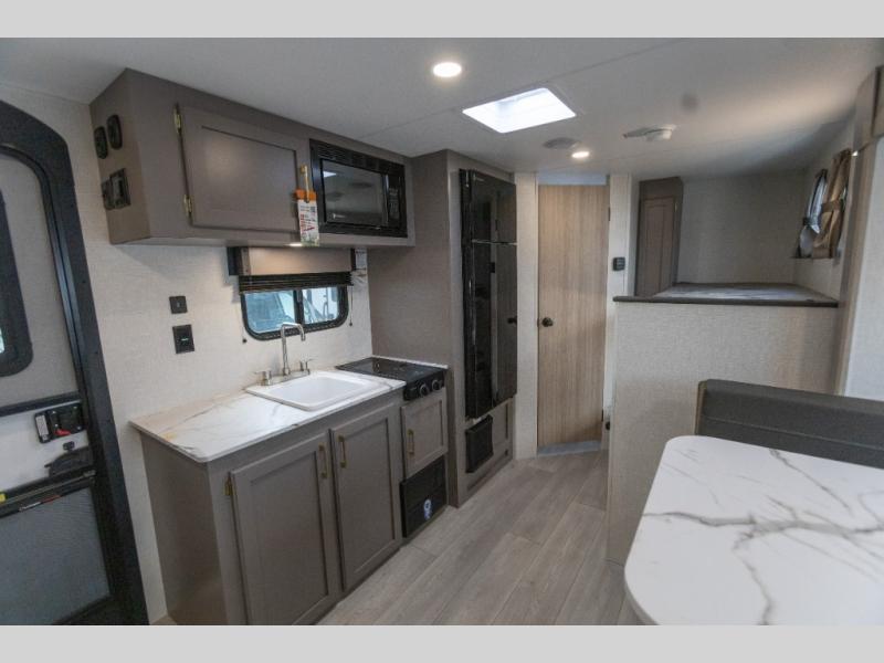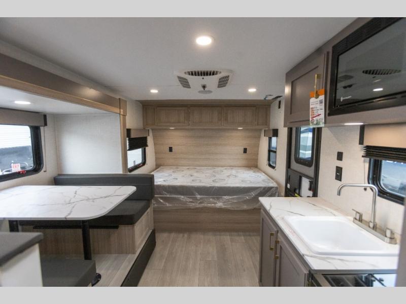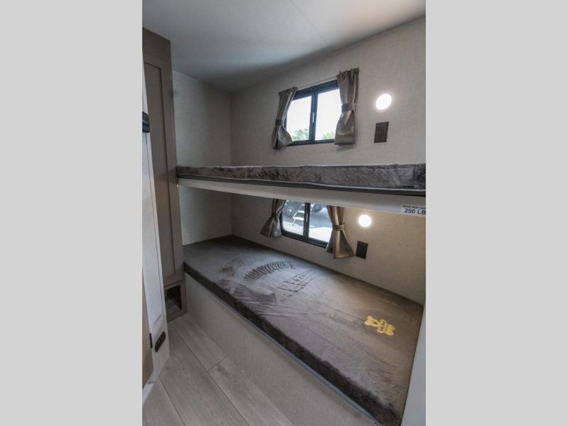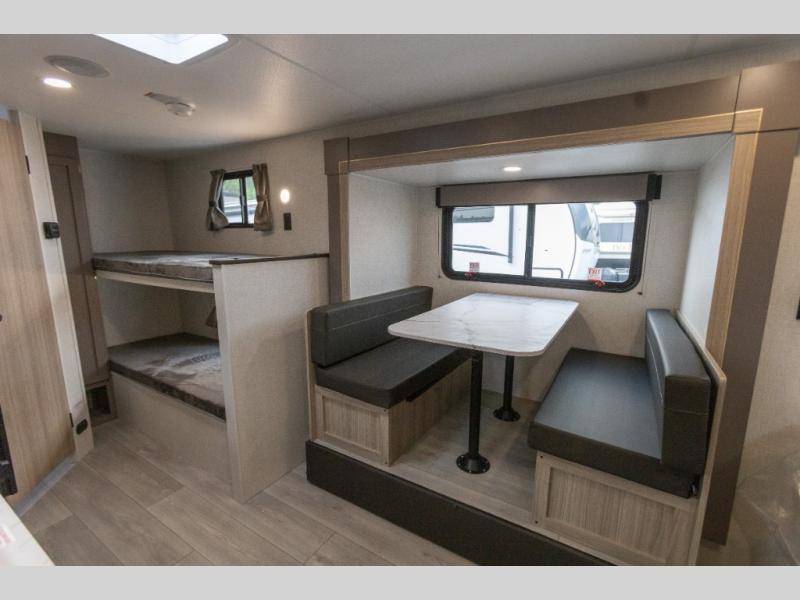 You can easily sleep five with this travel trailer thanks to the bunk beds, the front bed, and the booth dinette slide out. Whip up breakfast on the two burner cooktop with a glass cover, or use the convenient microwave oven. The 8 cu. ft. 12V refrigerator will store your perishables, and the single bowl sink allows you to keep everything clean. Start camping today with this cozy travel trailer!