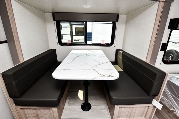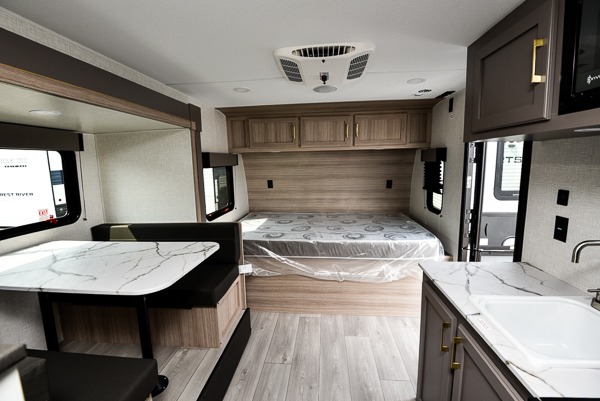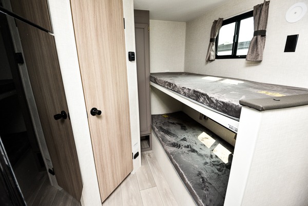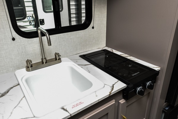 You can easily sleep five with this travel trailer thanks to the bunk beds, the front bed, and the booth dinette slide out. Whip up breakfast on the two burner cooktop with a glass cover, or use the convenient microwave oven. The 8 cu. ft. 12V refrigerator will store your perishables, and the single bowl sink allows you to keep everything clean. Start camping today with this cozy travel trailer!