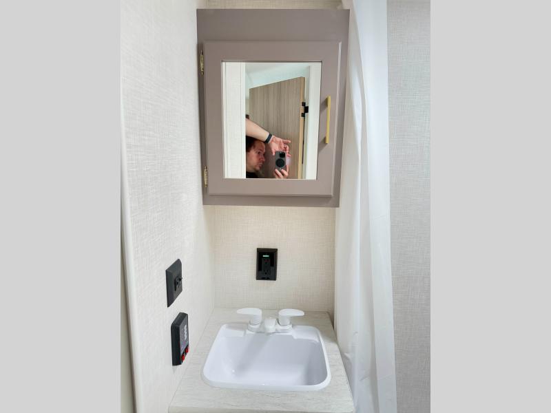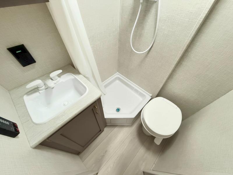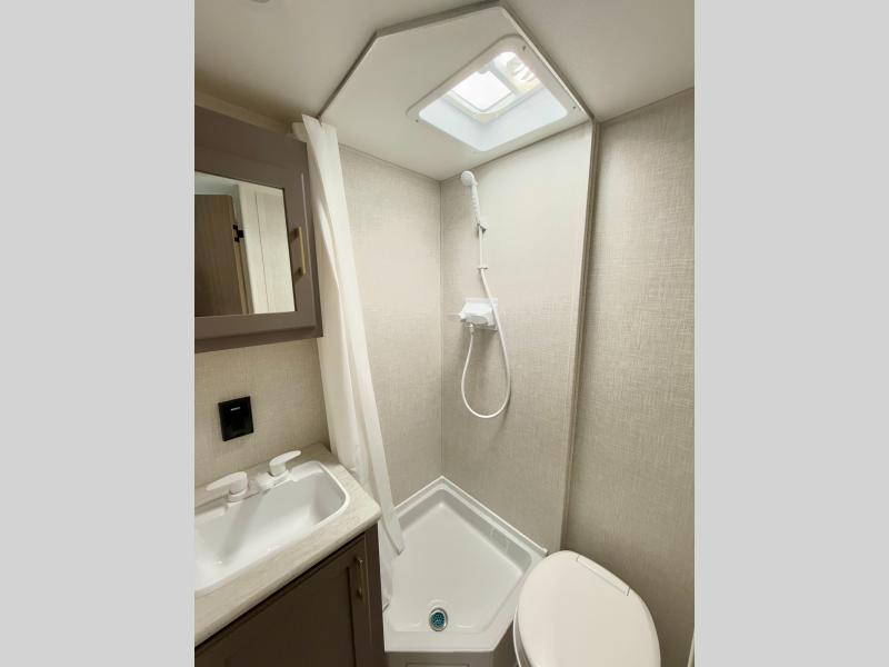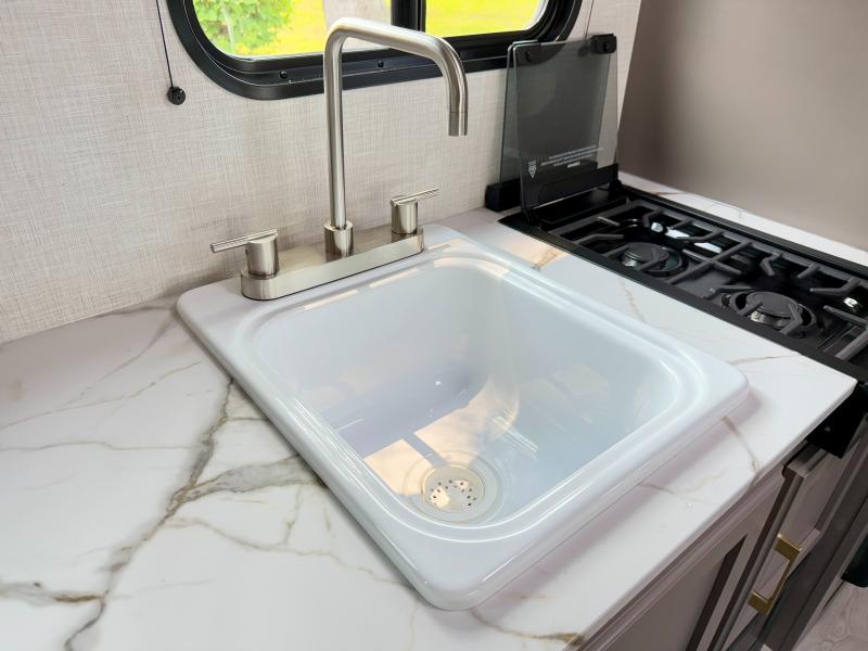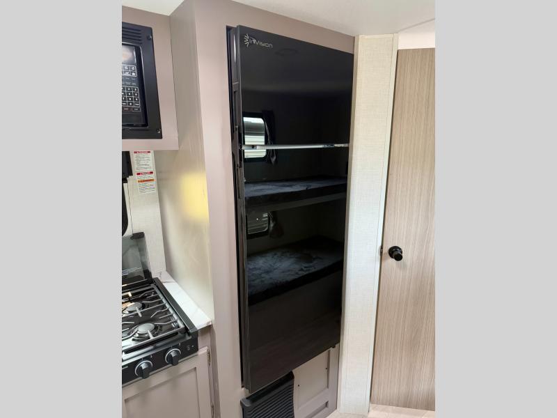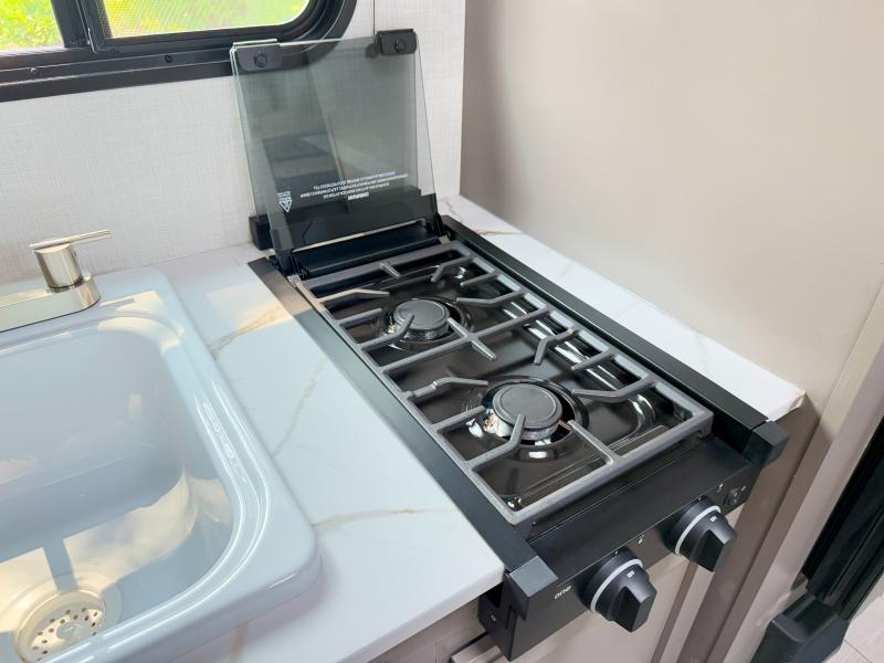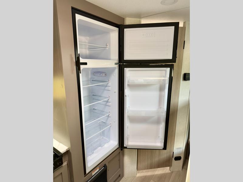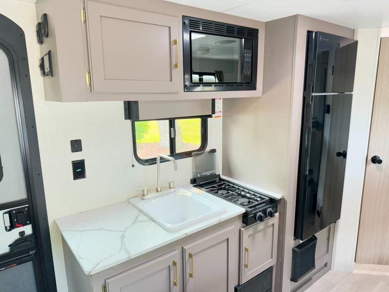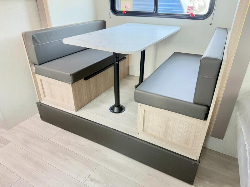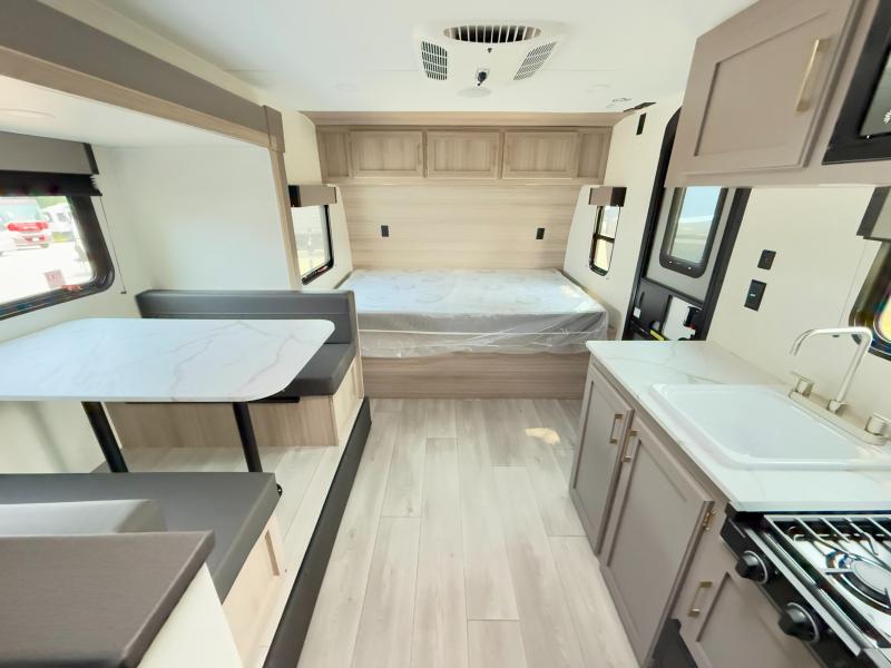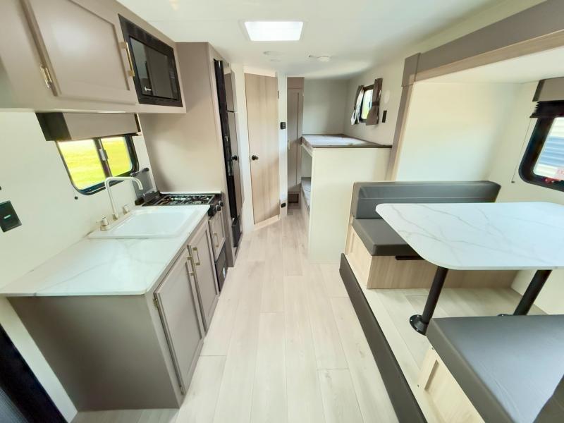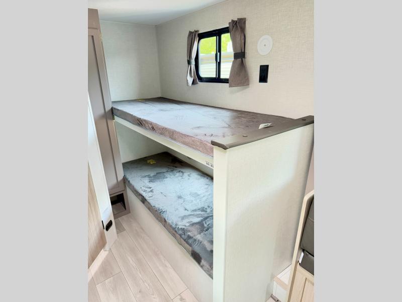You can easily sleep five with this travel trailer thanks to the bunk beds, the front bed, and the booth dinette slide out. Whip up breakfast on the two burner cooktop with a glass cover, or use the convenient microwave oven. The 8 cu. ft. 12V refrigerator will store your perishables, and the single bowl sink allows you to keep everything clean. Start camping today with this cozy travel trailer!