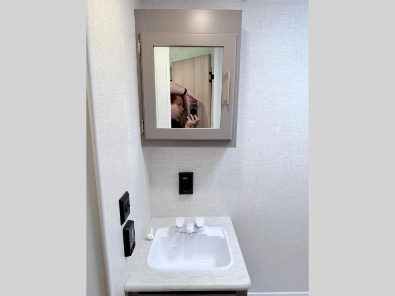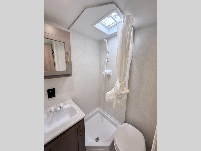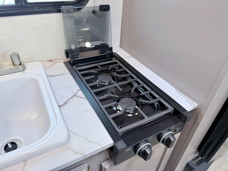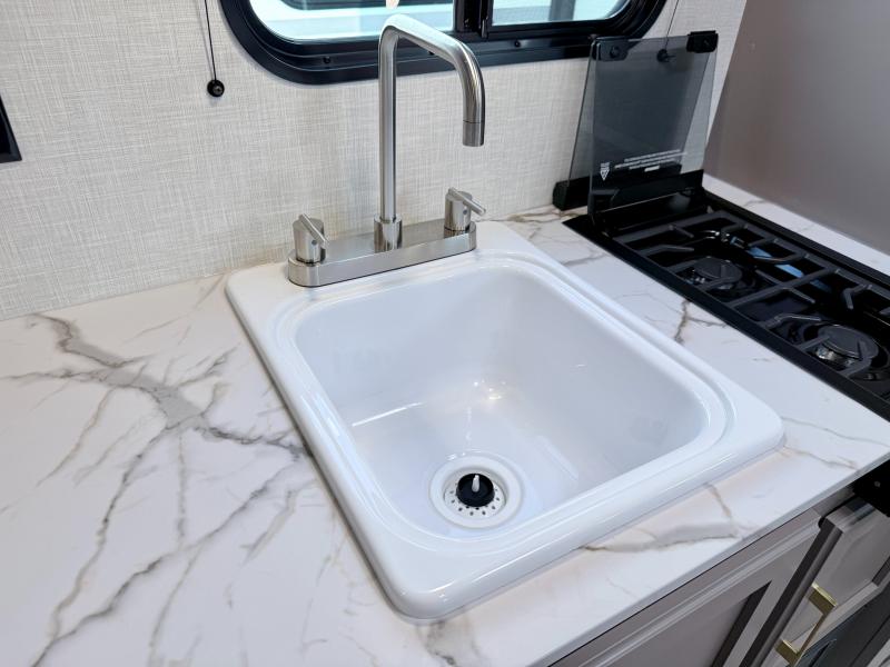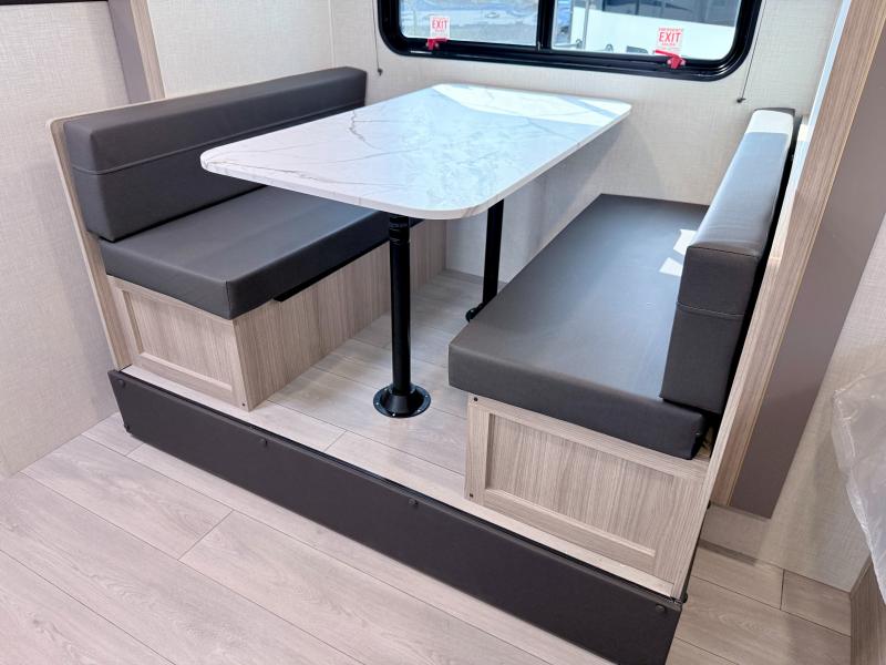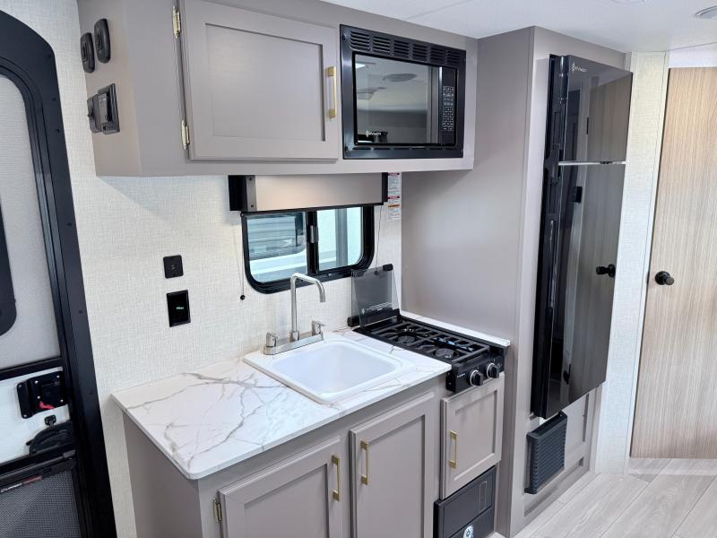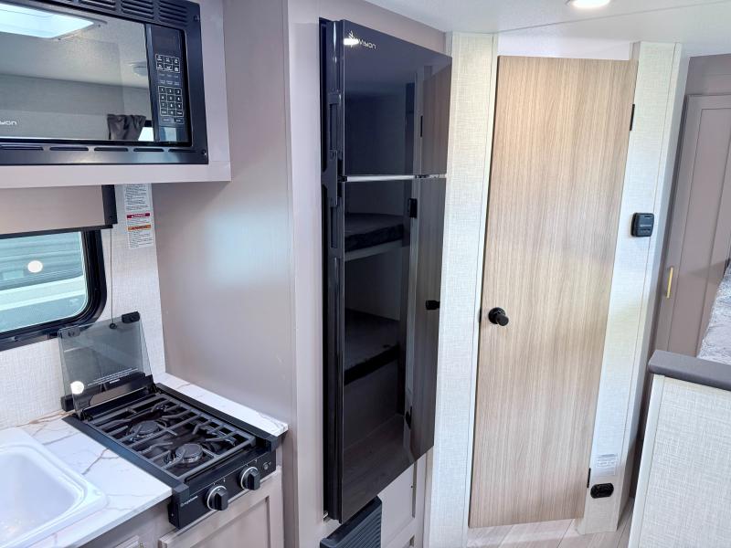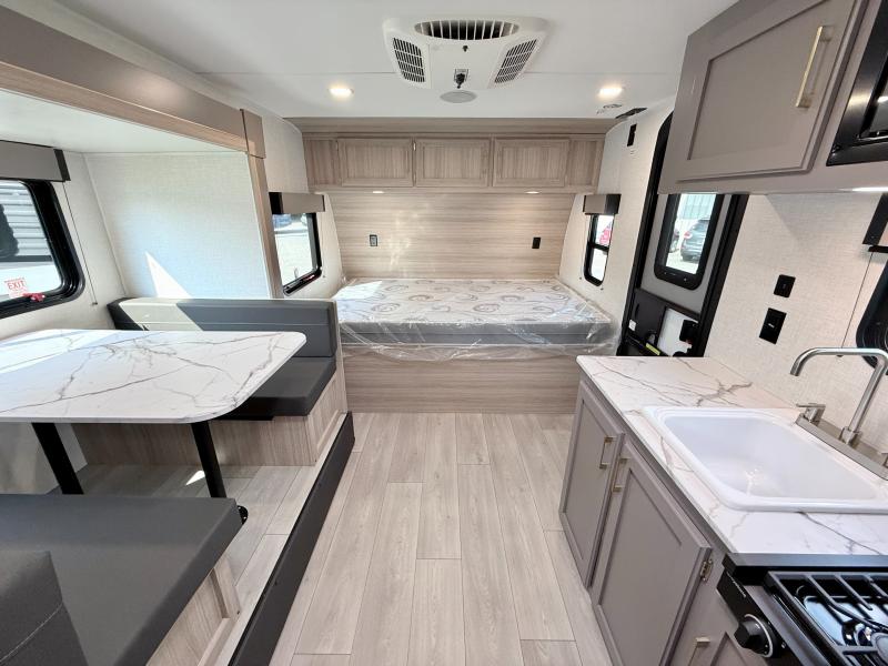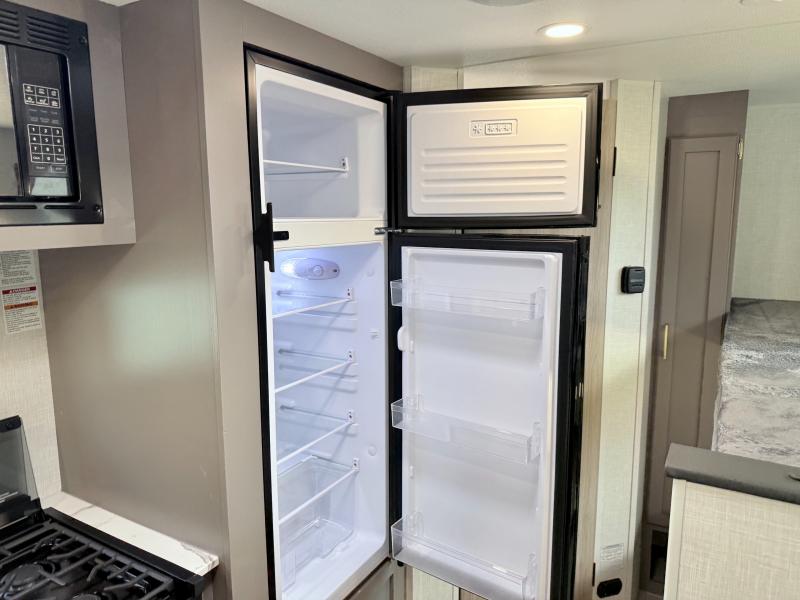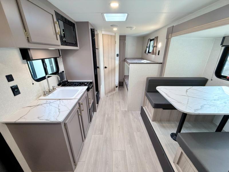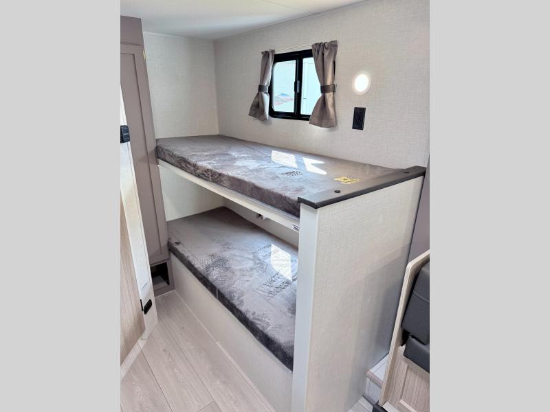 You can easily sleep five with this travel trailer thanks to the bunk beds, the front bed, and the booth dinette slide out. Whip up breakfast on the two burner cooktop with a glass cover, or use the convenient microwave oven. The 8 cu. ft. 12V refrigerator will store your perishables, and the single bowl sink allows you to keep everything clean. Start camping today with this cozy travel trailer!