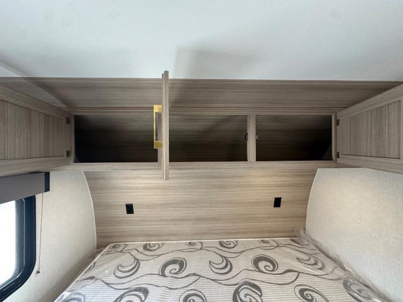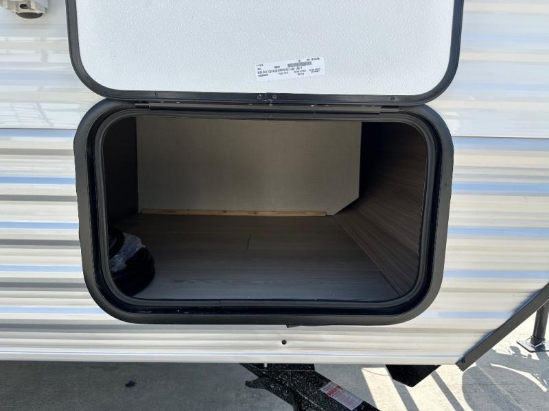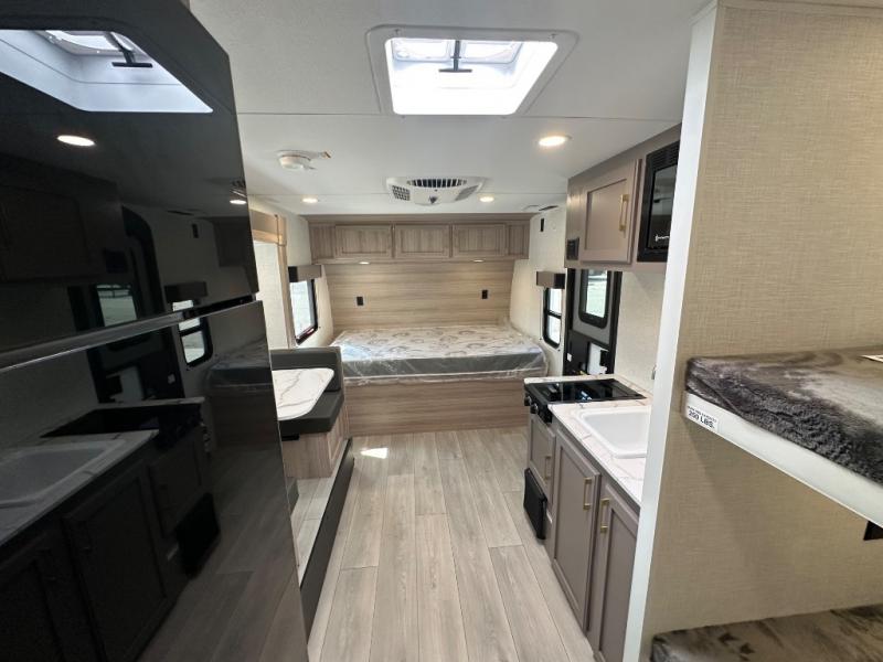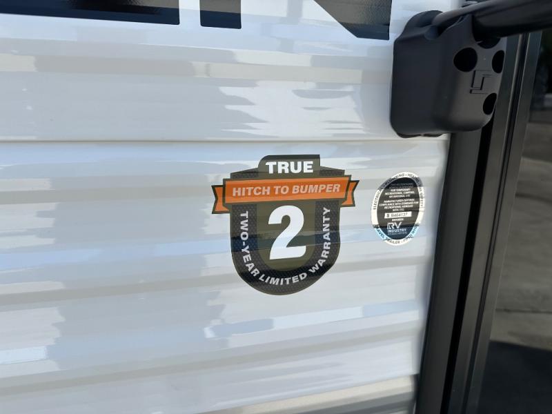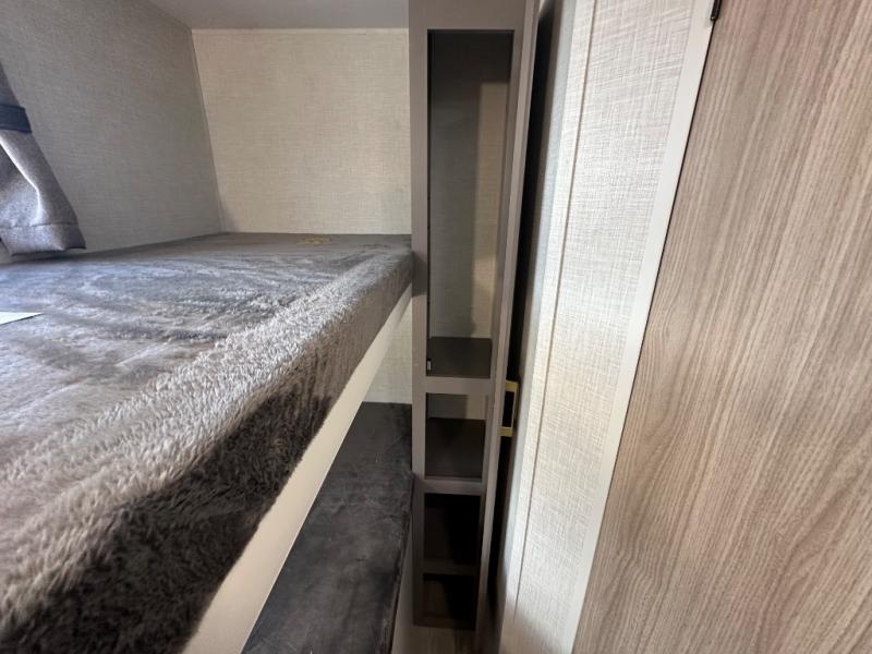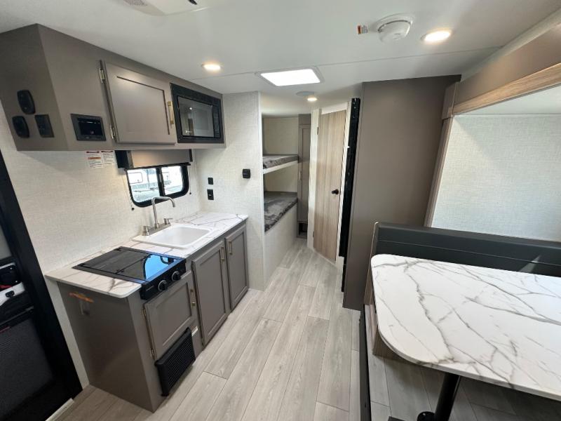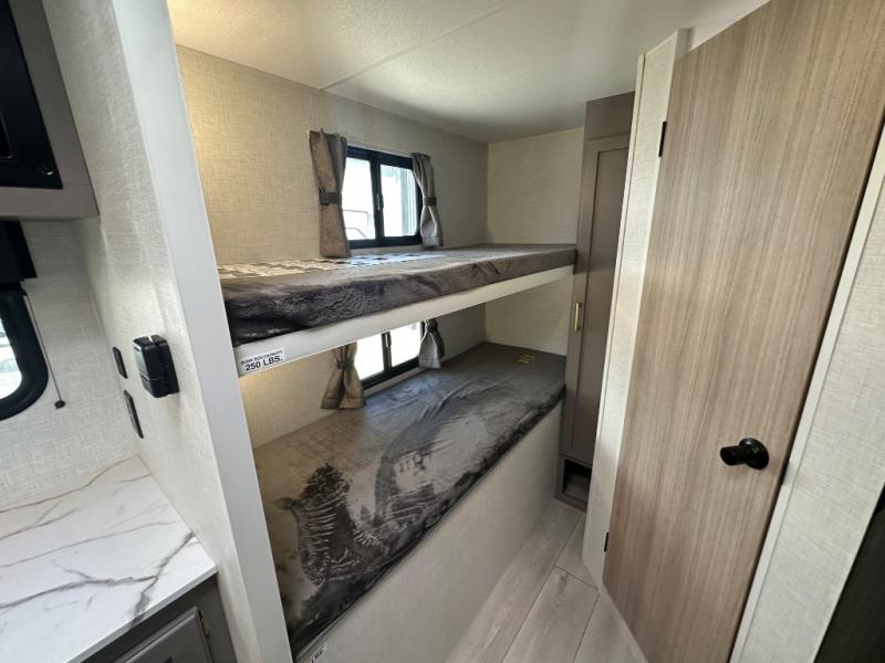 You're going to love camping in this spacious travel trailer that can sleep five people each night. When you arrive at your destination, set up the 14' power awning and start lunch on the outside kitchen with a griddle. The little ones will love the bunk beds, and you will have the front queen bed all to yourselves. This model also includes a full bath that will allow you to stay clean!