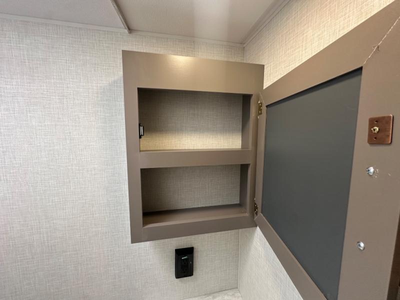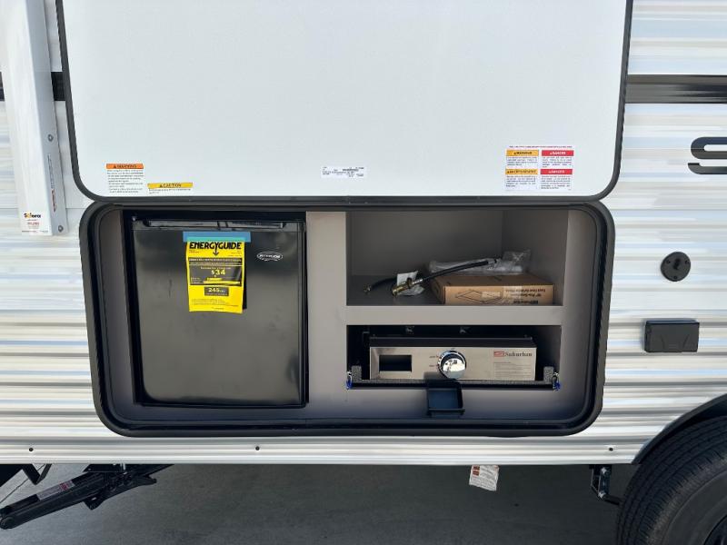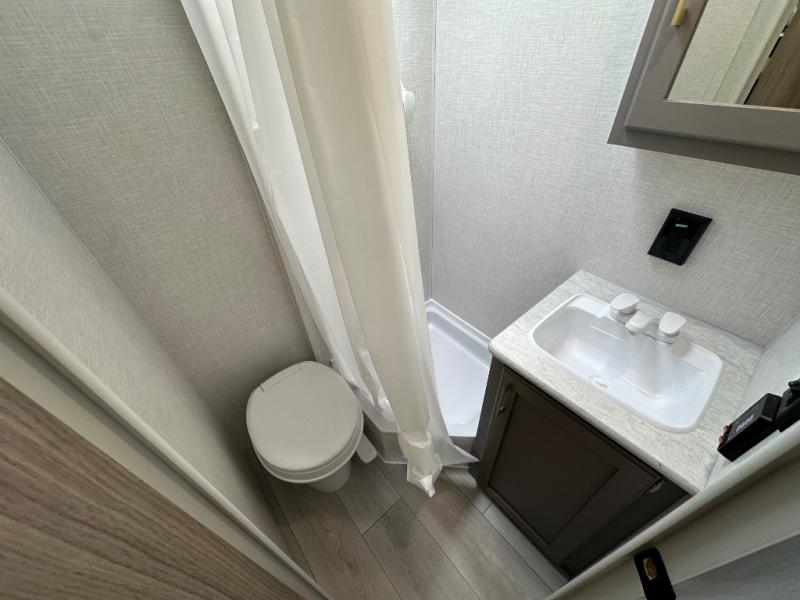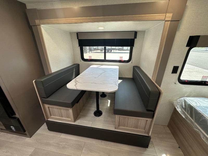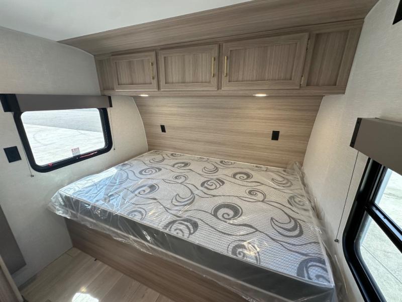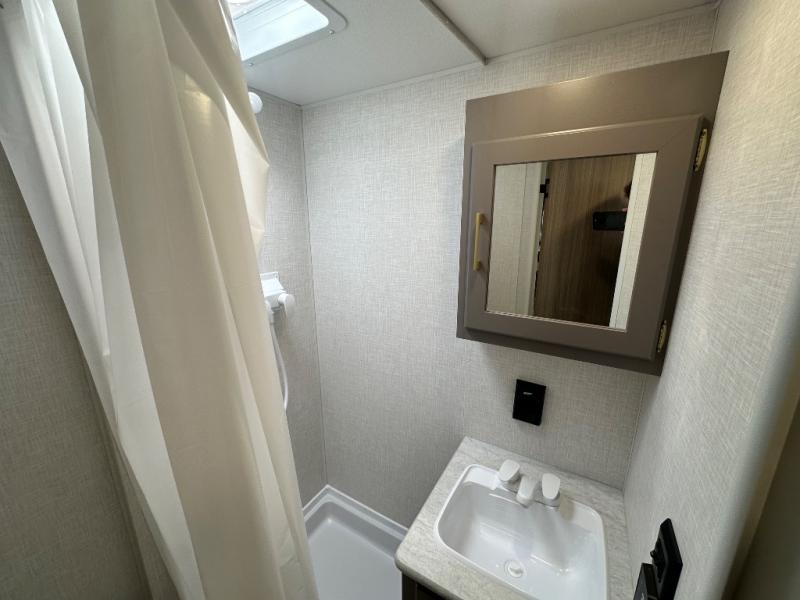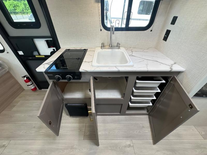You're going to love camping in this spacious travel trailer that can sleep five people each night. When you arrive at your destination, set up the 14' power awning and start lunch on the outside kitchen with a griddle. The little ones will love the bunk beds, and you will have the front queen bed all to yourselves. This model also includes a full bath that will allow you to stay clean!