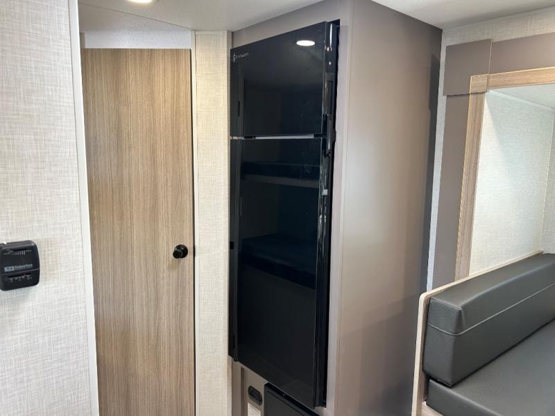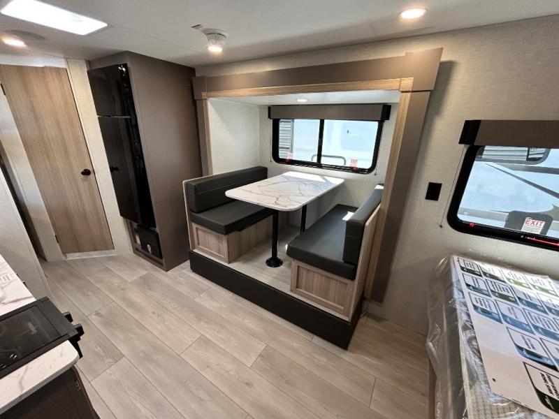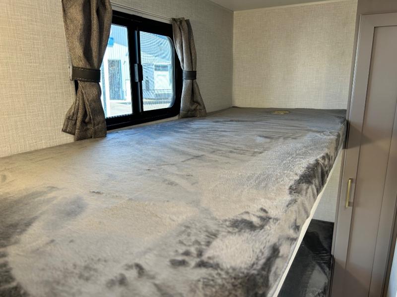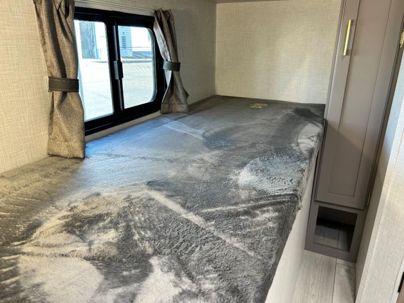 You're going to love camping in this spacious travel trailer that can sleep five people each night. When you arrive at your destination, set up the 14' power awning and start lunch on the outside kitchen with a griddle. The little ones will love the bunk beds, and you will have the front queen bed all to yourselves. This model also includes a full bath that will allow you to stay clean!