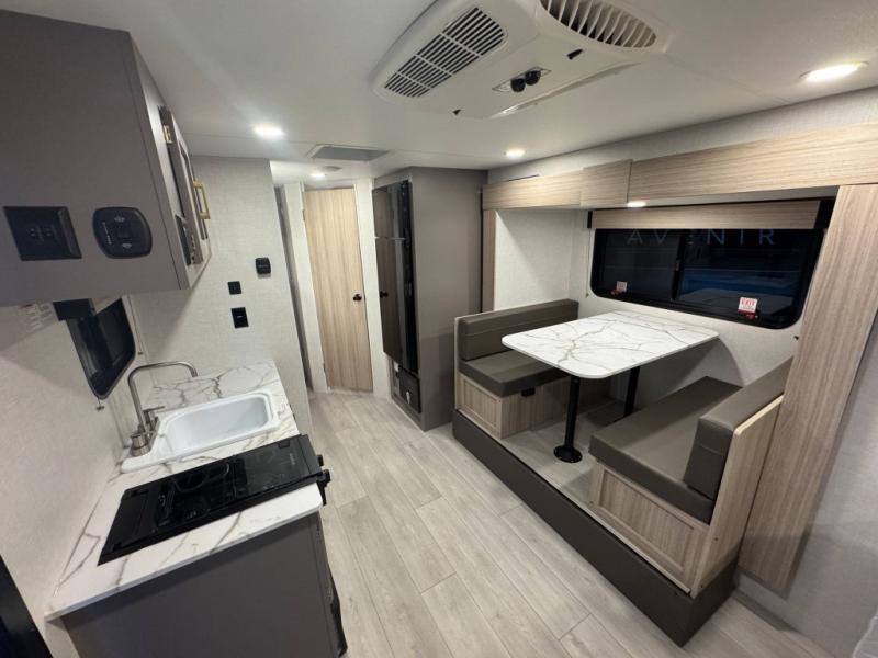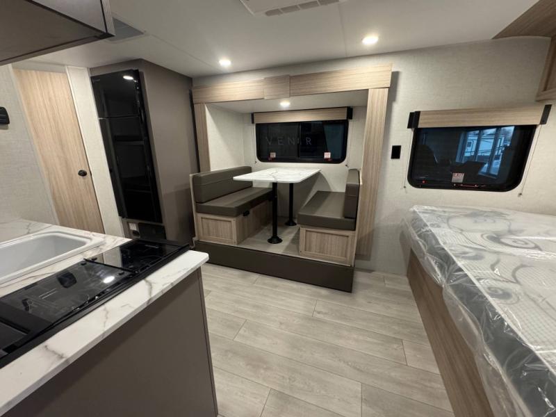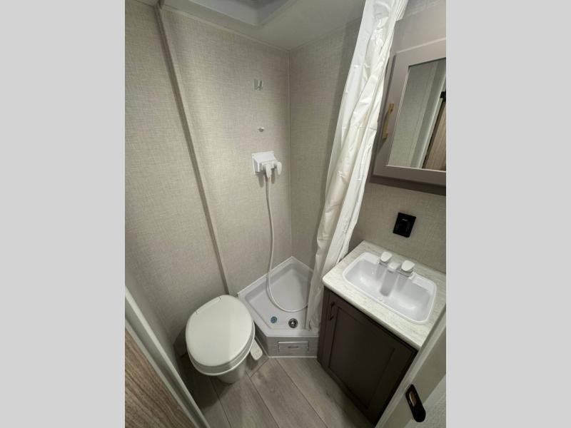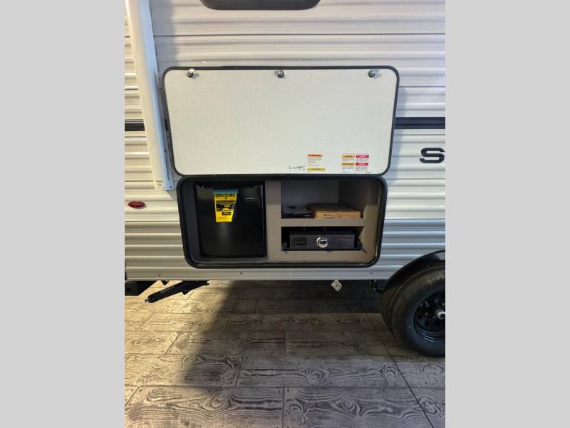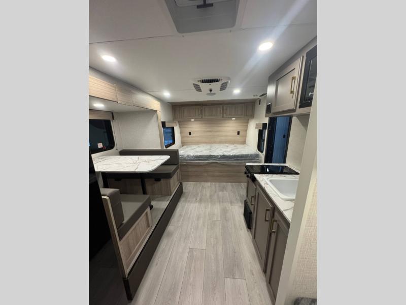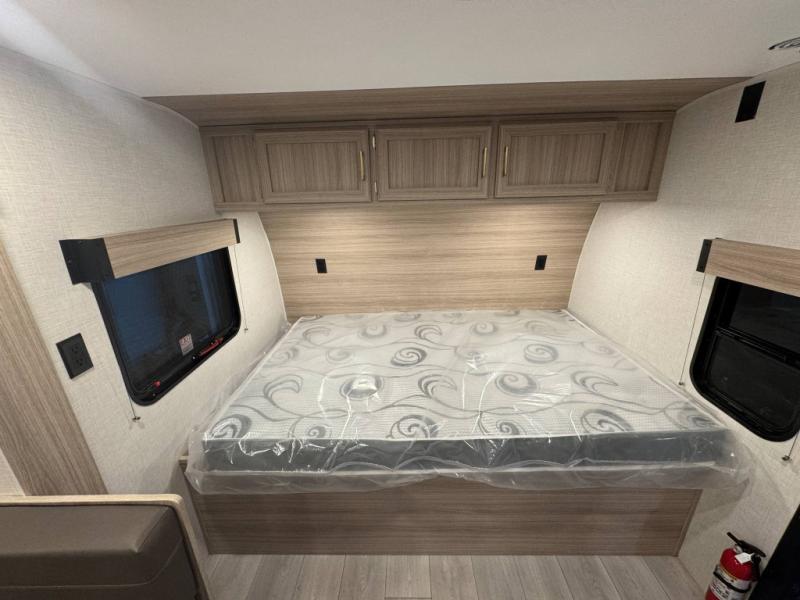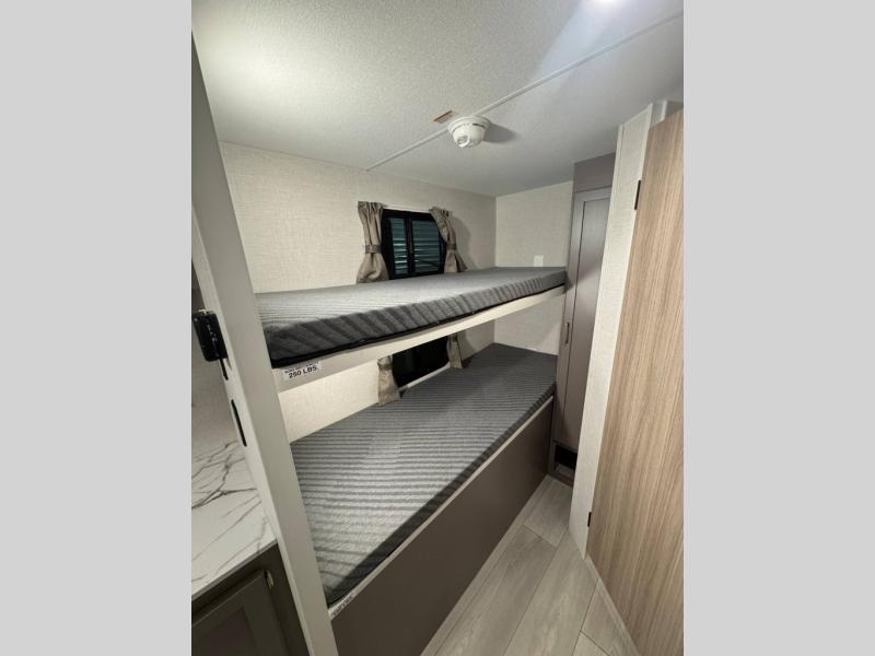 You're going to love camping in this spacious travel trailer that can sleep five people each night. When you arrive at your destination, set up the 14' power awning and start lunch on the outside kitchen with a griddle. The little ones will love the bunk beds, and you will have the front queen bed all to yourselves. This model also includes a full bath that will allow you to stay clean!