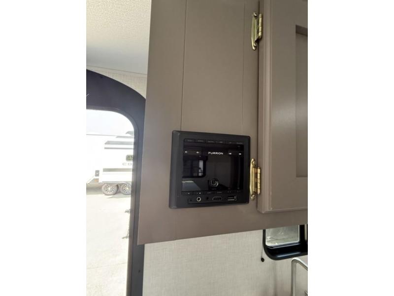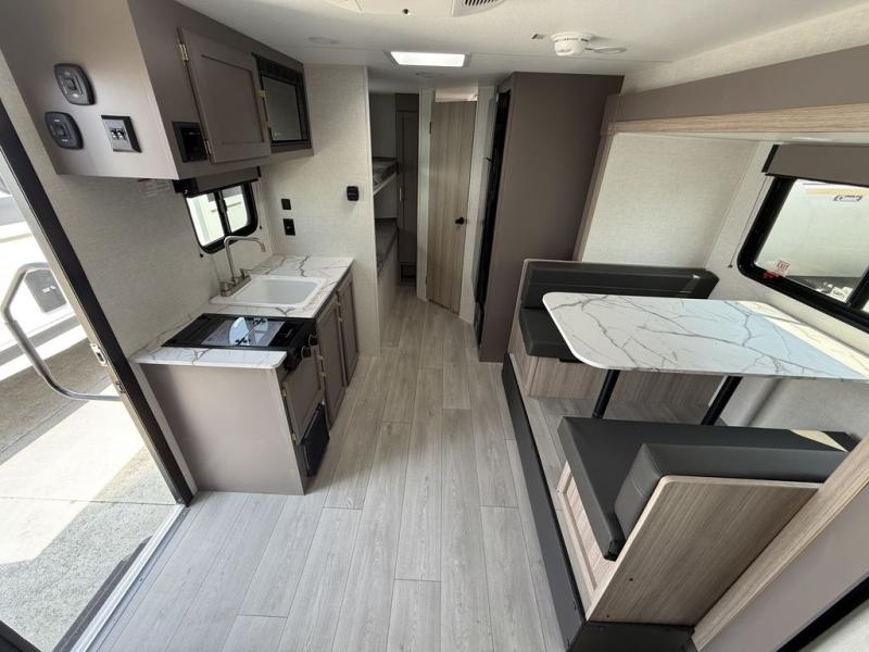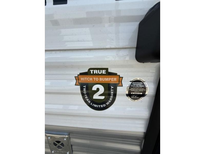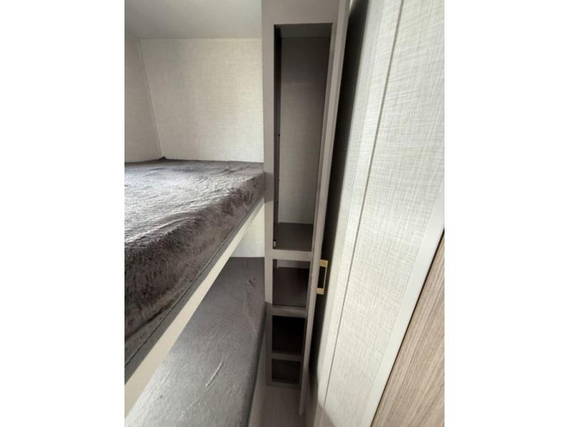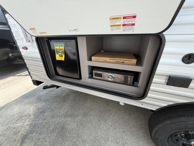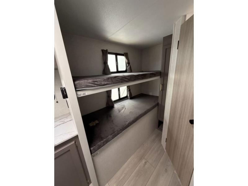 You're going to love camping in this spacious travel trailer that can sleep five people each night. When you arrive at your destination, set up the 14' power awning and start lunch on the outside kitchen with a griddle. The little ones will love the bunk beds, and you will have the front queen bed all to yourselves. This model also includes a full bath that will allow you to stay clean!