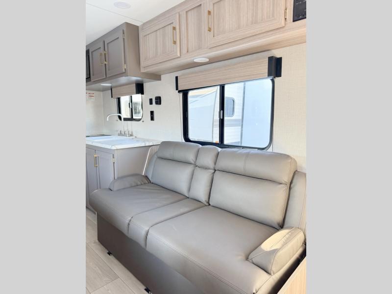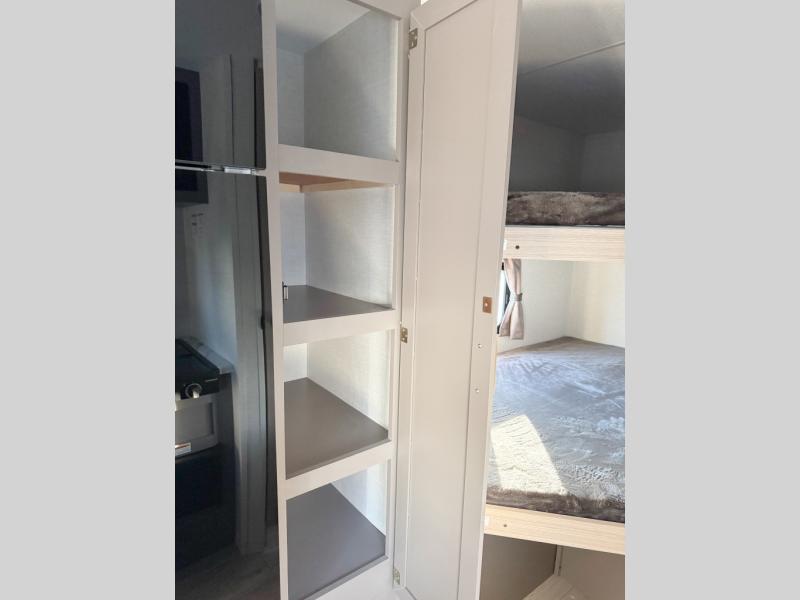 Double-size bunk beds provide ample space for kids or guests, while the front bed offers a cozy retreat for adults and nightstands add a touch of home. The full bathroom is equipped with everything you need to start your day feeling refreshed. The kitchen features an 8 cu refrigerator, two-burner cooktop, and sink, making meal prep easy. Plus, the pantry provides storage for your favorite snacks and ingredients. The jacknife sofa and booth dinette offer comfortable seating for meals, games, or movie nights.