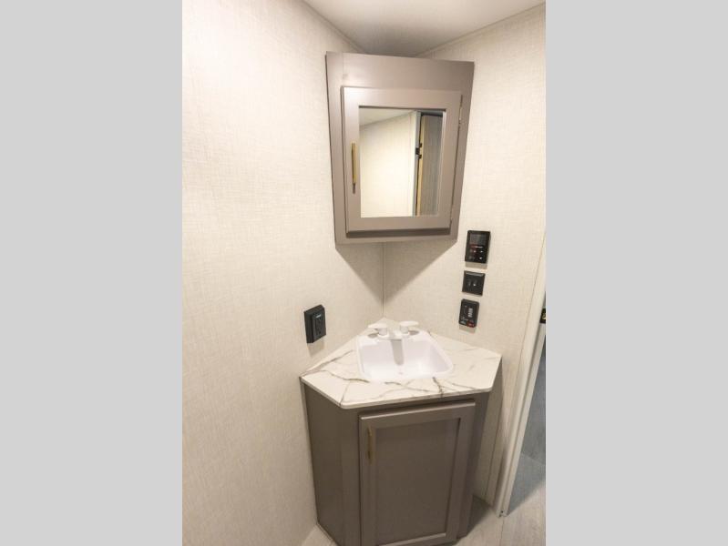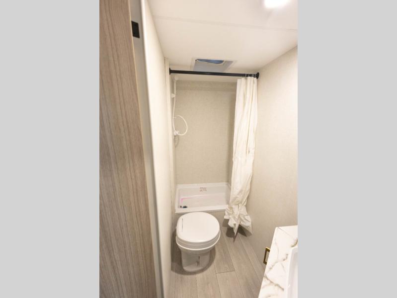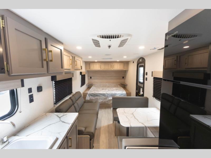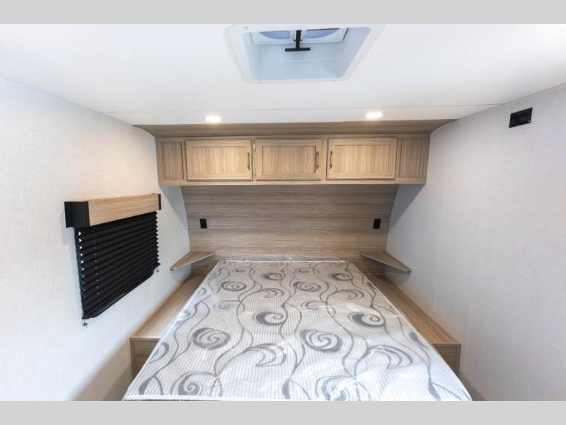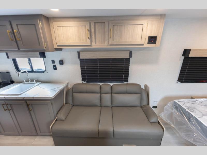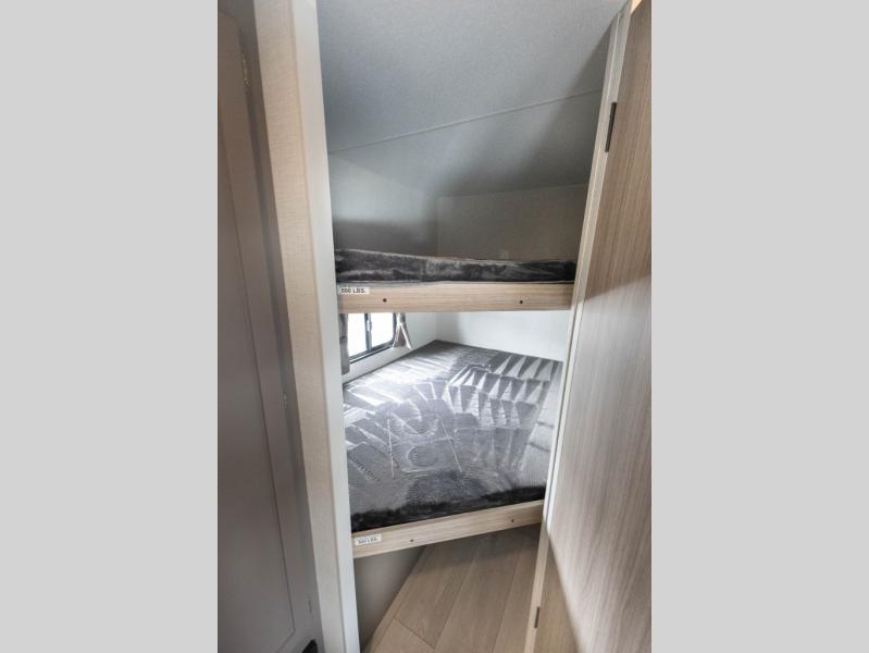 Double-size bunk beds provide ample space for kids or guests, while the front bed offers a cozy retreat for adults and nightstands add a touch of home. The full bathroom is equipped with everything you need to start your day feeling refreshed. The kitchen features an 8 cu refrigerator, two-burner cooktop, and sink, making meal prep easy. Plus, the pantry provides storage for your favorite snacks and ingredients. The jacknife sofa and booth dinette offer comfortable seating for meals, games, or movie nights.